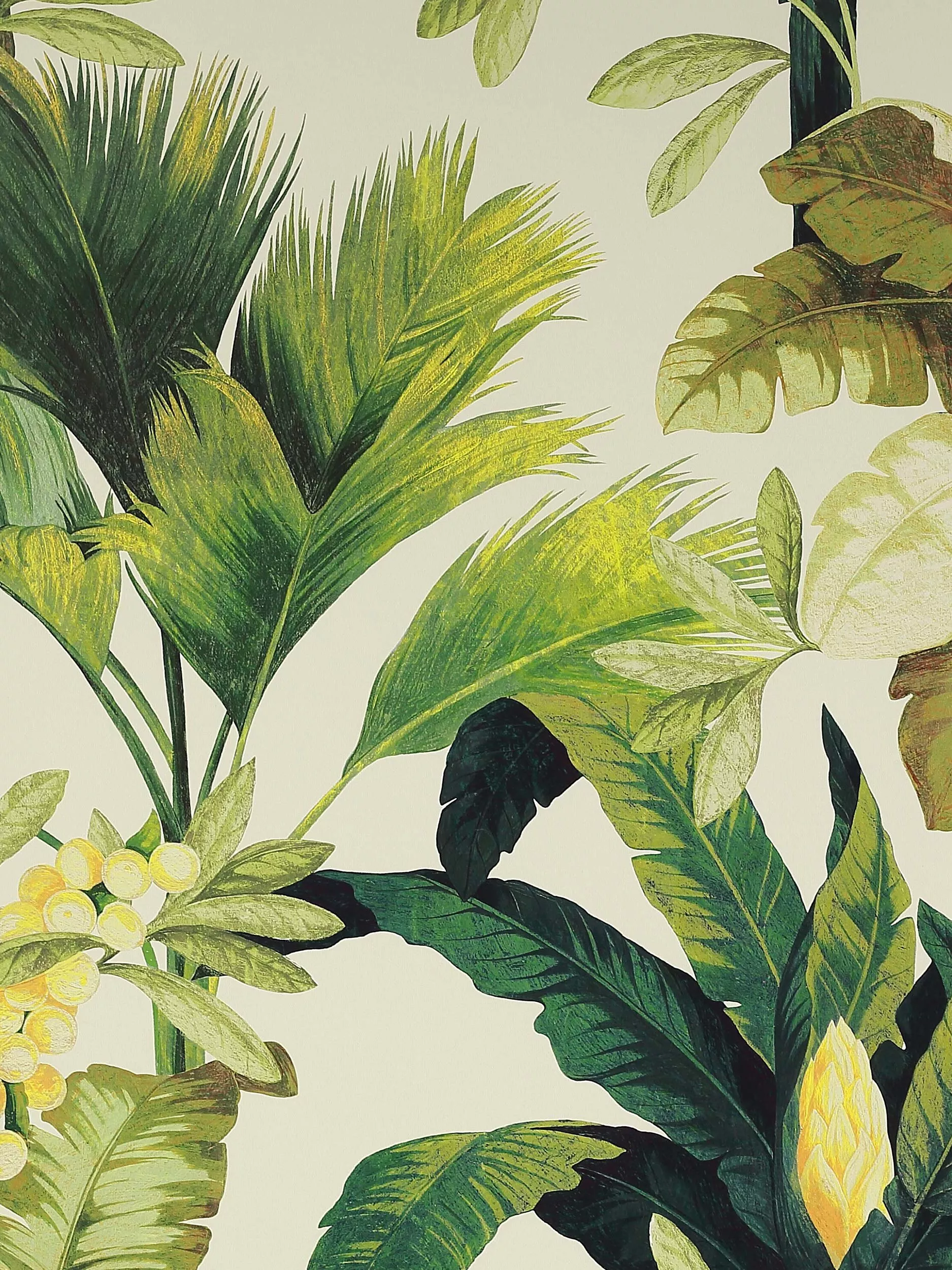 Created in ink wash and pastel, this exotic design transports us into a luxuriant palm grove, a sophisticated large-scale pictorial representation.