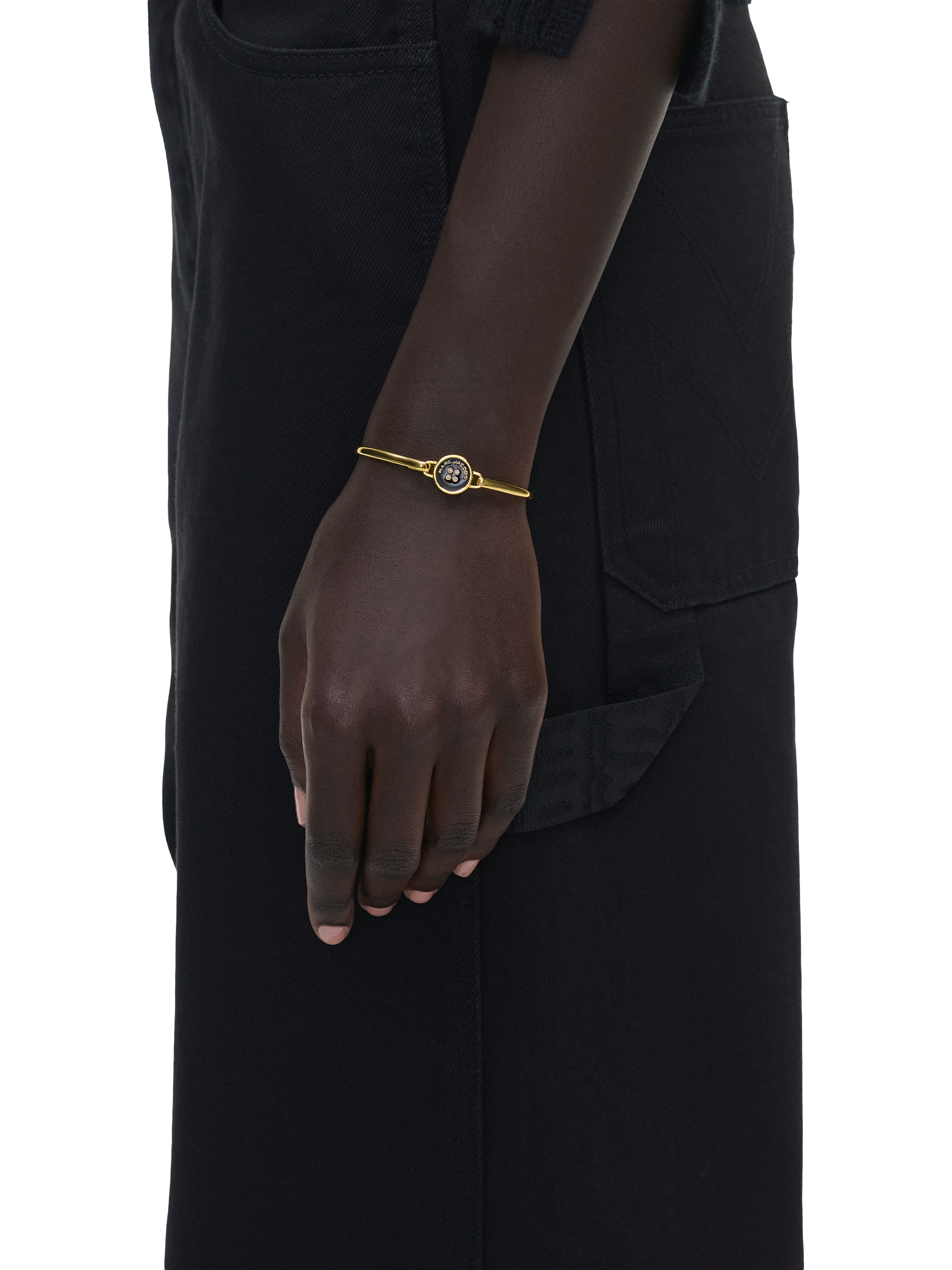 Inspired by Marc's love of trims and detailing, this necklace features a hand-painted enamel button adorned with glass crystal accents and signature logo branding.
