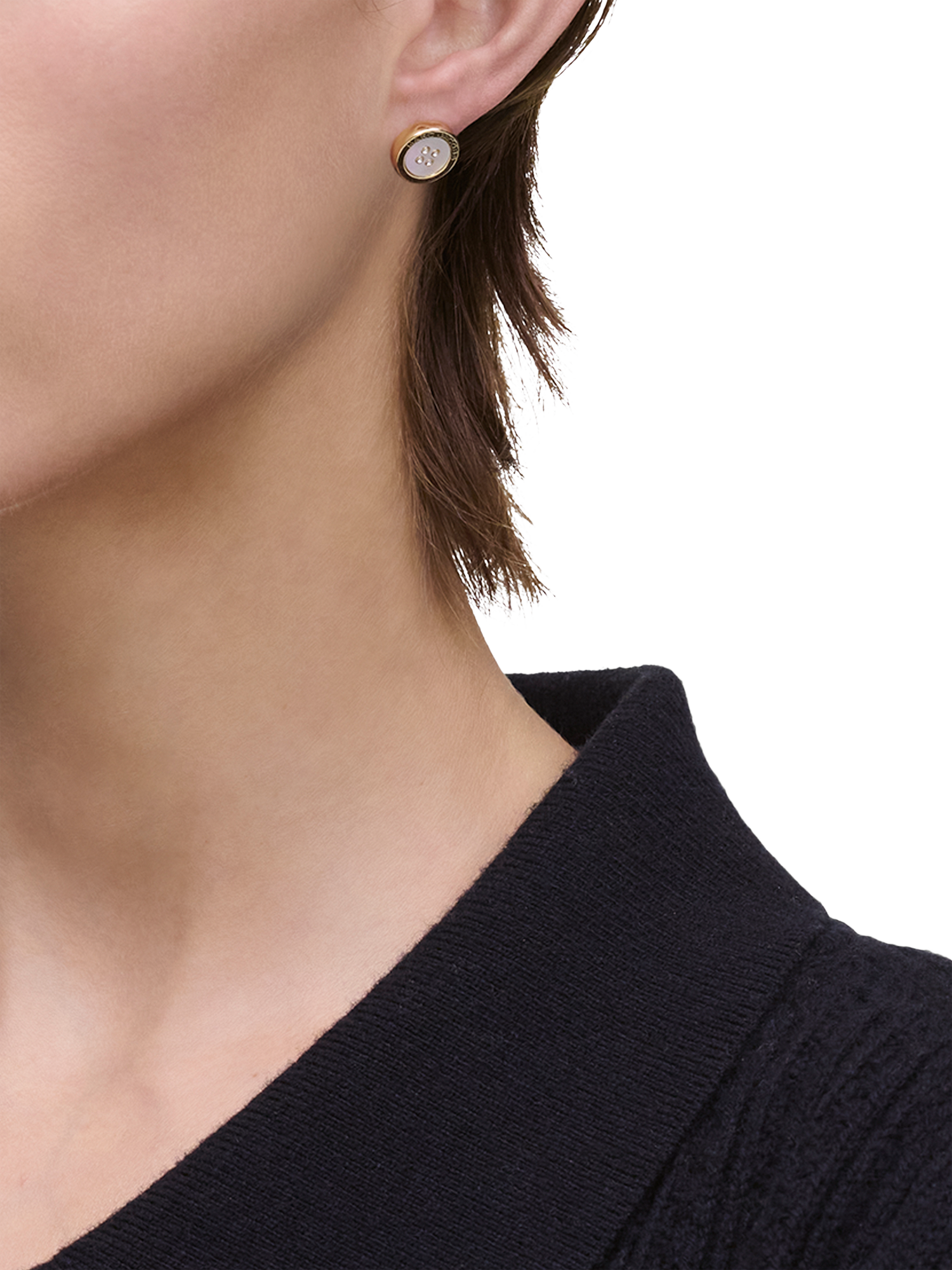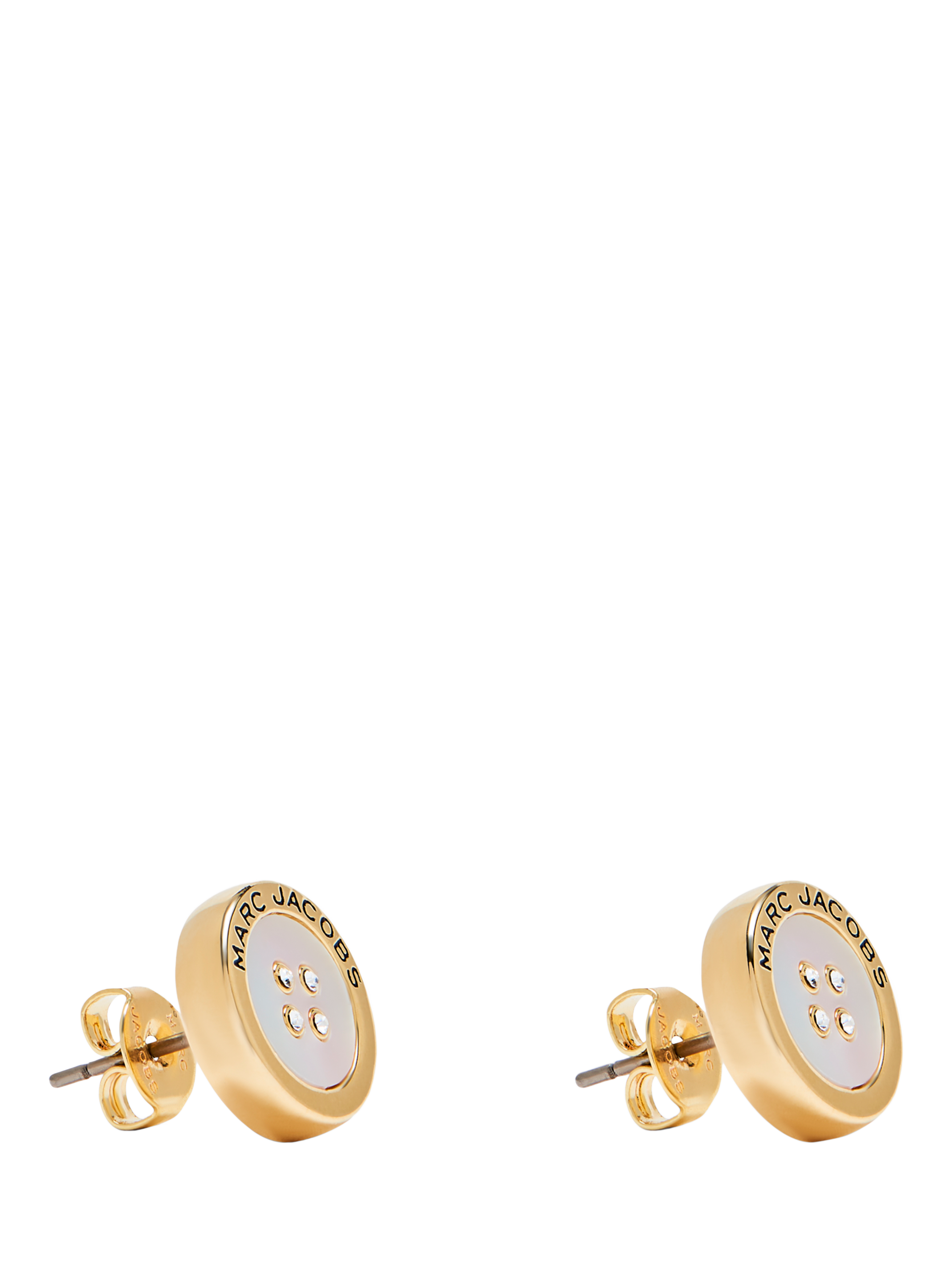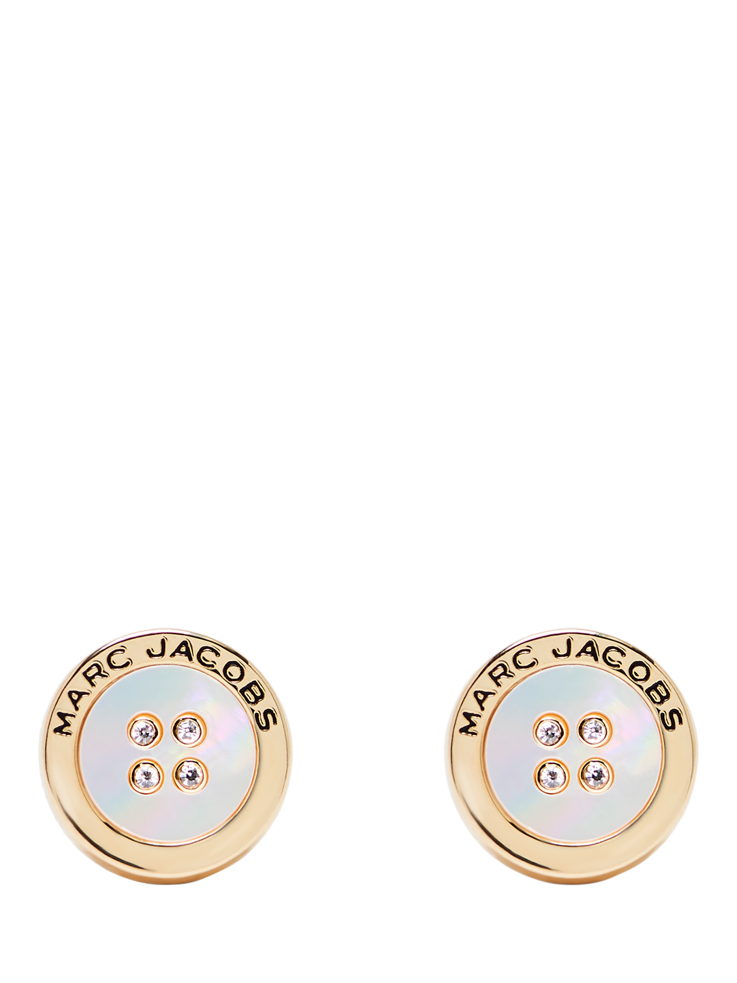 Inspired by Marc's love of trims and detailing, these earrings feature hand-painted enamel or mother of pearl buttons adorned with glass crystal accents and signature logo branding.