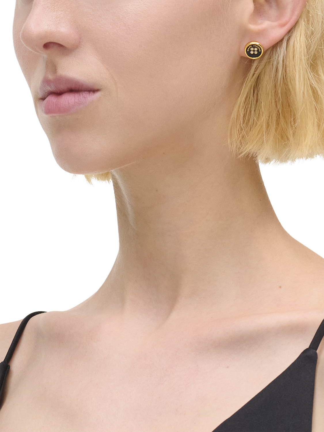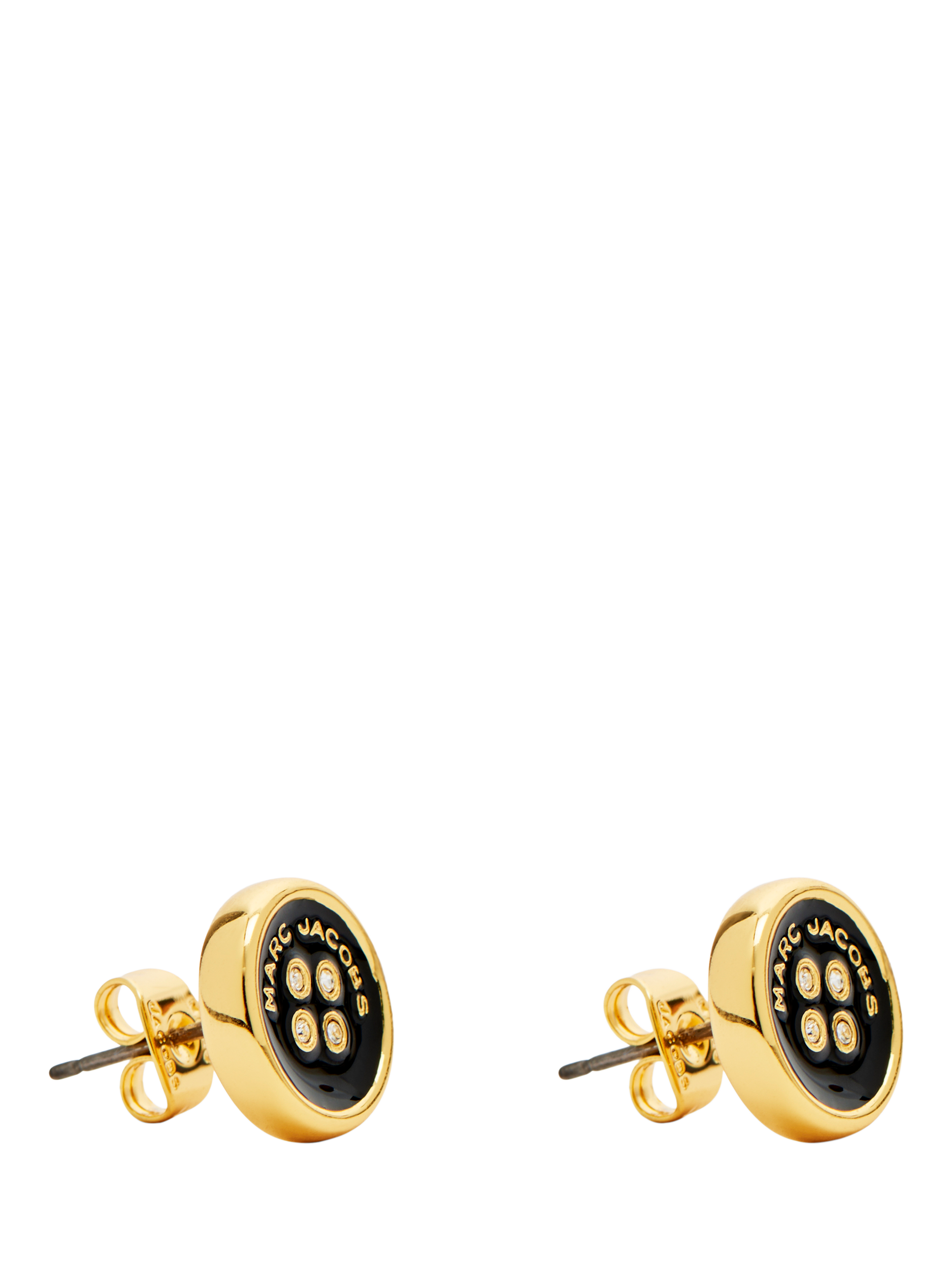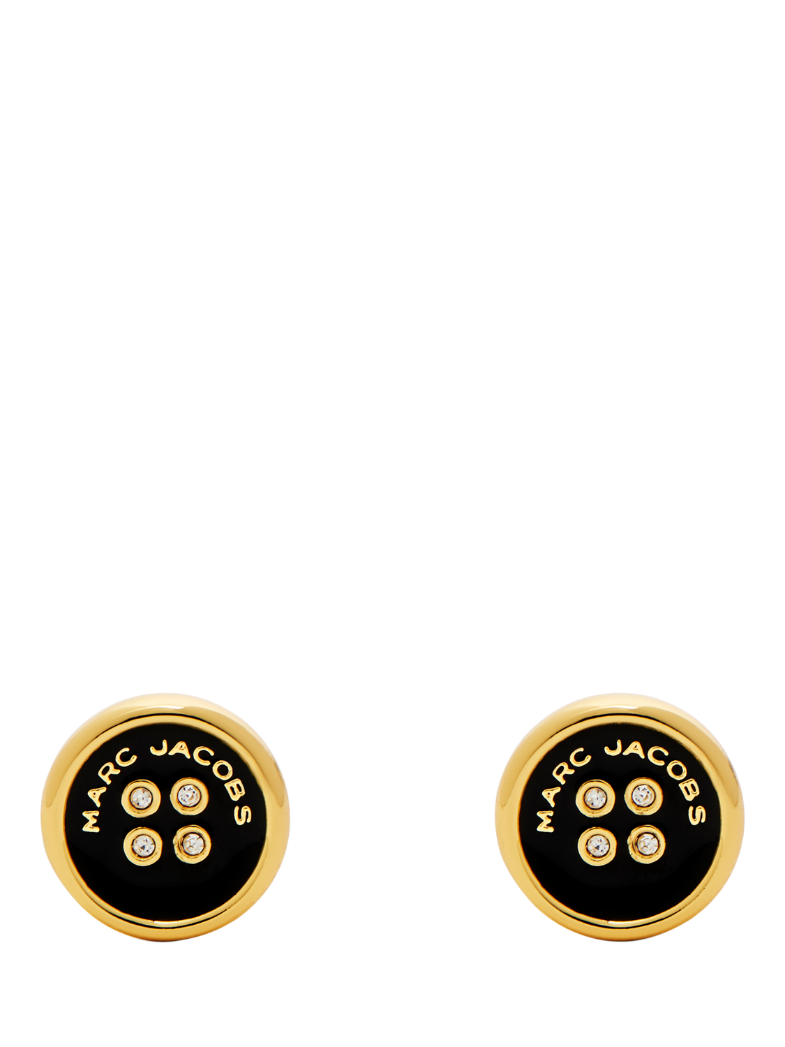 Inspired by Marc's love of trims and detailing, these earrings feature hand-painted enamel or mother of pearl buttons adorned with glass crystal accents and signature logo branding.