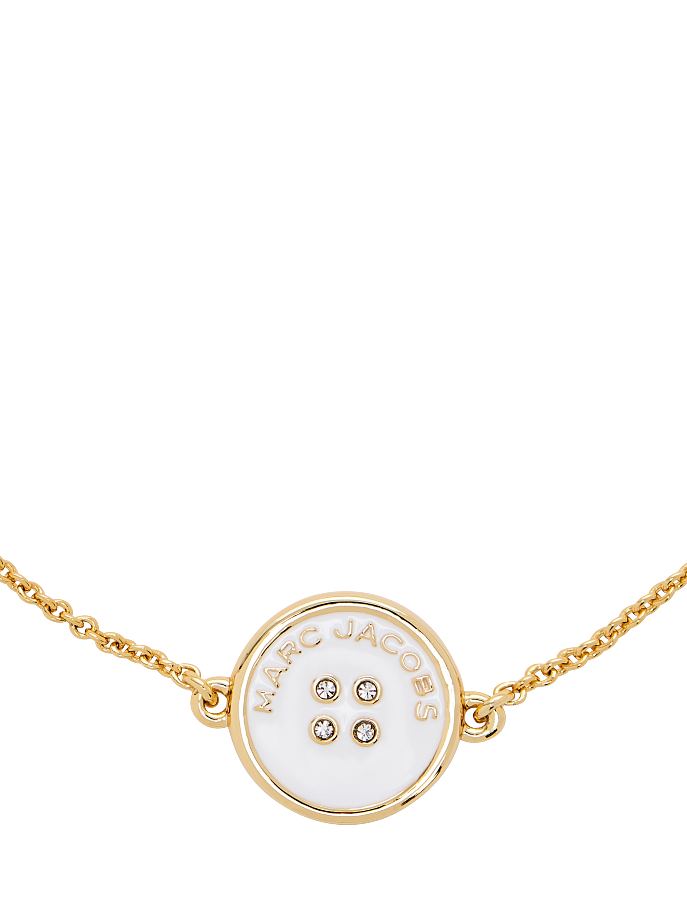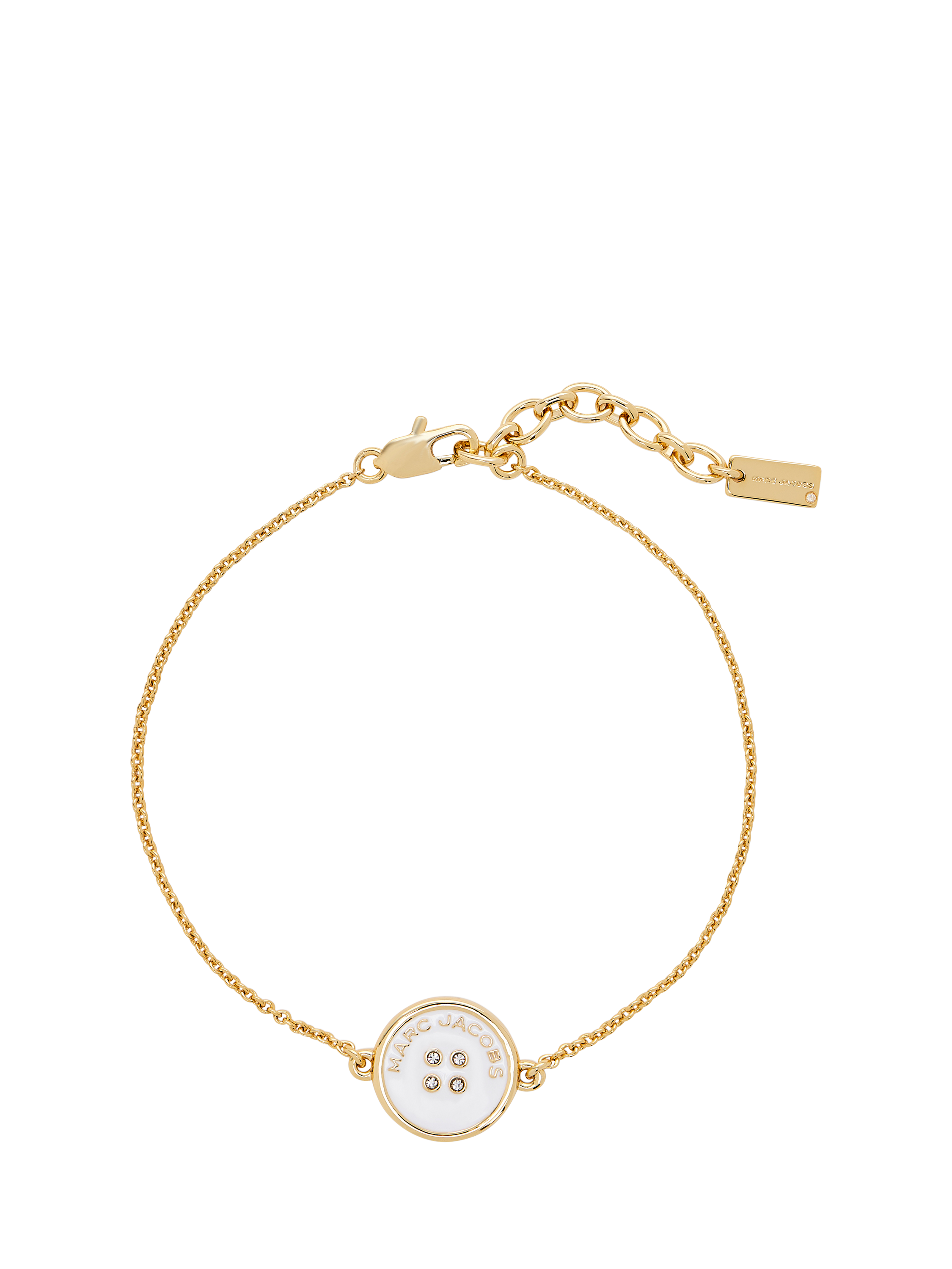 Inspired by Marc’s love of trims and detailing, this delicate yet durable chain bracelet features an enamel-painted button with sparkling glass stone accents. Finished with a lobster clasp for a personalised fit, it’s a playful, refined addition to any look.