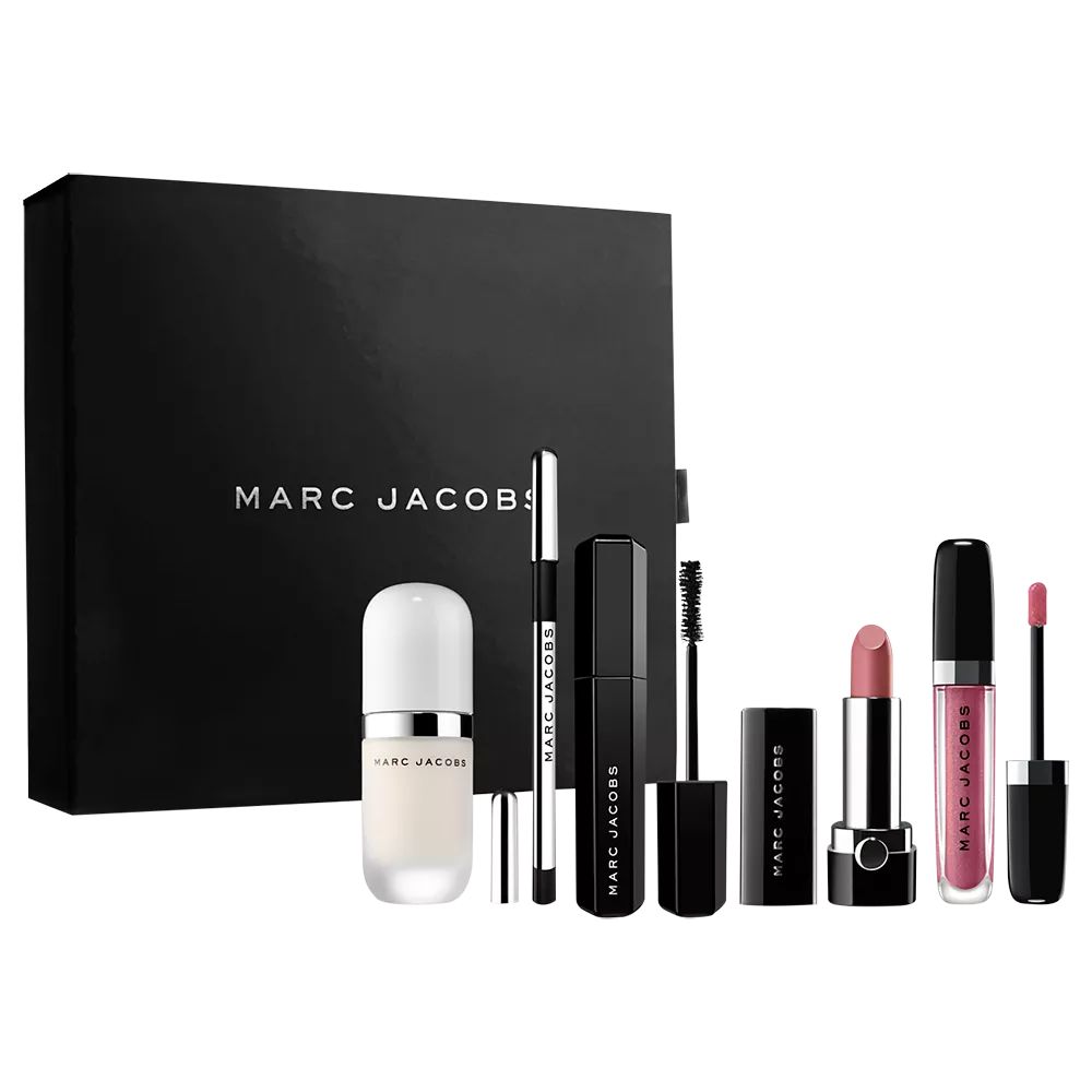 A five-piece set of Marc Jacobs Beauty bestsellers: hydrating primer, waterproof gel eyeliner, mega-volumising mascara, longwearing luxury lipstick and award-winning lip gloss.