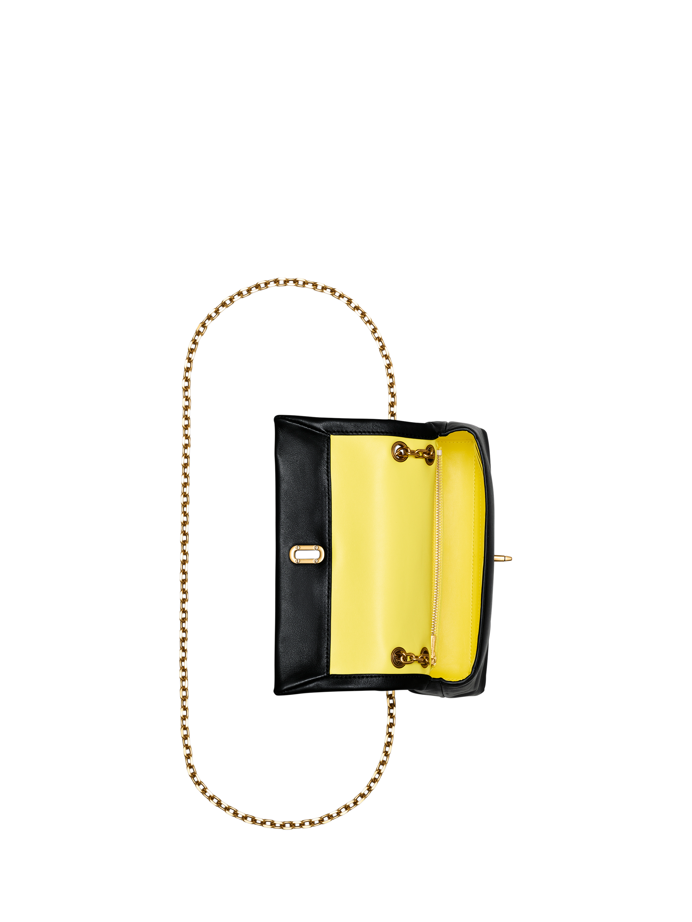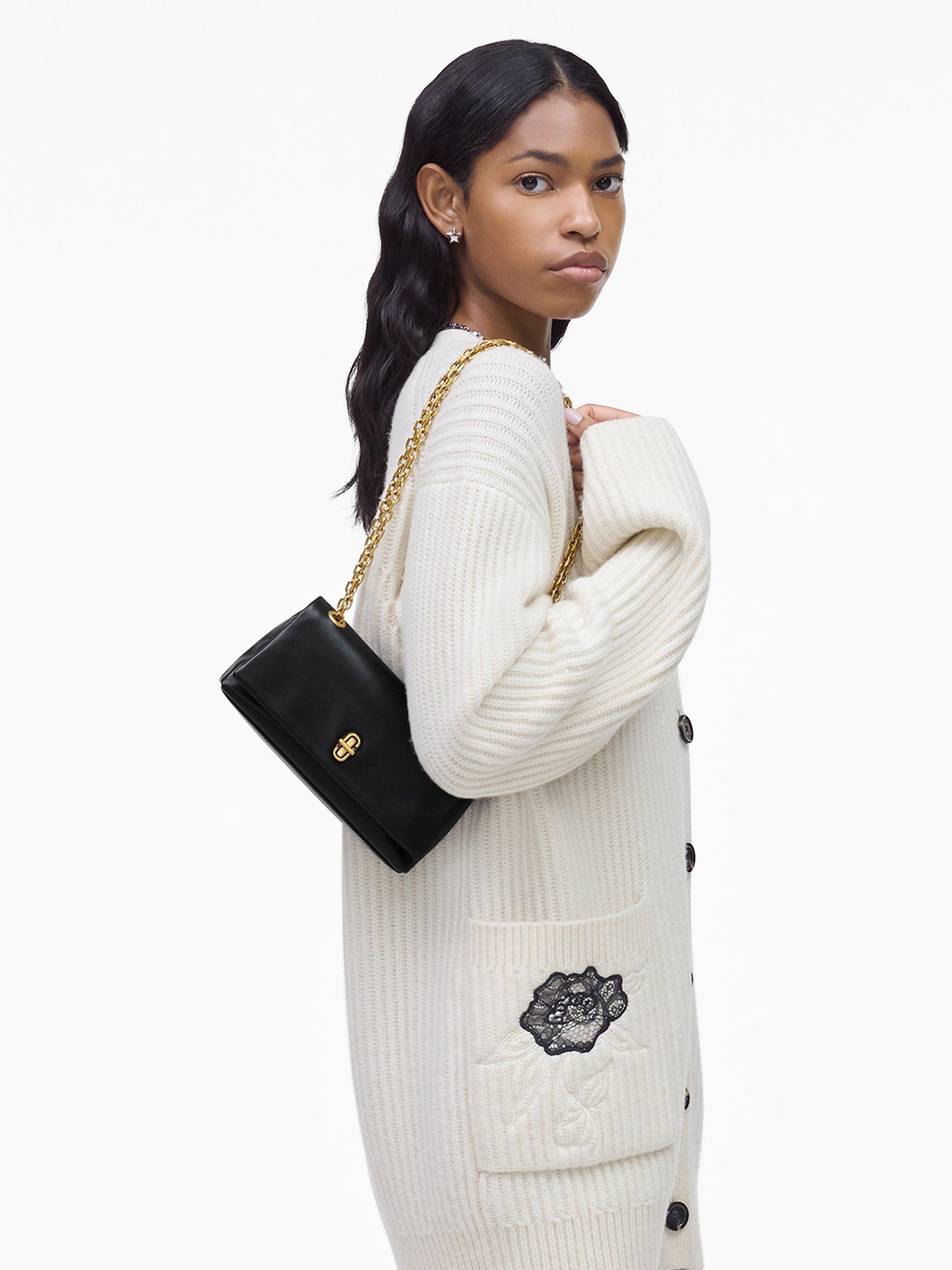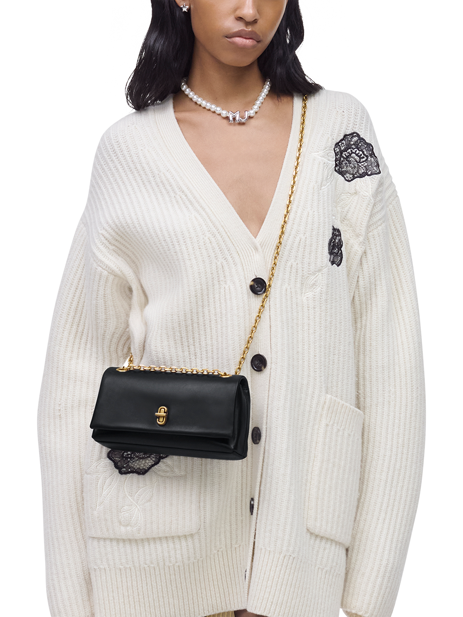 A sleek and elegant accessory inspired by the silhouette of Marc Jacobs' Dual collection. This high-style compact mini bag effortlessly stows your phone, credit cards, cash, keys and lipstick. Crafted in buttery smooth leather, The Dual Chain Mini Bag features an elevated J Marc turn-lock closure and a refined pull-through chain strap for over-the-shoulder or crossbody styling.