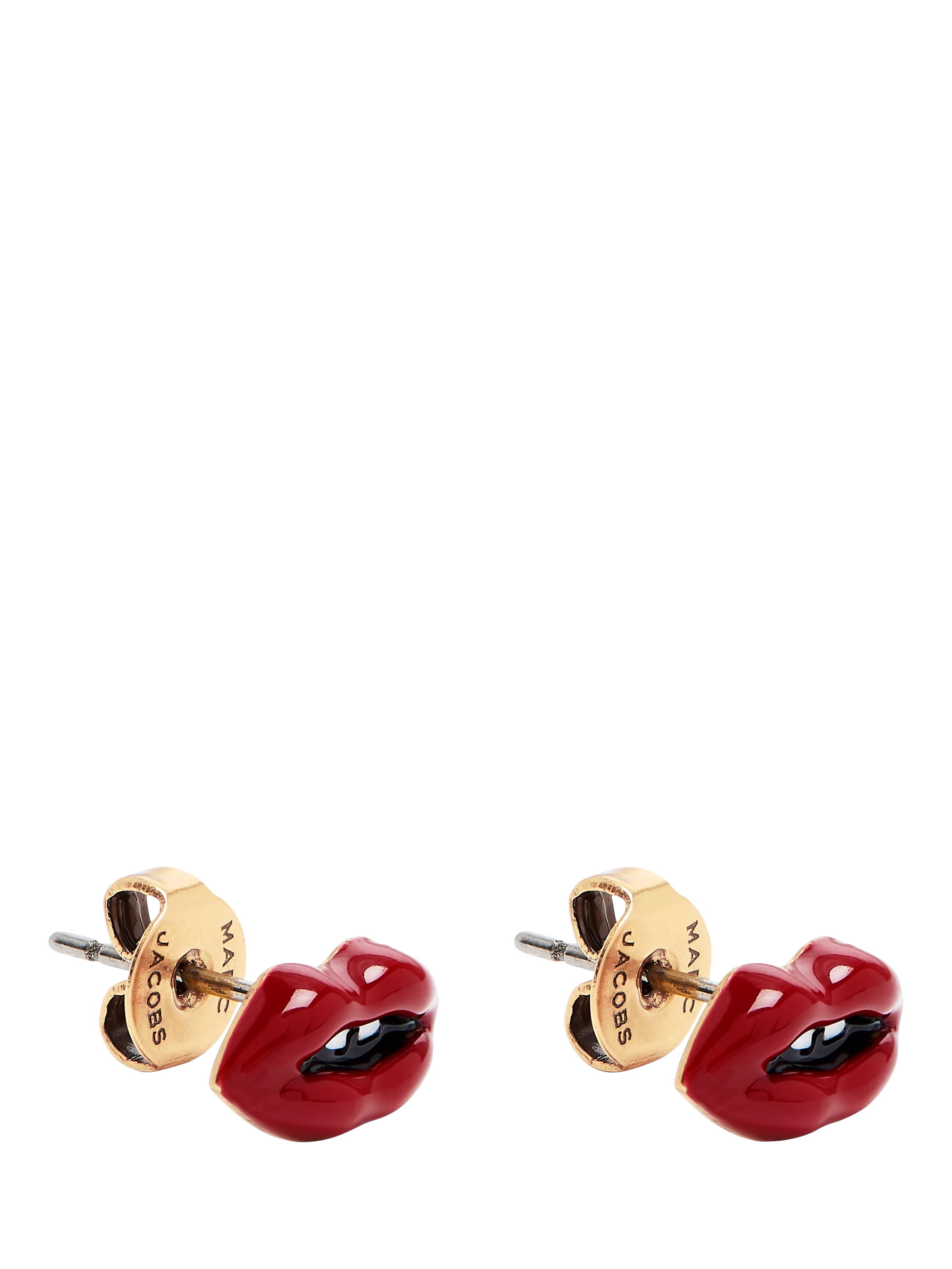 Tiny stud earrings showcasing playful enamel lips, sitting on gold-plated post fittings. Secured with a butterfly back and suitable for pierced ears only.