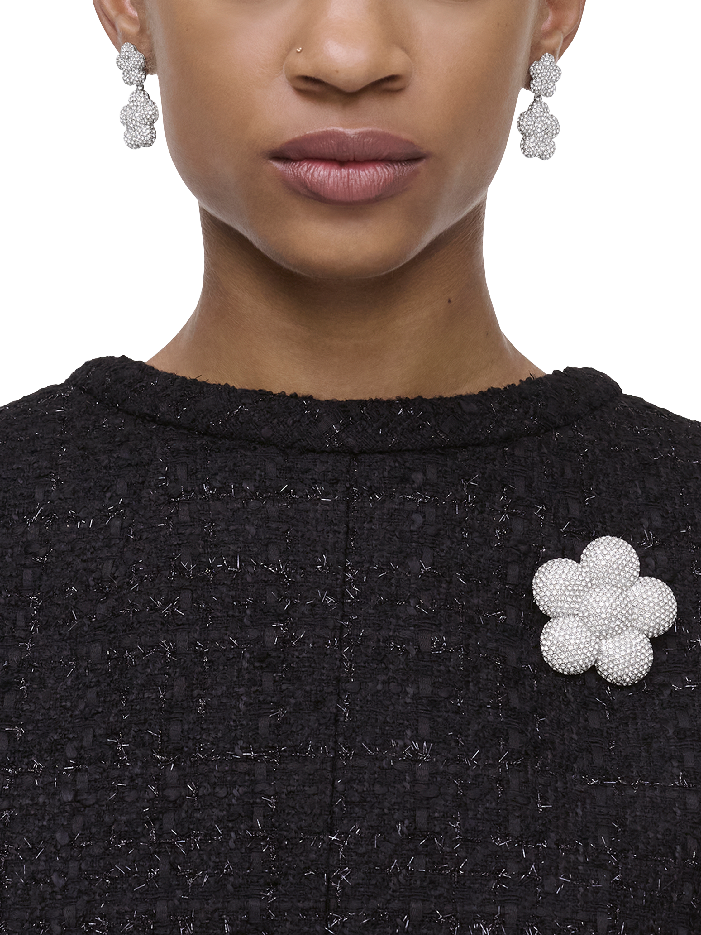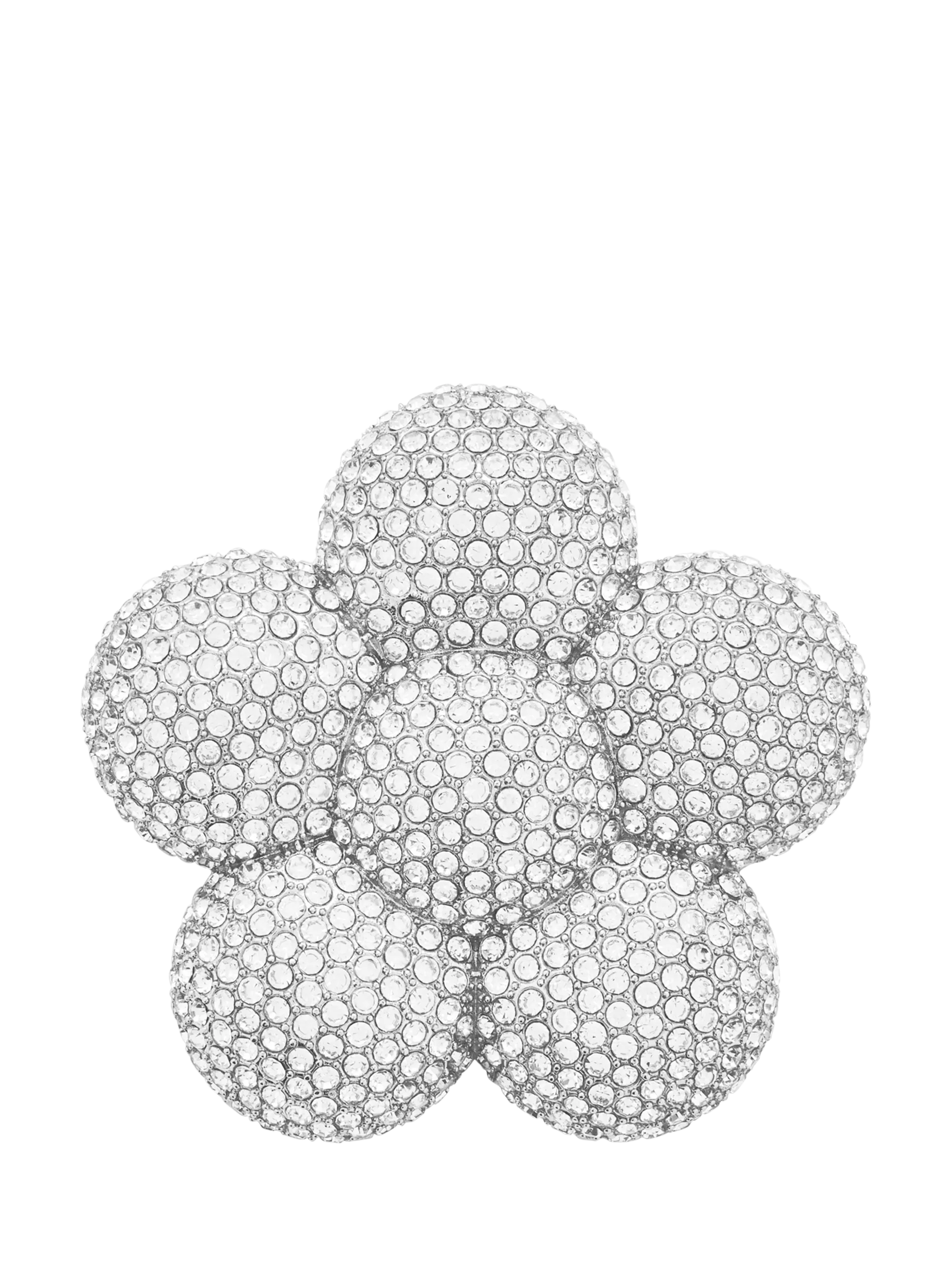 Artfully crafted and designed with runway proportions in mind, this pave-encrusted puffed daisy adornment features a metal pin-back with safety catch closure, dimensional rounded accents and all-over sparkling crystal embellishments for timeless and sophisticated styling.
