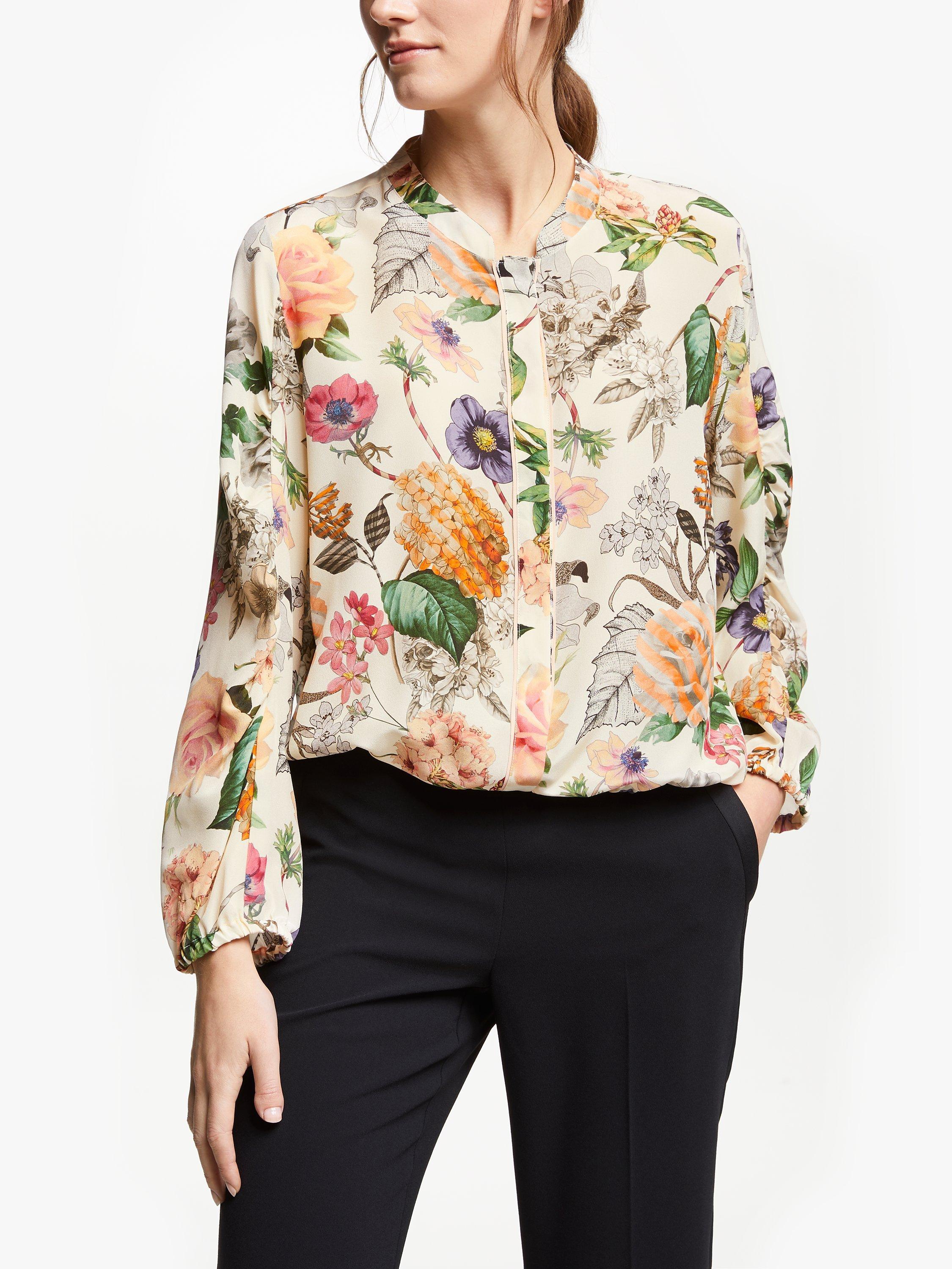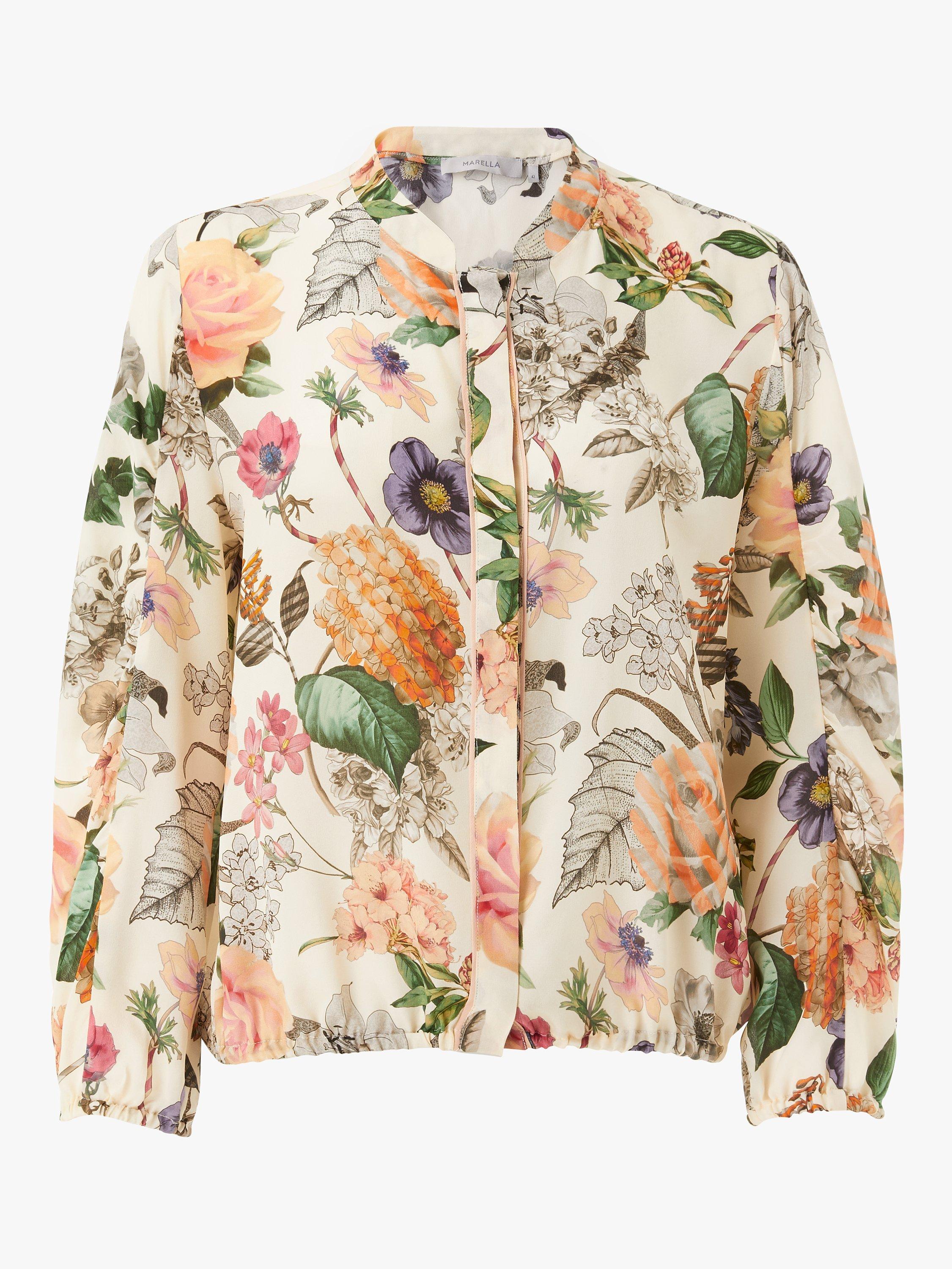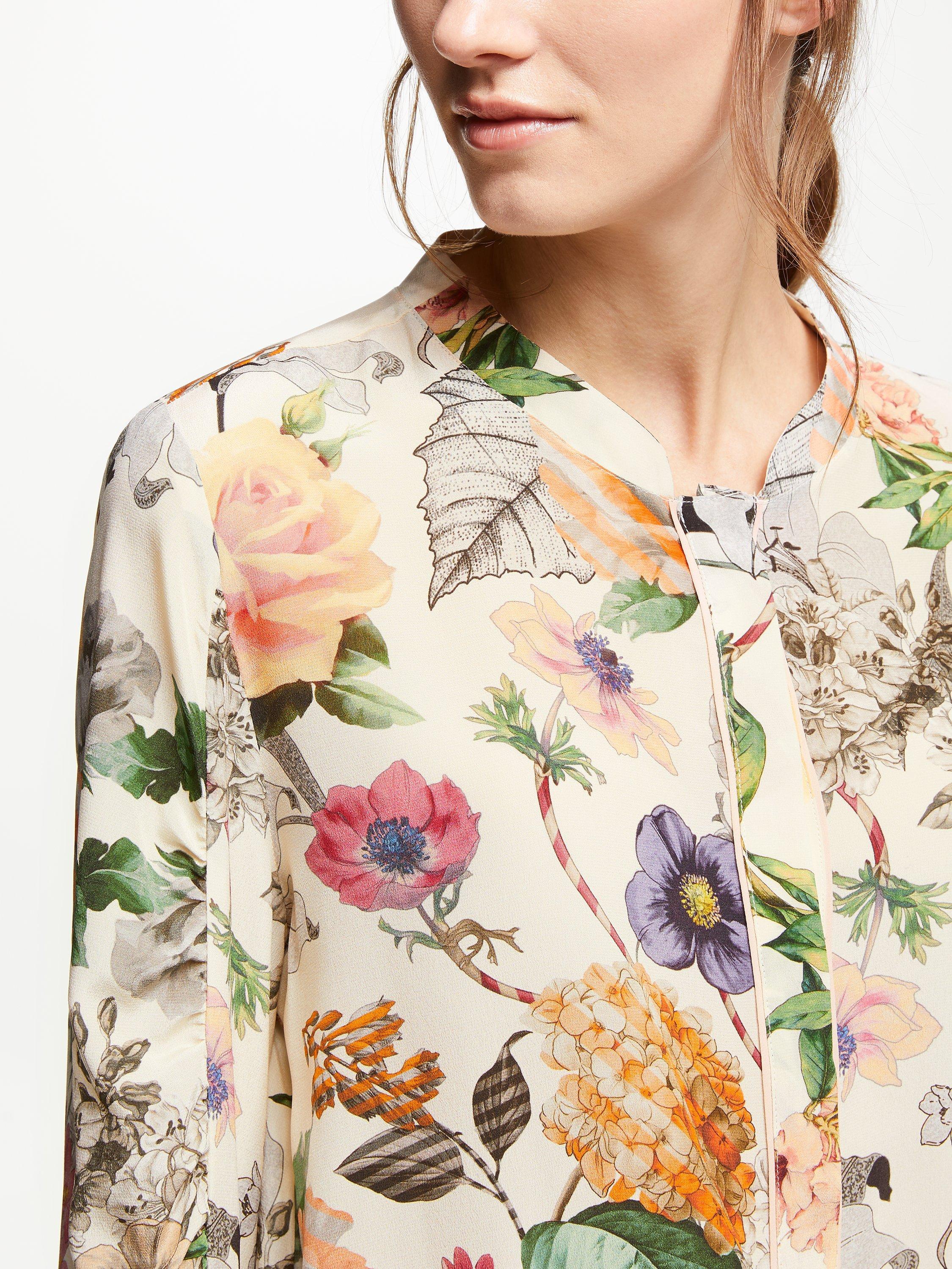 Made from soft silk, this top has a stunning floral print that will lend a statement finish to your look. In a blouson bomber style silhouette with gathered detail to the cuffs and hem, it is finished with a neat mandarin collar and concealed front placket.