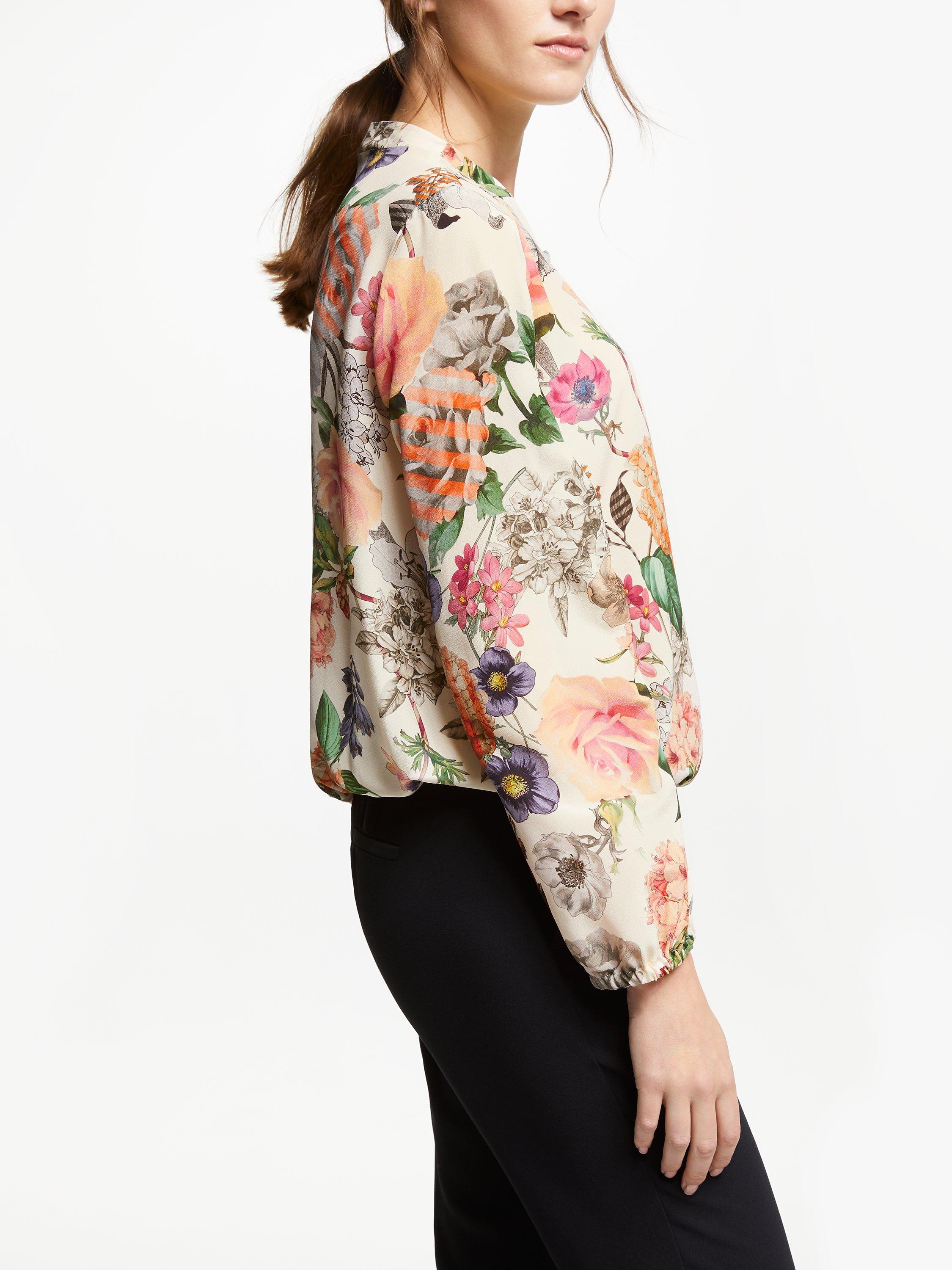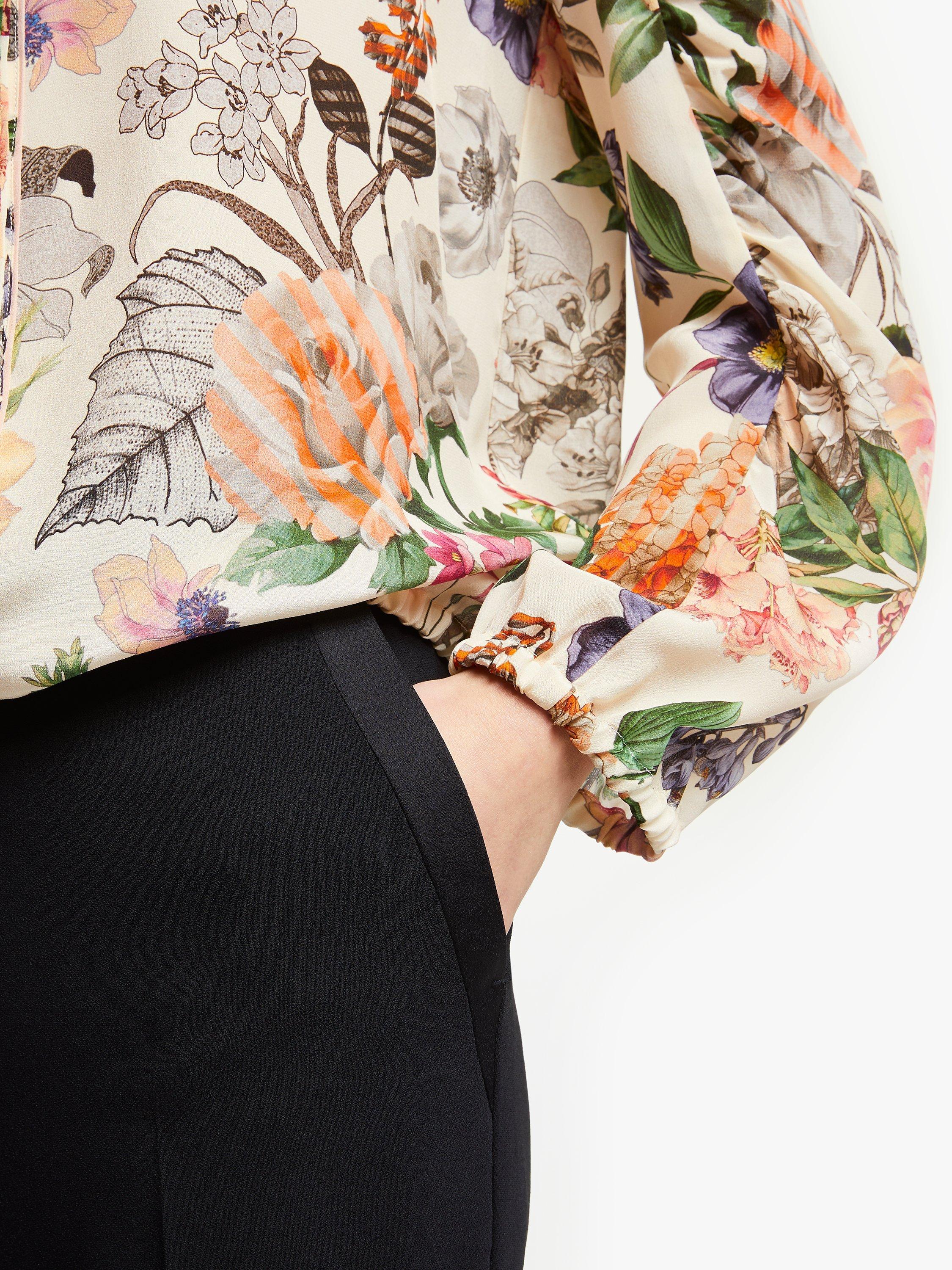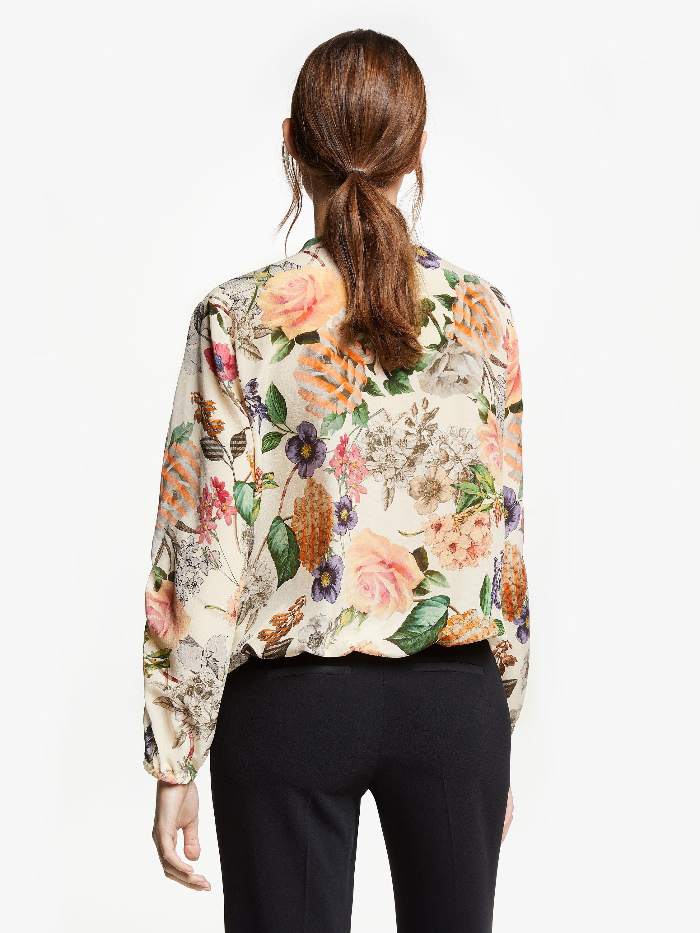 Made from soft silk, this top has a stunning floral print that will lend a statement finish to your look. In a blouson bomber style silhouette with gathered detail to the cuffs and hem, it is finished with a neat mandarin collar and concealed front placket.