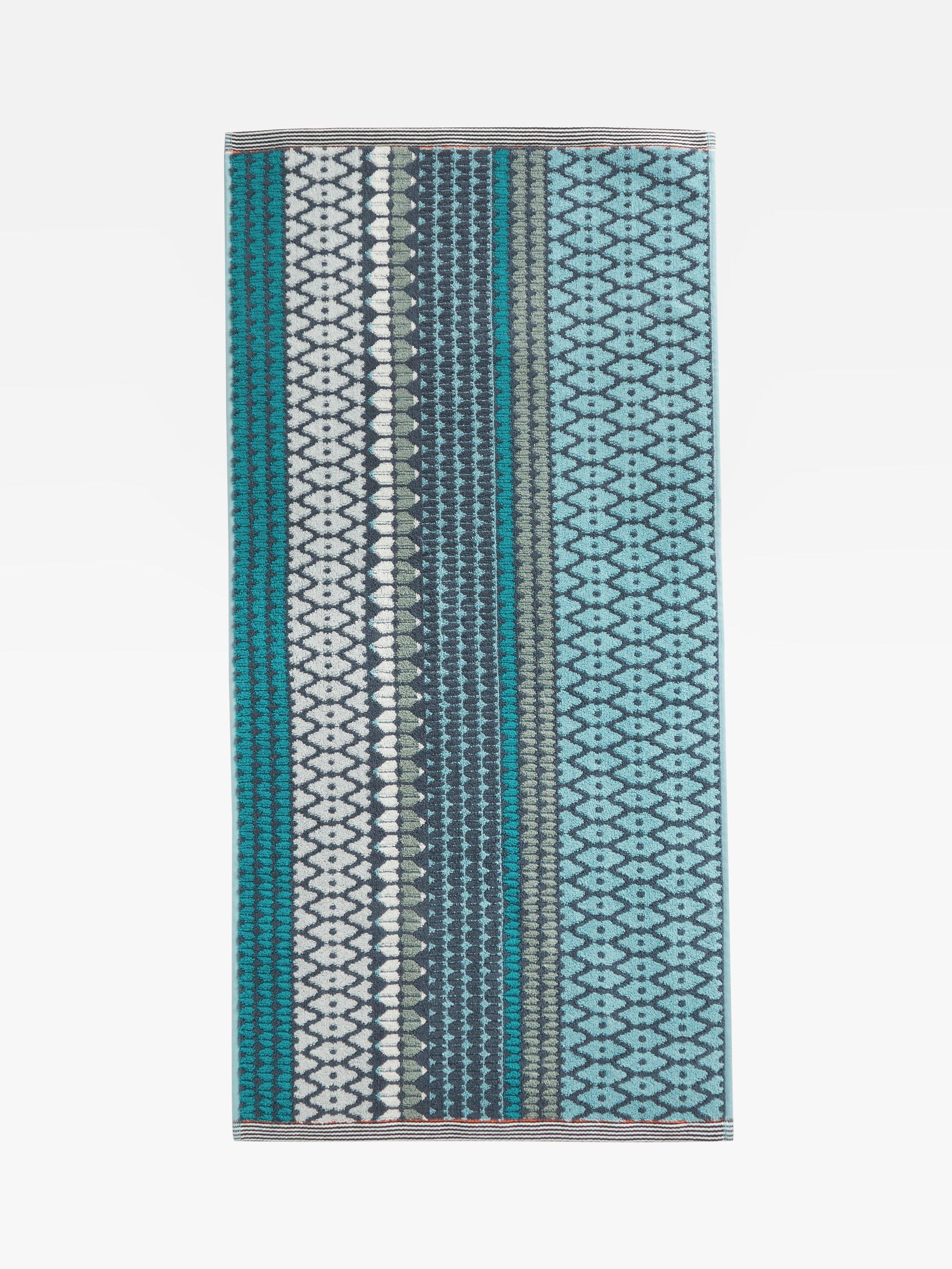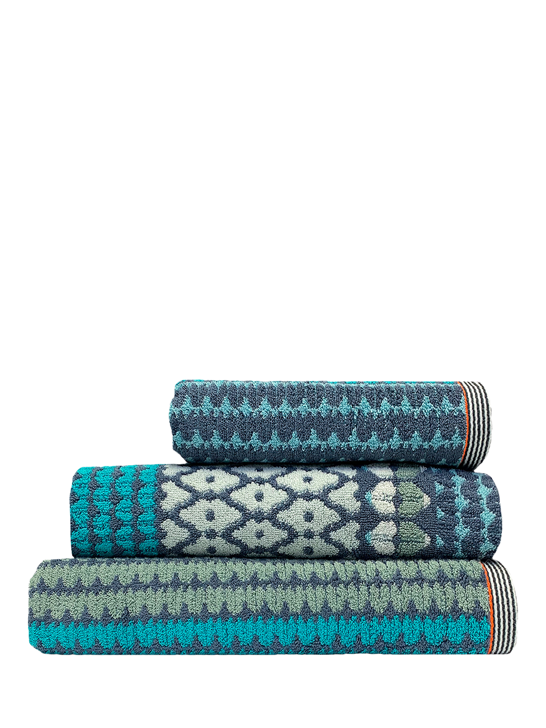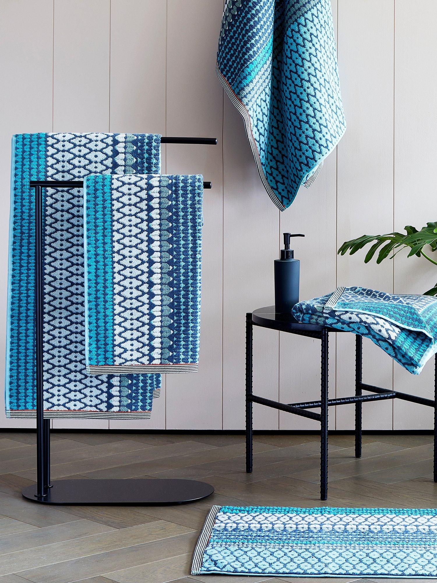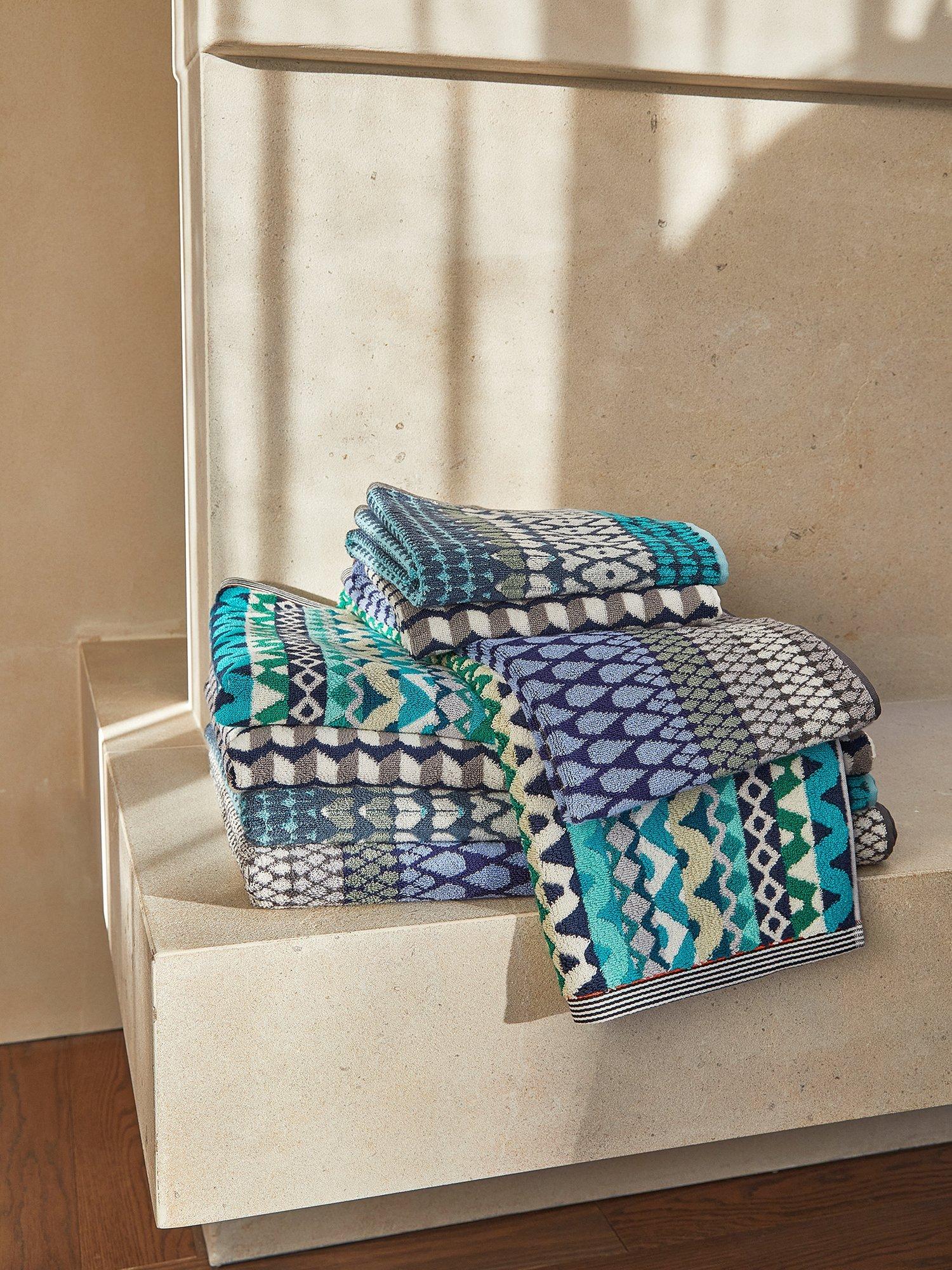 Margo Selby's signature style of geometric patterns in bold colours is clear on these Eastborne towels.
