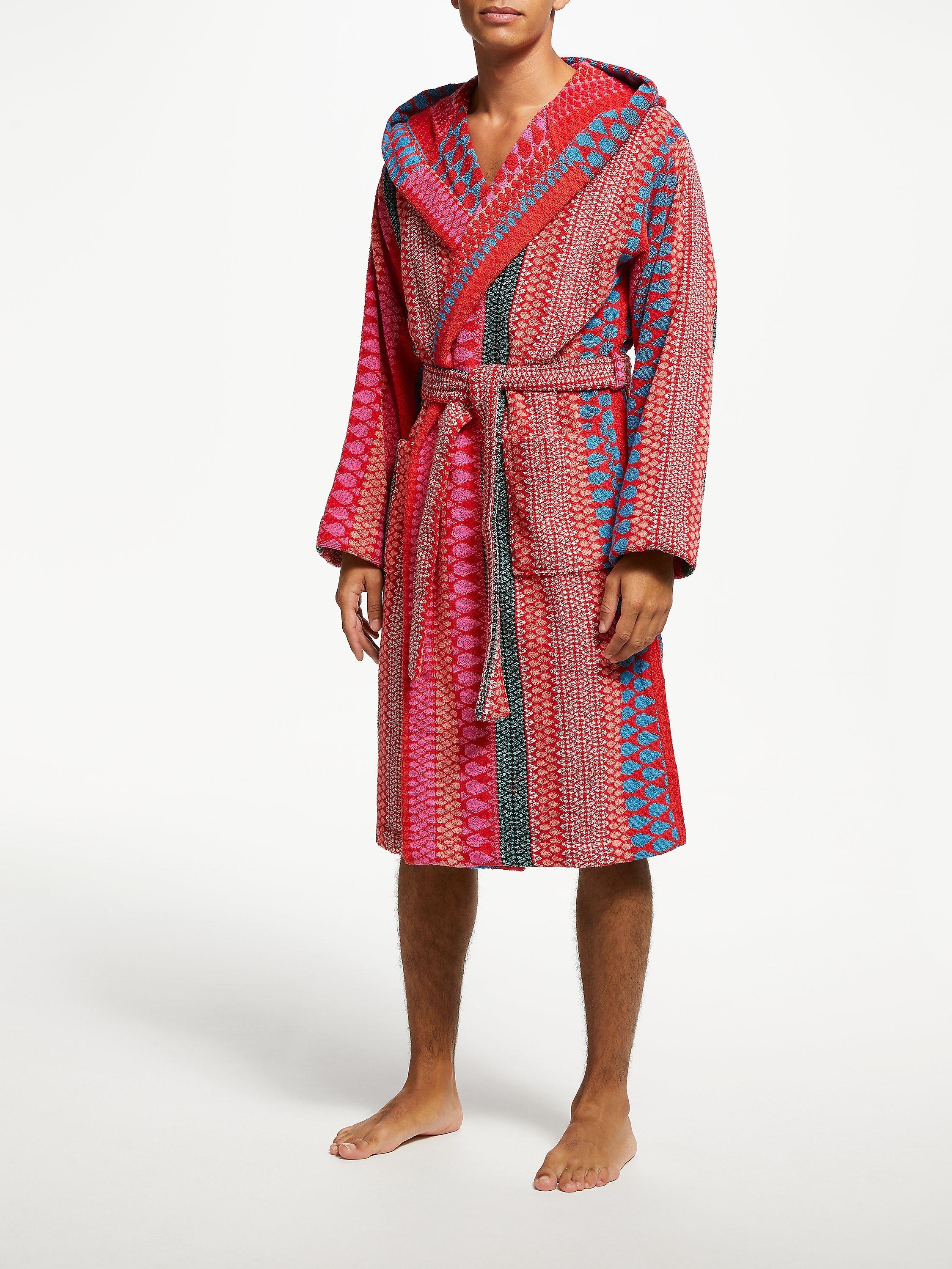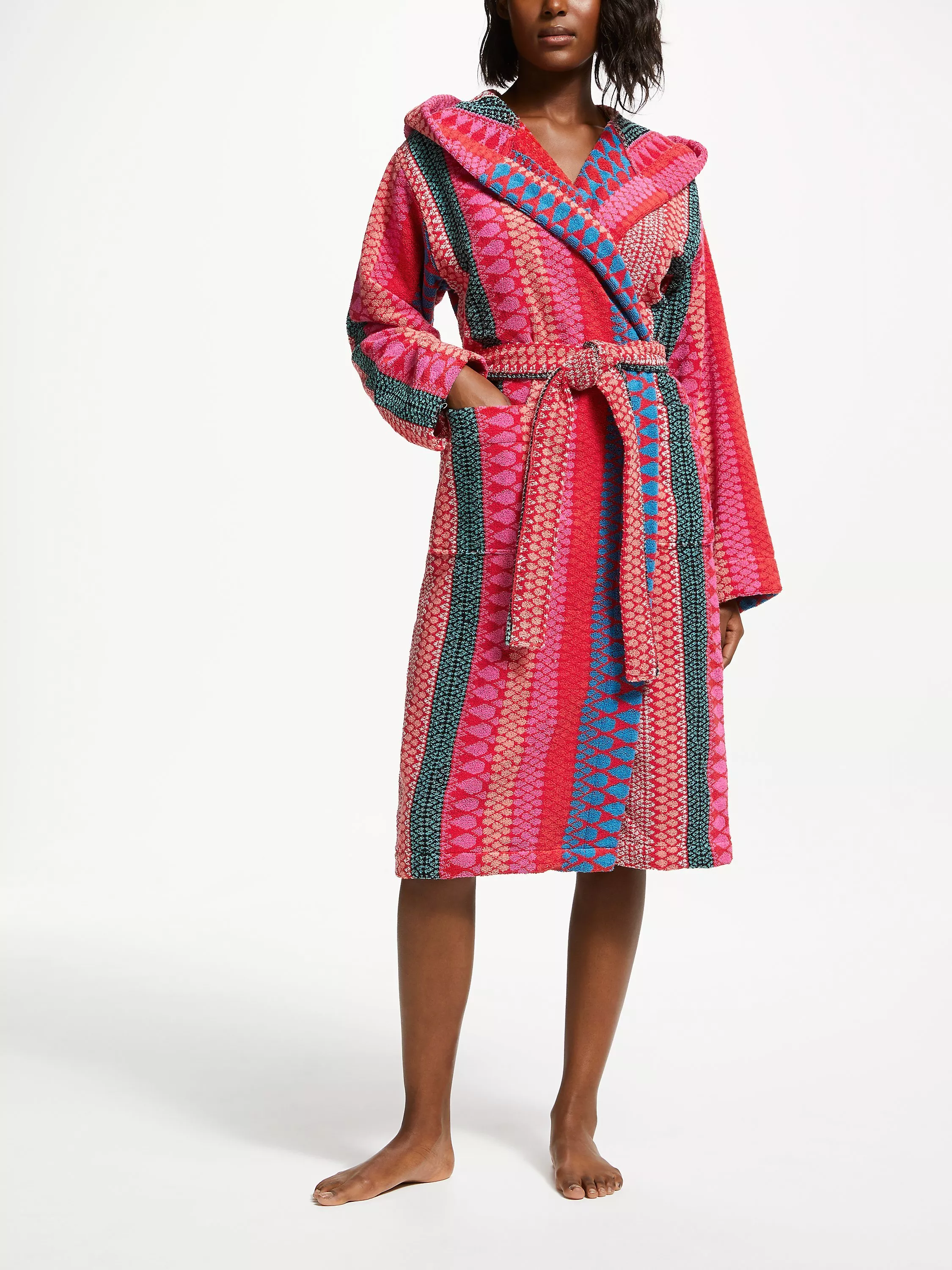 A cosy cotton bathrobe from Margo Selby in bright colours and bold patterns. Woven with long loops to make it extra soft, the hood gives it an even greater snuggly feel.