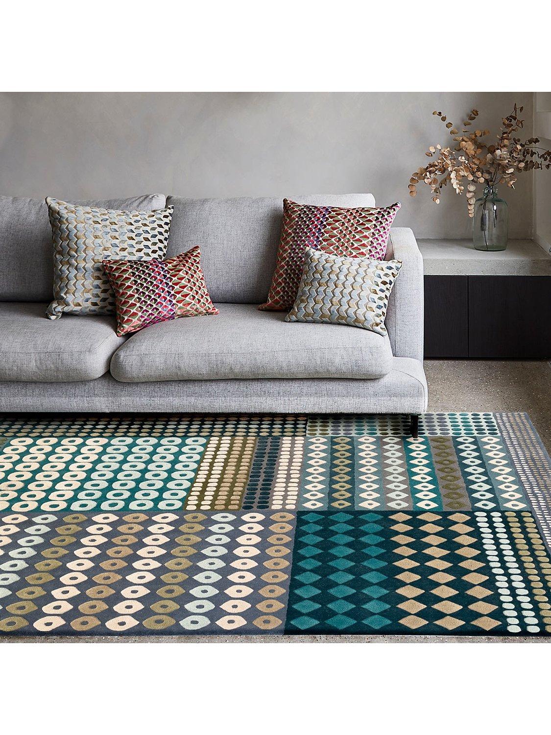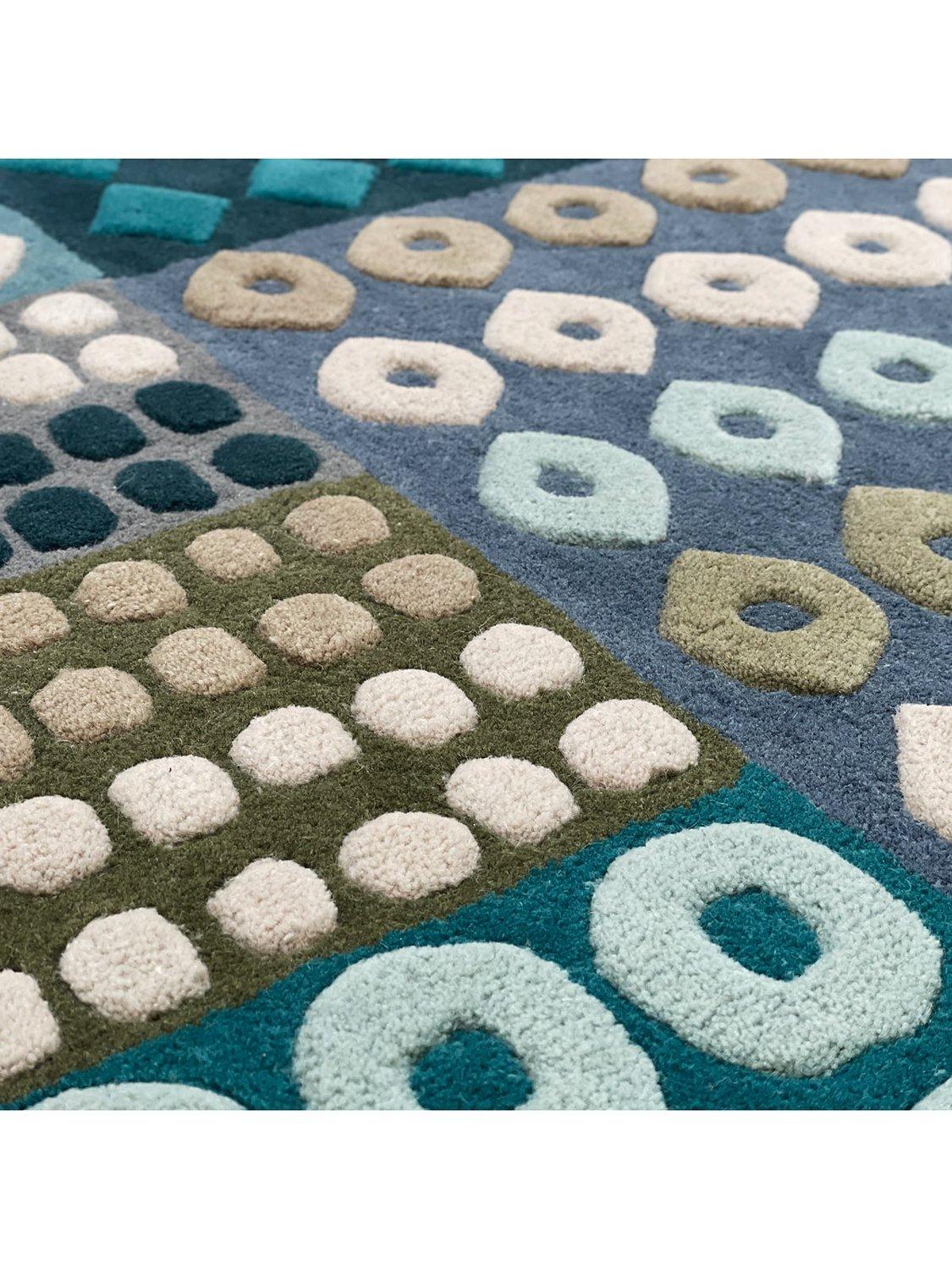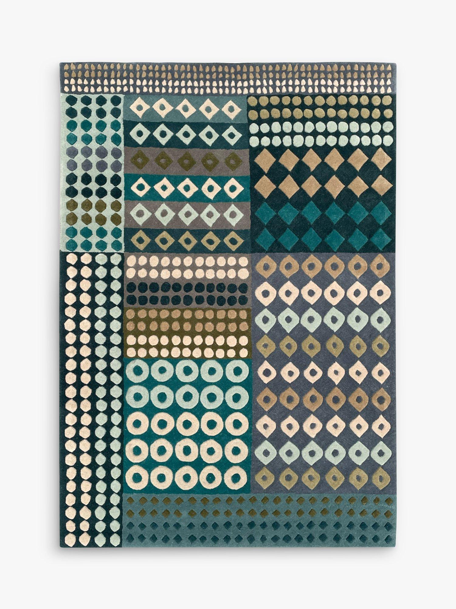 Powell is a hand tufted rug featuring signature motifs of varying scale. The design is inspired by Indian architectural carving, maximalist pattern and mosaic tiles. The rug pieces together blocks of colour and pattern like a patchwork quilt. The finishing process of meticulous hand carving each motif produces a crispness of line, with varied pile heights to create a 3-dimensional effect.