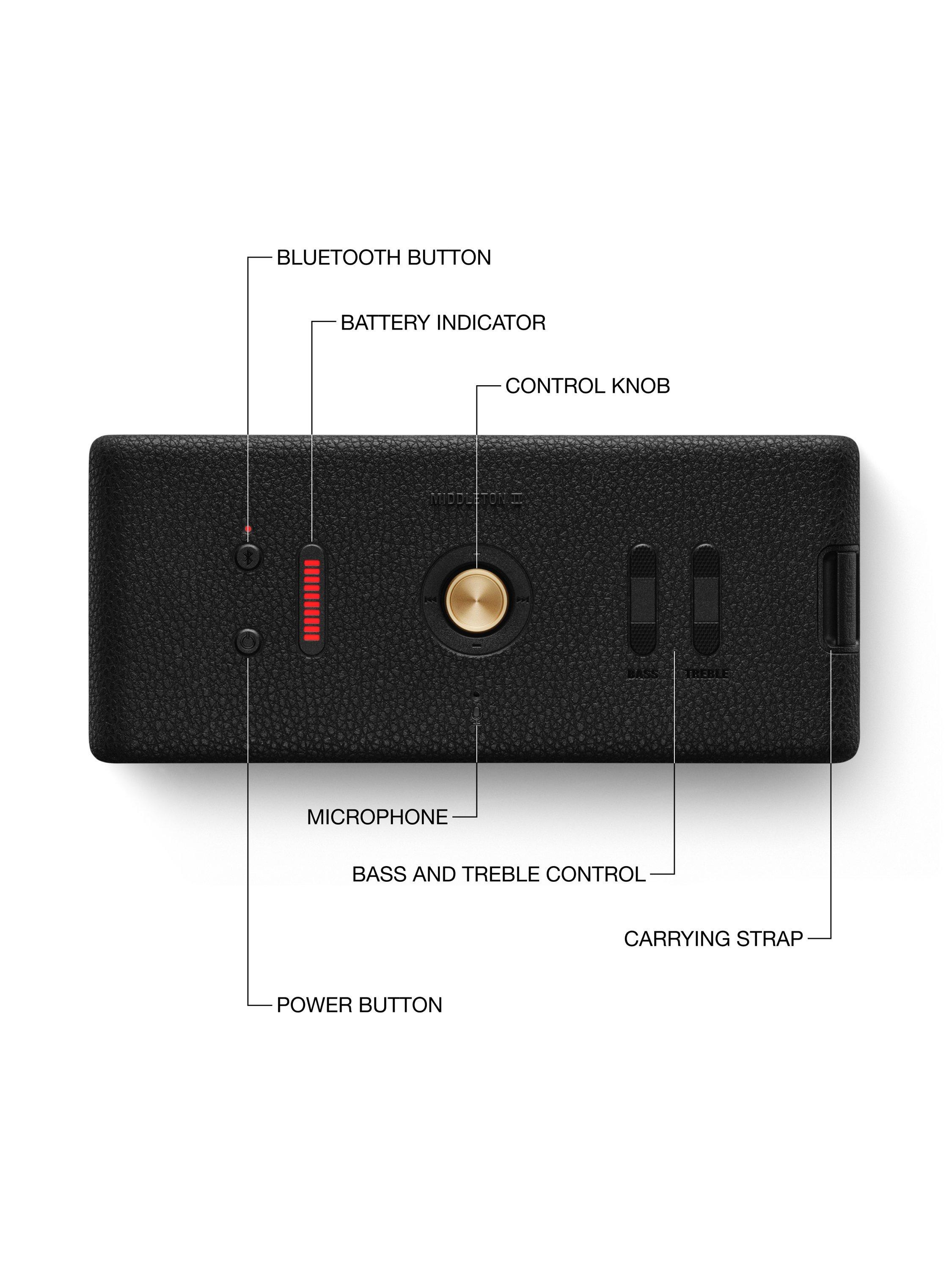 Middleton II utilises True Stereophonic, a unique form of multi-directional sound from Marshall, so the listener experiences 360° sound, wherever you stand. And change the volume and the music all in one place with its multi-directional control knob.
