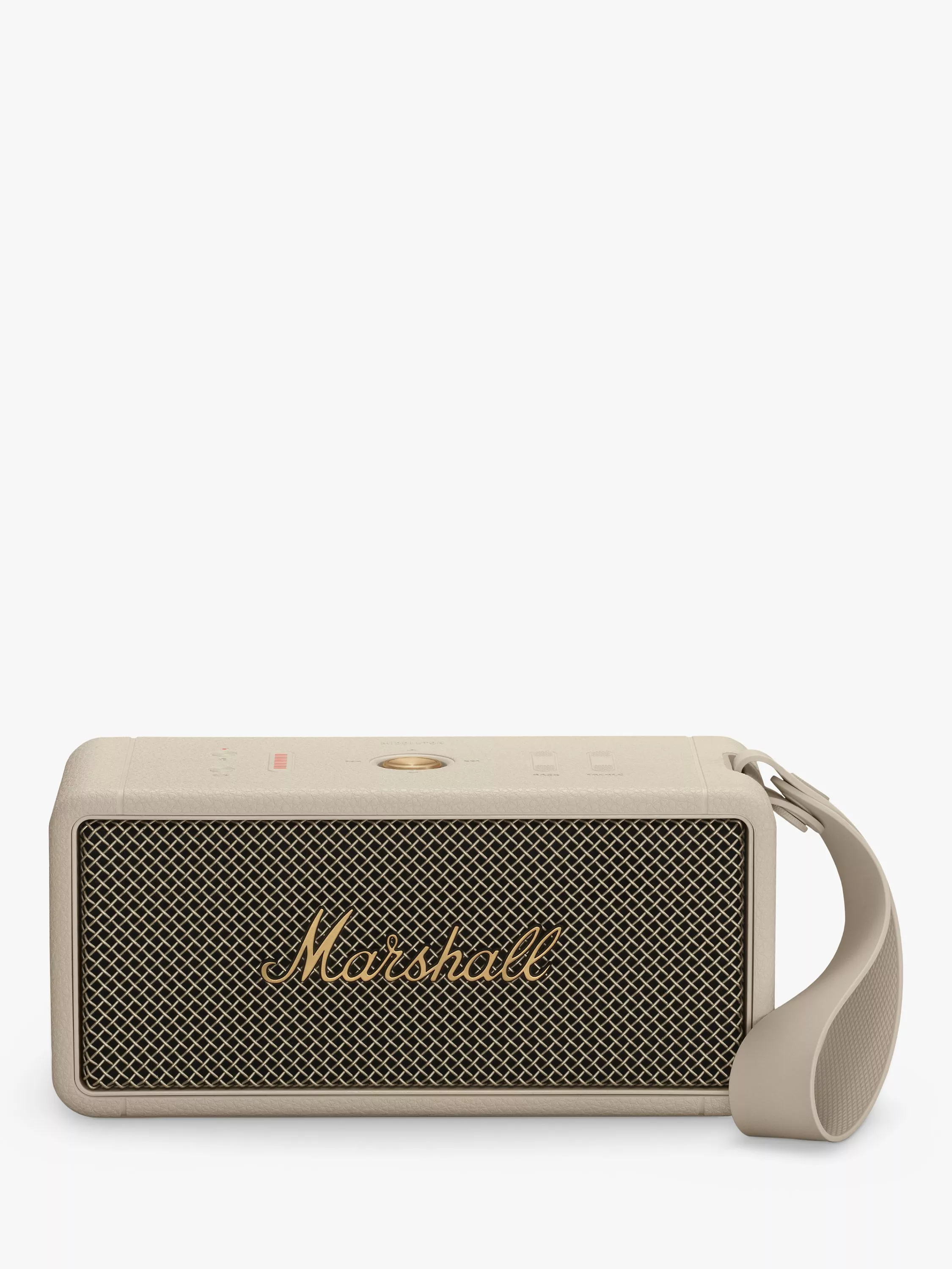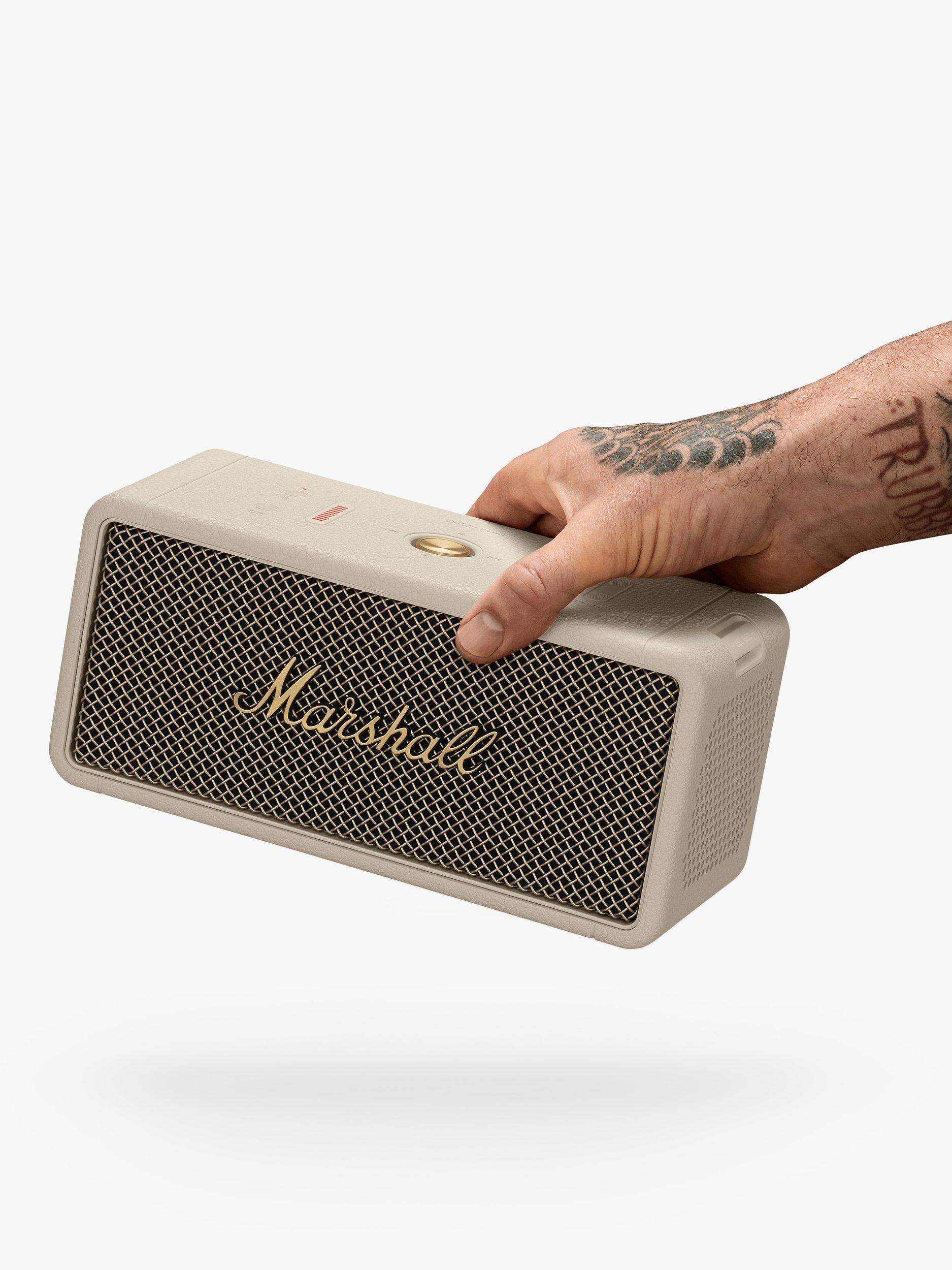 Carry the loud sound of Marshall in your hand, at home, or outdoors. The Middleton holds a hefty 20 hours of playtime, while tough-as-nails build quality makes it ready for anything. Connect multiple Bluetooth devices and drop straight into the music … just pair and play. It might be small enough to go with you, but stand back, this speaker packs mighty Marshall power.