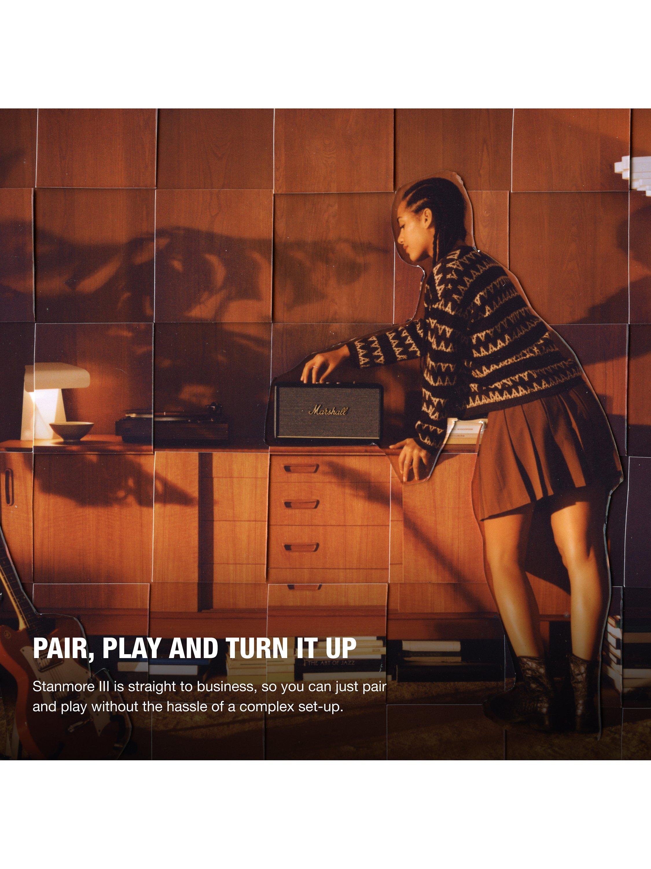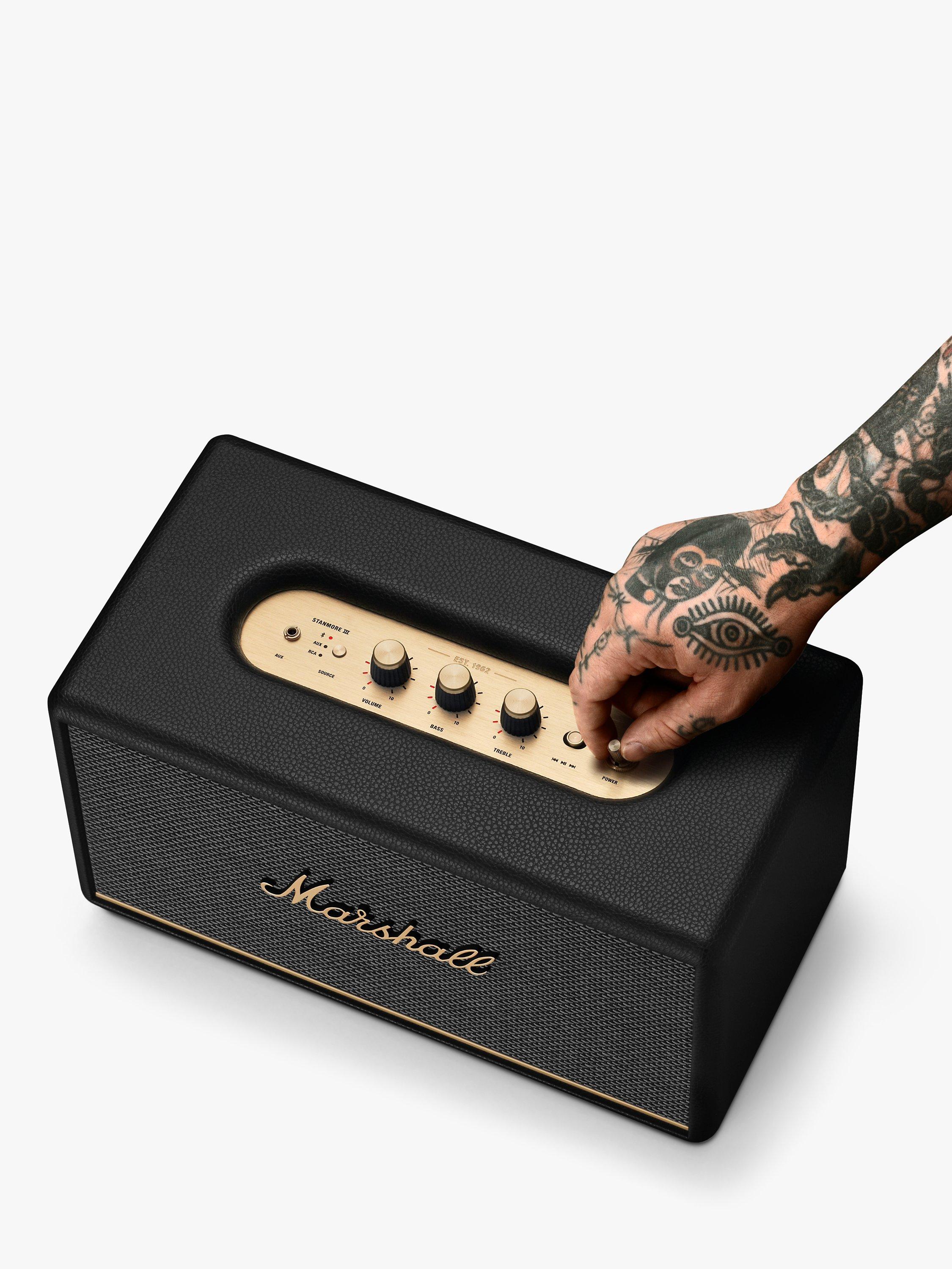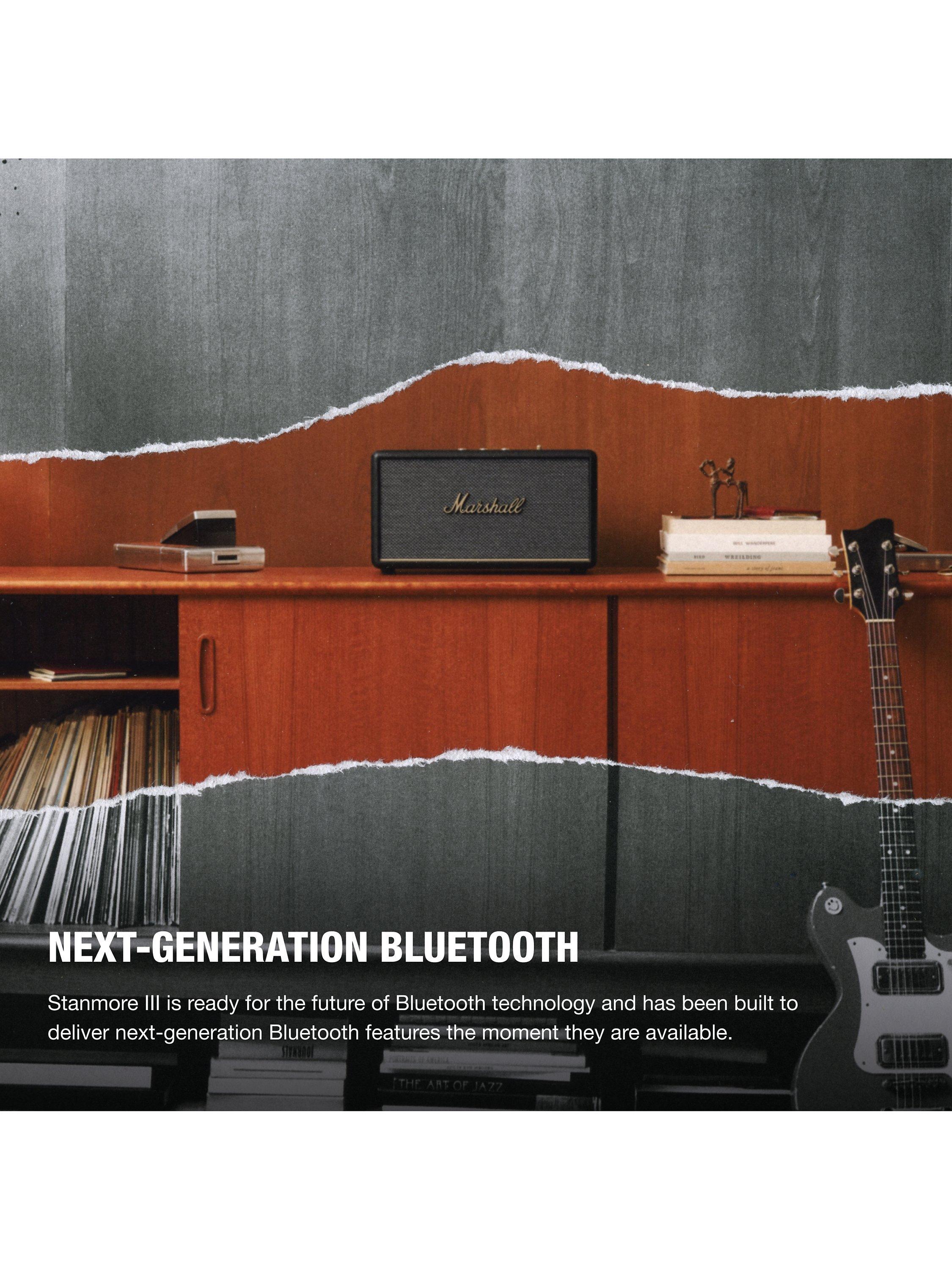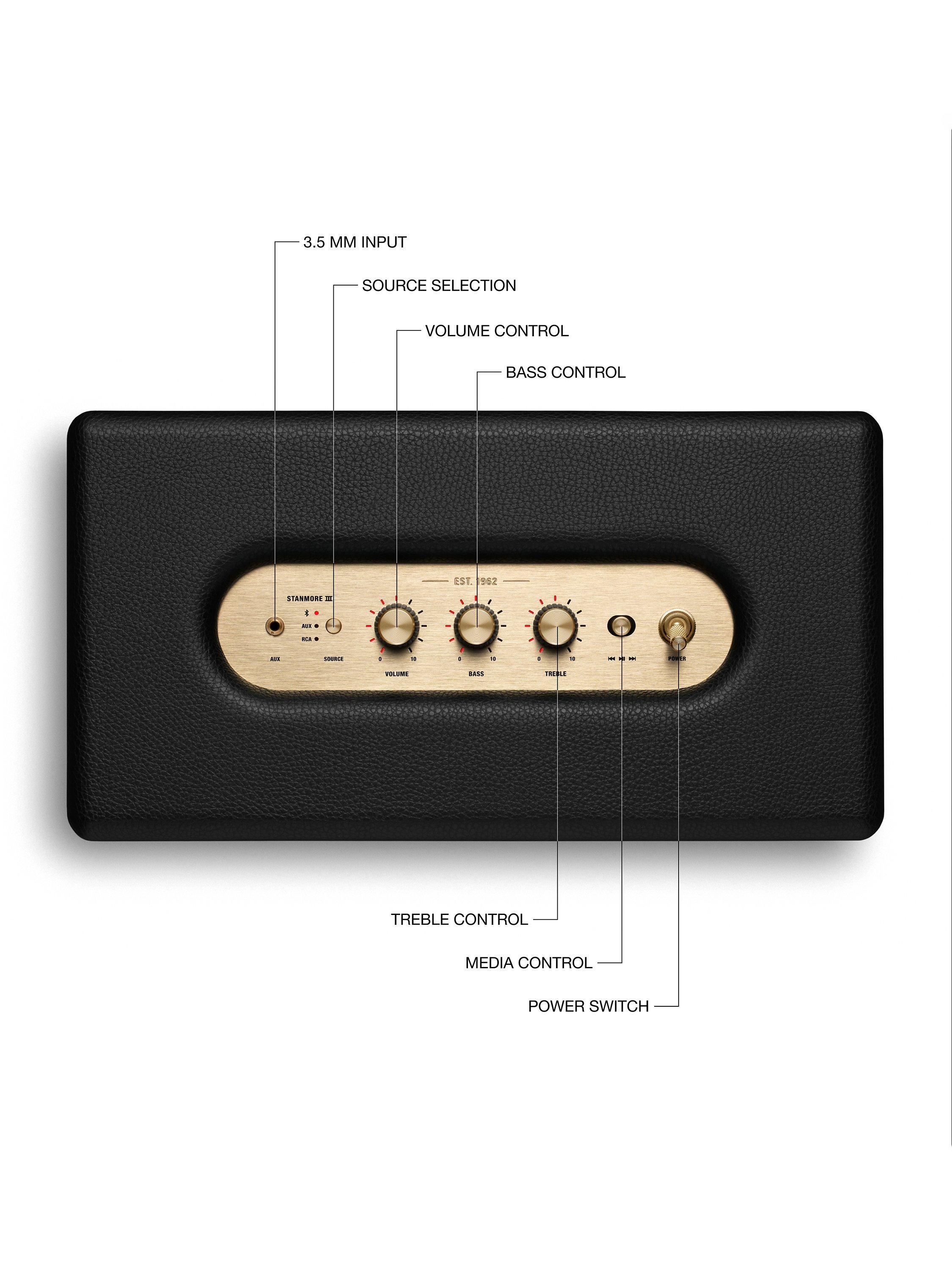 Stanmore III has an even wider soundstage than its predecessor, delivering room-shaking Marshall signature sound that’s been re-engineered for a more immersive experience. Tweeters are now angled outwards and updated waveguides deliver a consistently solid sound that is so wide it virtually chases you around the room! It also features Dynamic Loudness, adjusting the tonal balance of the sound to ensure your music sounds just as brilliant at every volume. Fine-tune bass and treble via the analogue knob controls atop the speaker, or via the Marshall Bluetooth app (available on iOS and Android).