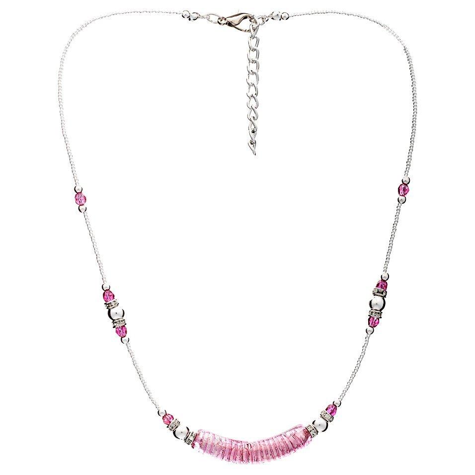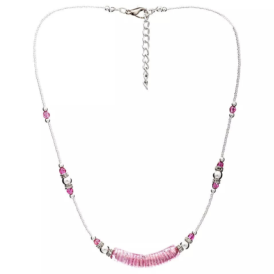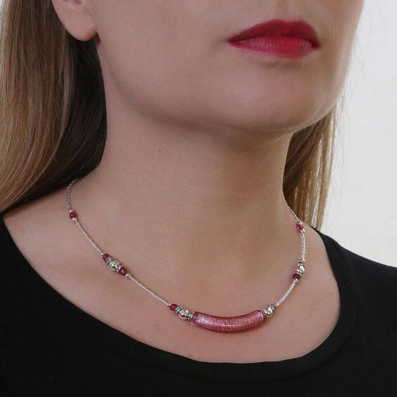 The design-led piece presents various faceted Murano glass beads in different cuts with a central elongated element. The necklace has an adjustable chain and a safe lobster clasp.