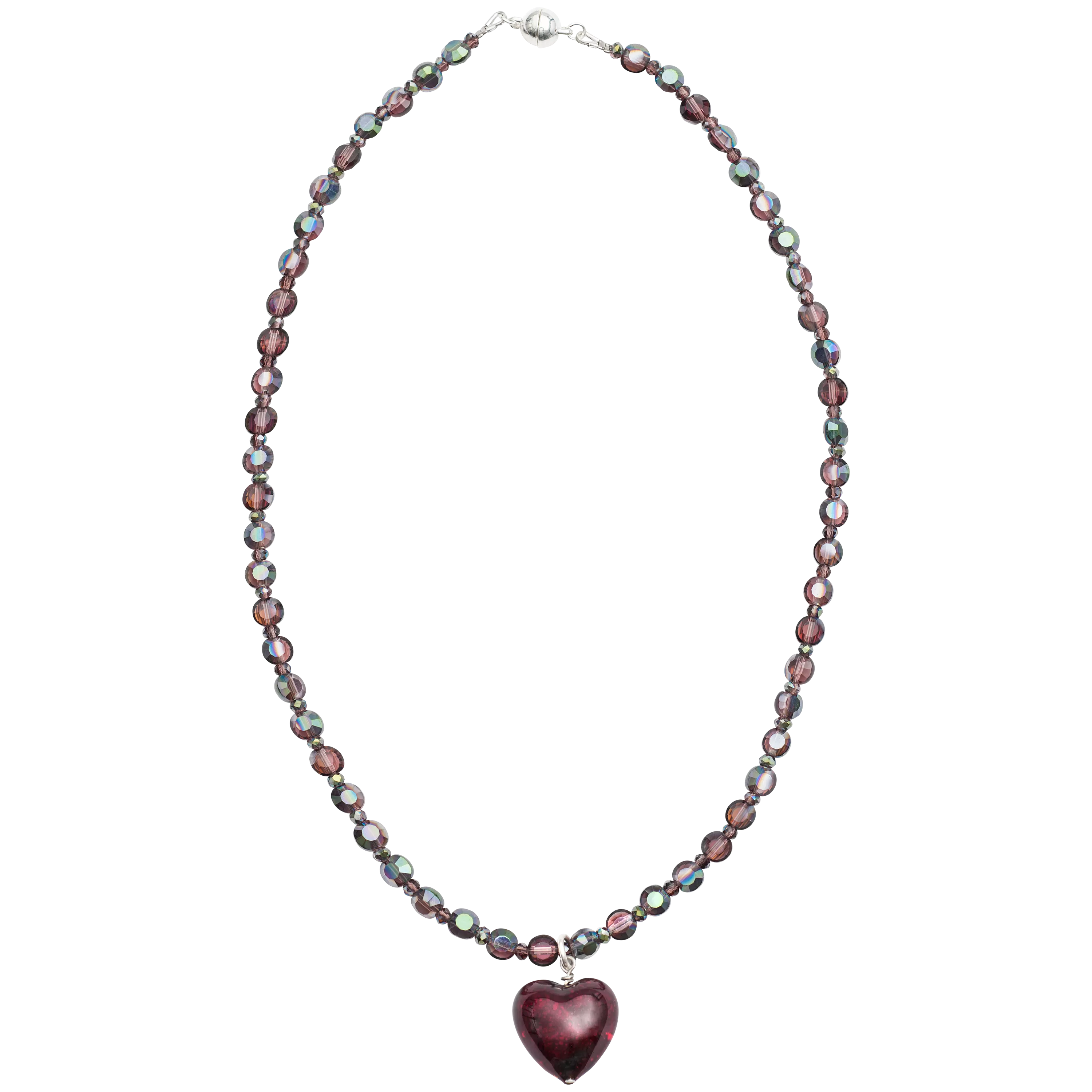 Murano glass, with its distinctive, speckled look, is used to stunning effect. Sparkling beads lead down to a heart-shaped pendant.