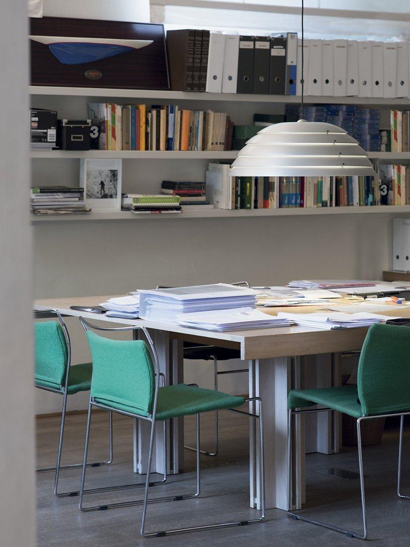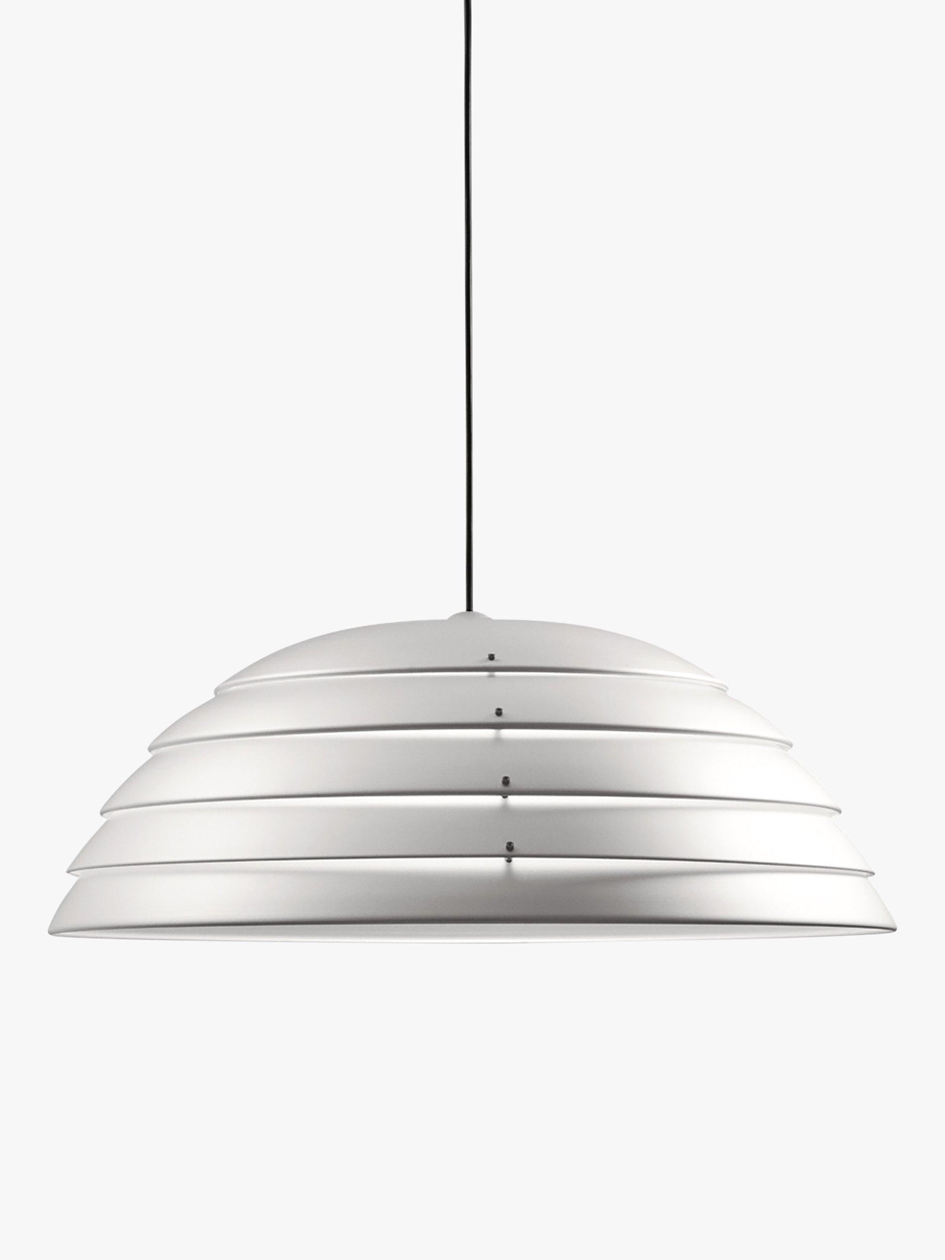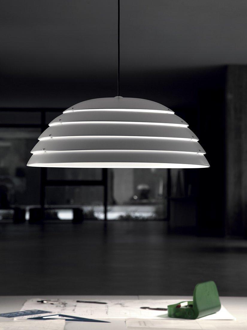 Ceiling pendant light with parallel slices of light, Cupolone is designed by Elio Martinelli for Martinelli Luce and made in Italy. A game of lights and shadows. The light filters through the overlapped five painted aluminium slices that form a dome-shaped ceiling light.