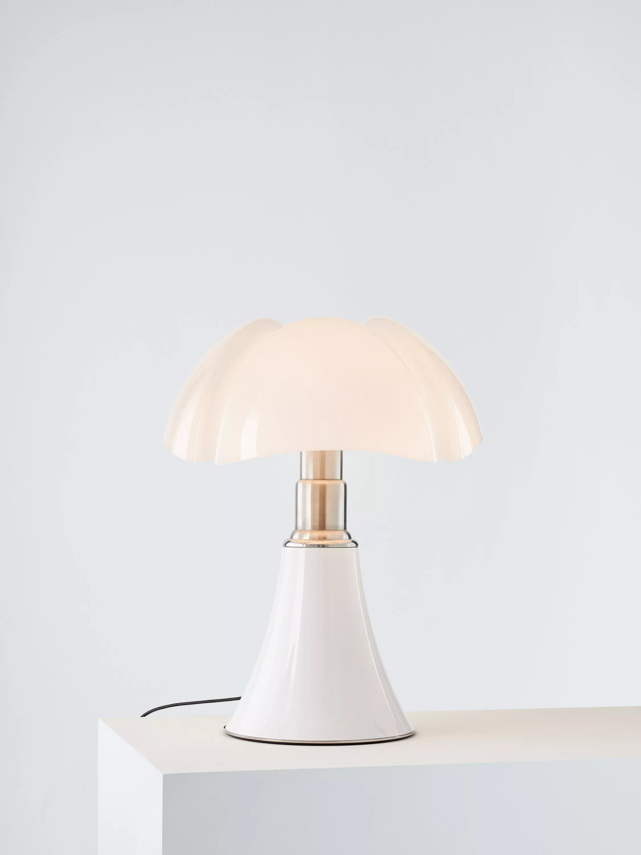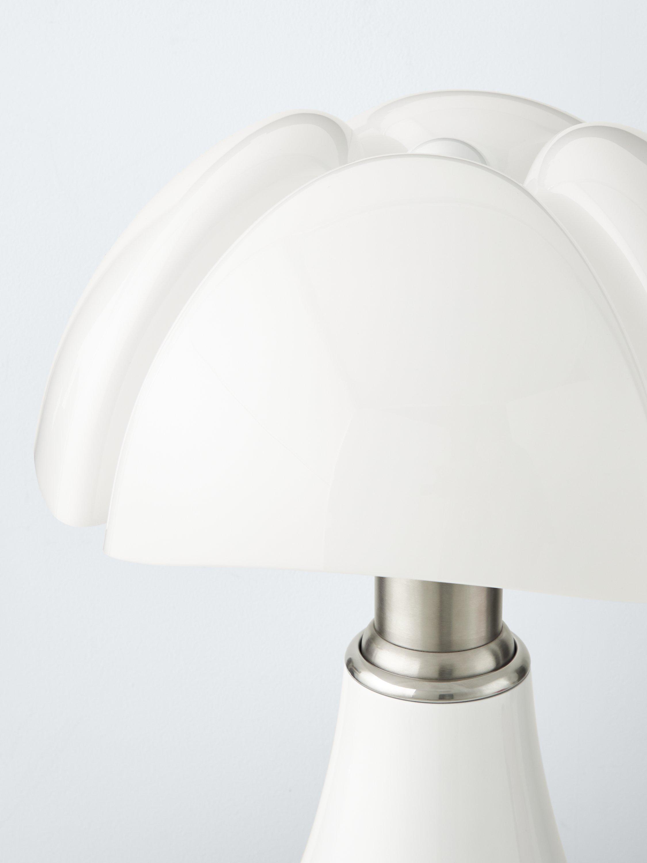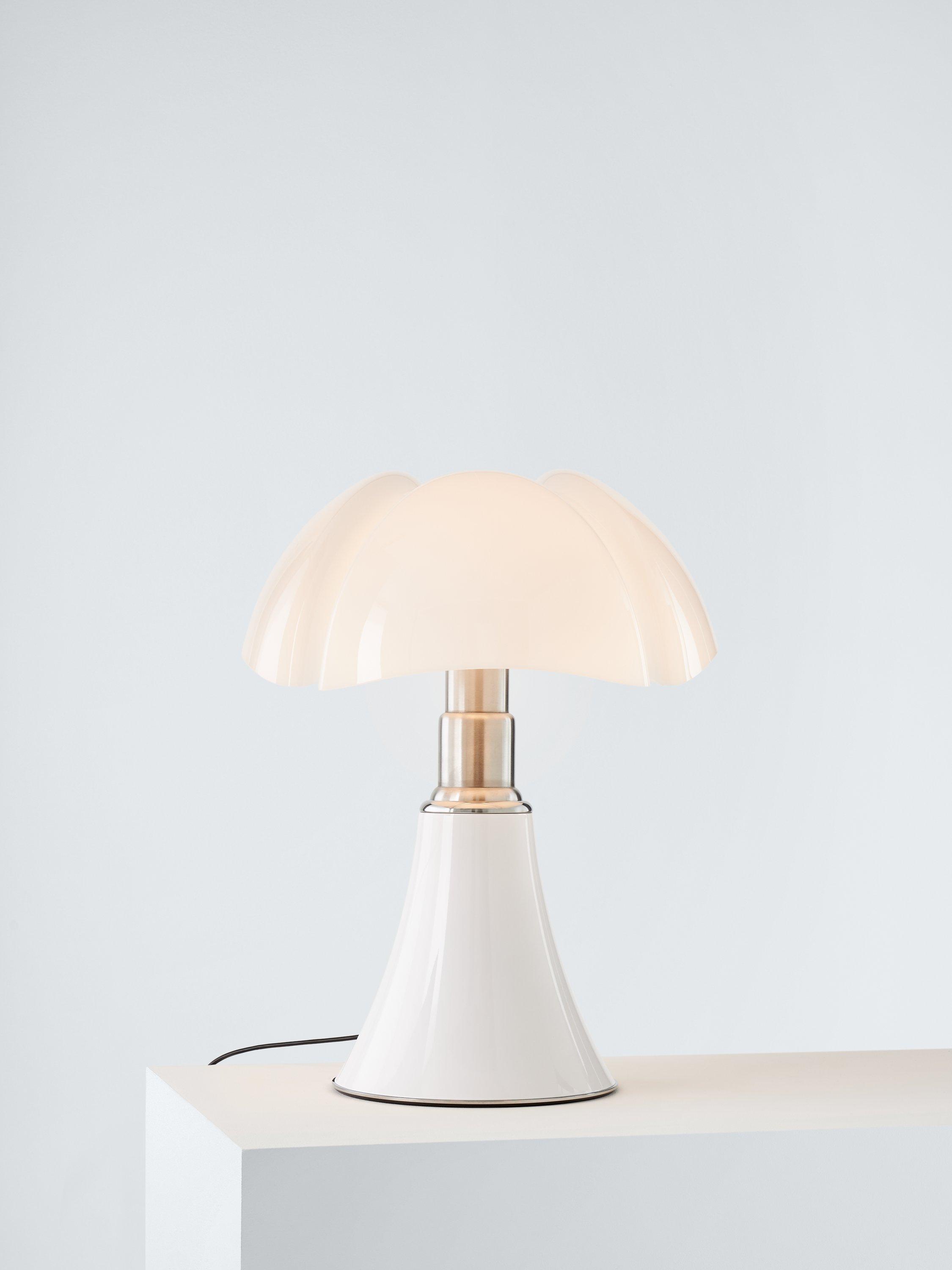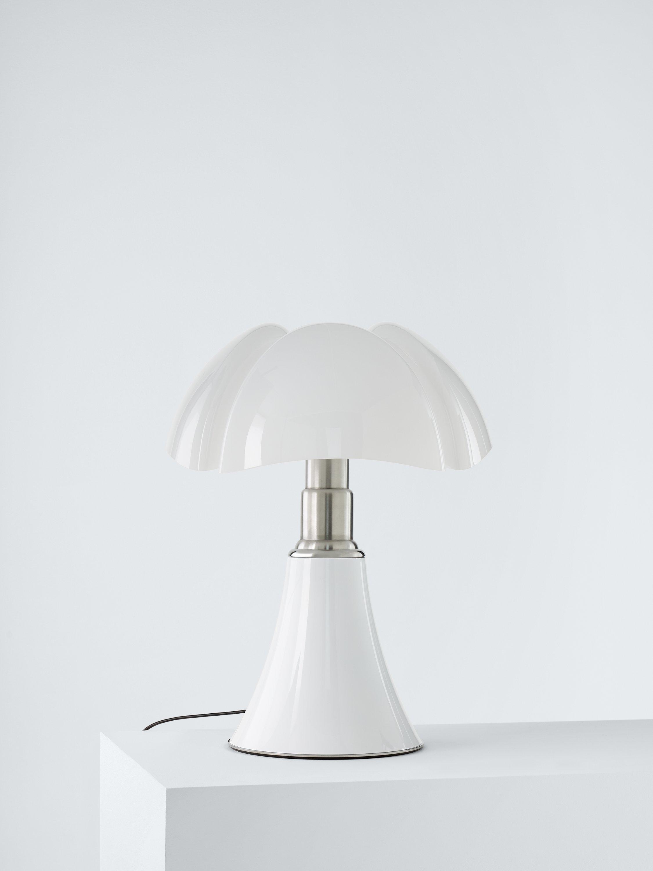 Designed in 1965 by Gae Aulenti for Martinelli Luce, the lamp was innovative in its day for its diffuser and for the shape of the conic base that grows in height through the ribs of the diffuser, just like the wings of a bat, known as a 'pipistrello' in Italian. Resting on a table, this dimmable lamp has an expressive hold on any type of environment.