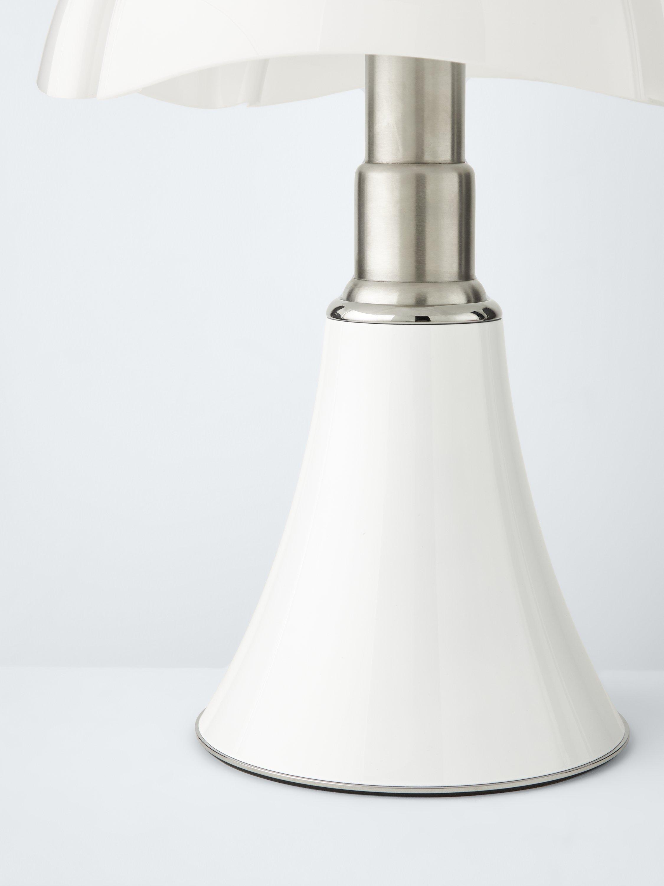 Pipistrello is a table lamp with diffused light and adjustable in height with its glazed telescopic stainless steel stand.