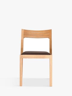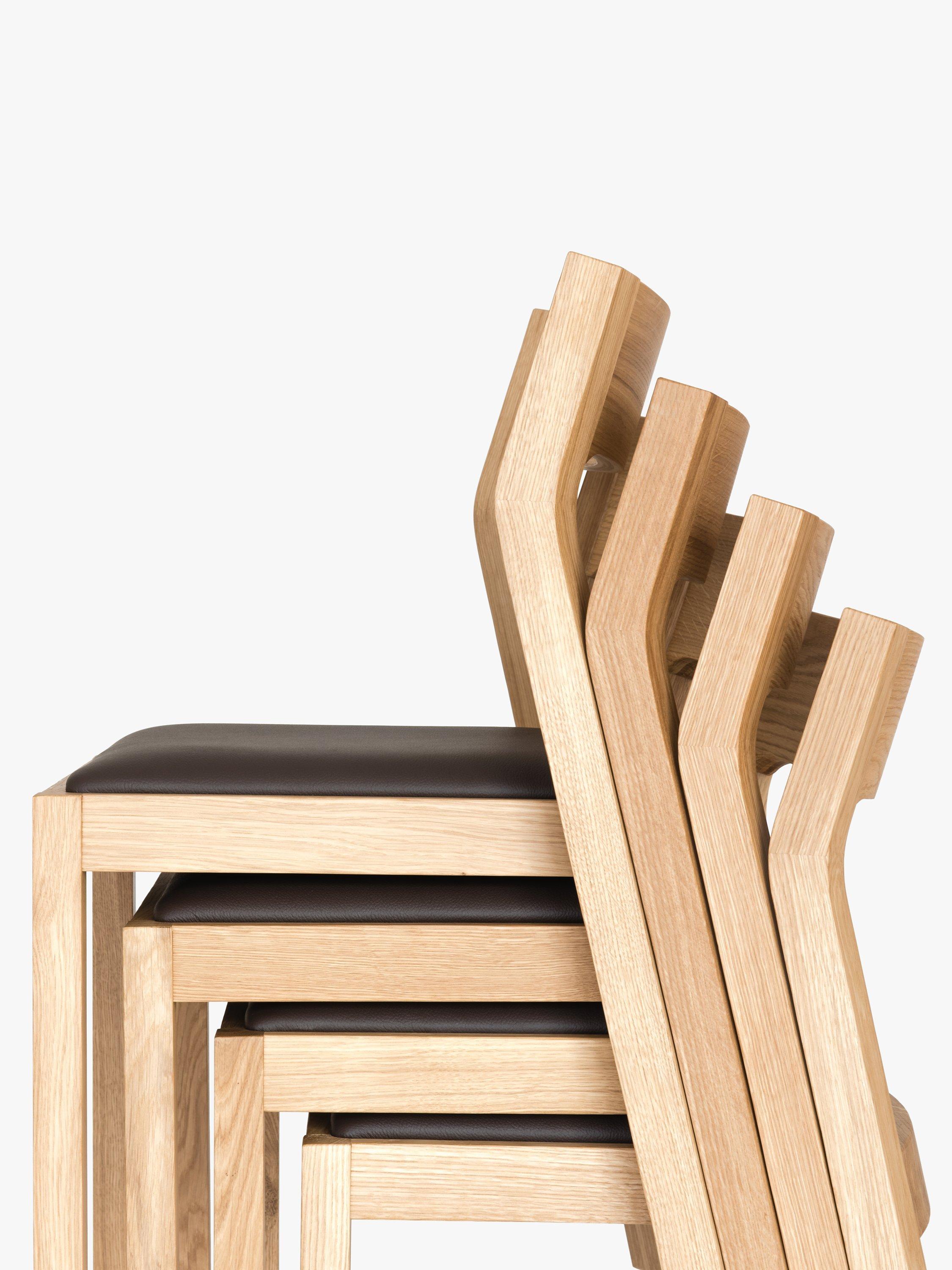 Matthew Hilton's Profile chair is an elegant, stackable solid timber chair with an upholstered soft leather seat. A well-proportioned, lightweight design with a recessed back detail ensures this dining chair is extremely comfortable to sit in for extended periods of time. The chair’s angular form is balanced by the softness of the upholstered seat pad.