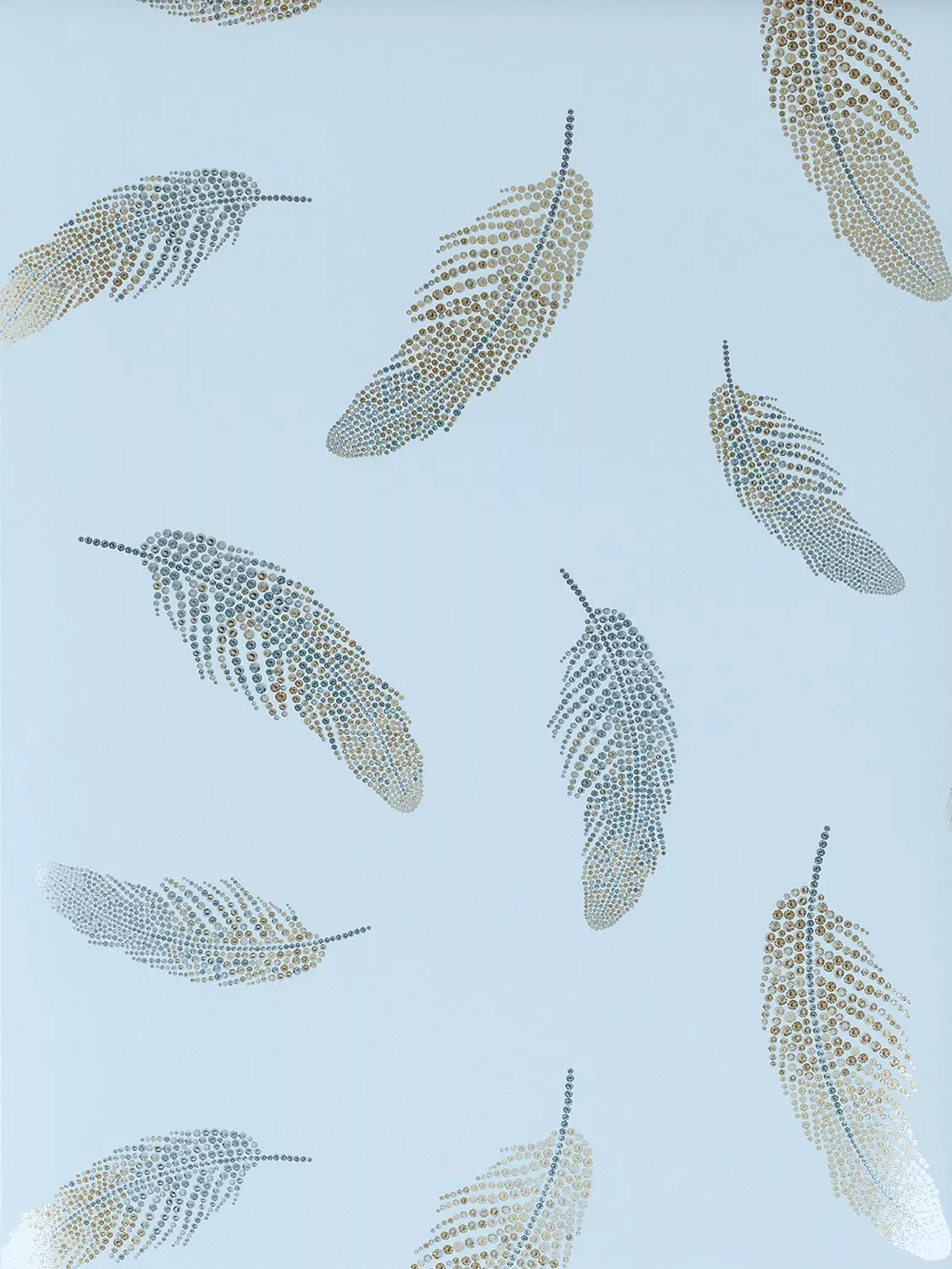 Shimmering, jewel-like feathers float on a contrasting ground.