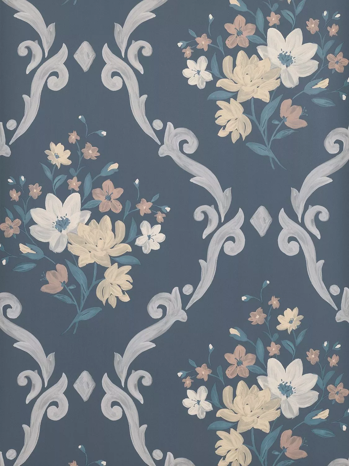 A large scale painterly scrolling trellis decorated with watercolour flowers.
