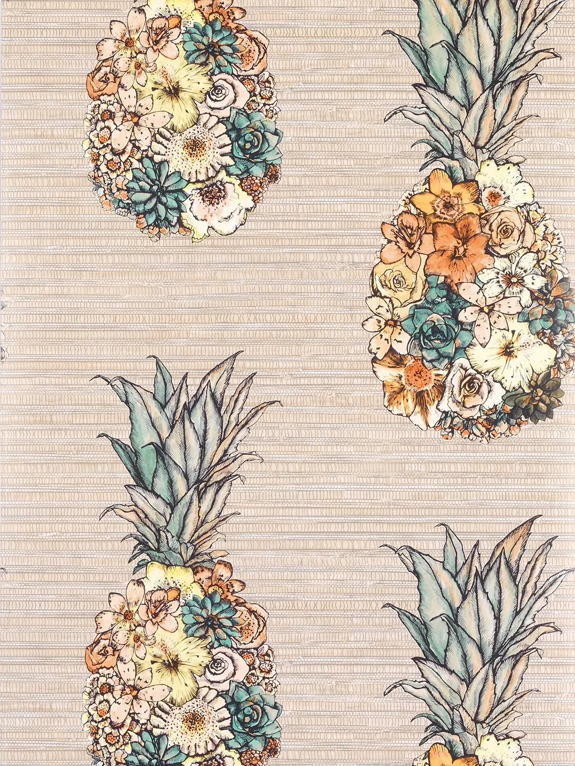 Stylised pineapples, composed of flowers with colourful petals, set on a background resembling grass cloth.Have you thought about wallpaper accessories? Shop here.