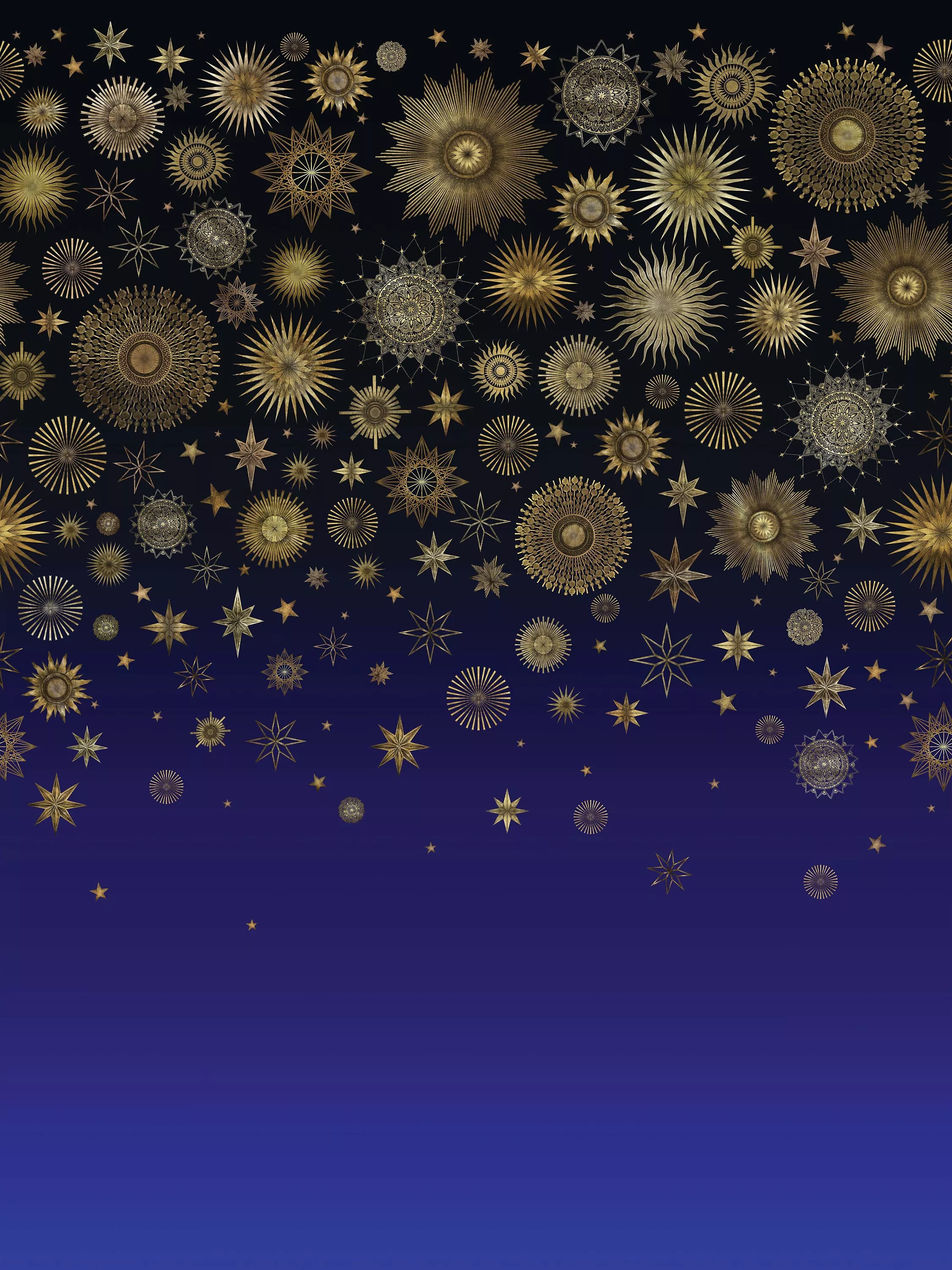 A large-scale wrap-around inky blue night-time sky was imagined for this dream scheme. A bold and dramatic skyscape dotted with hand-drawn golden stars to transport you to a magical and theatrical place.