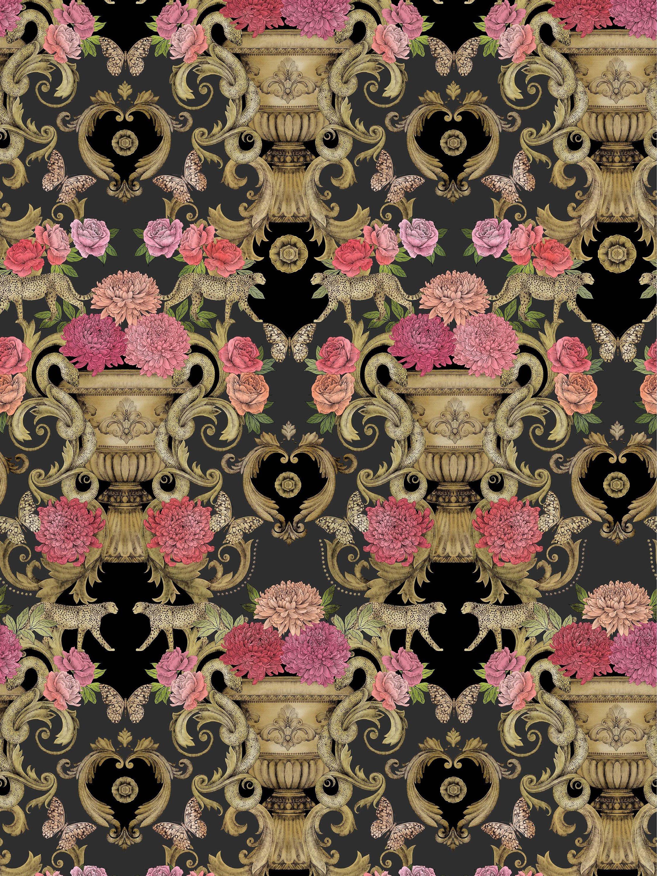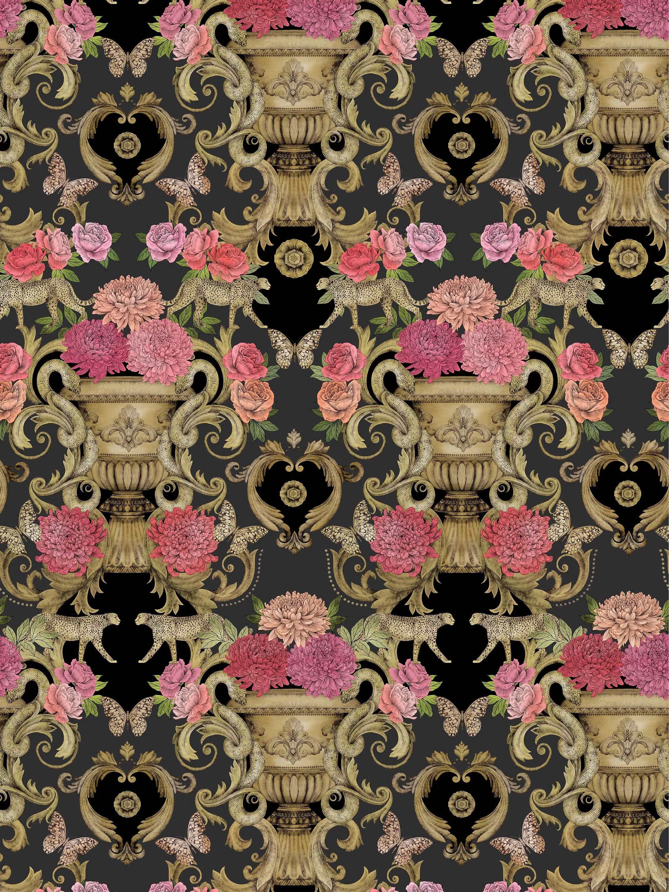 Hand-drawn scrolls, plaster and aged stonework formed the starting point for this decadent design inspired by the faded grandeur of stately homes and gardens. Stonework urns brim with summer blooms.