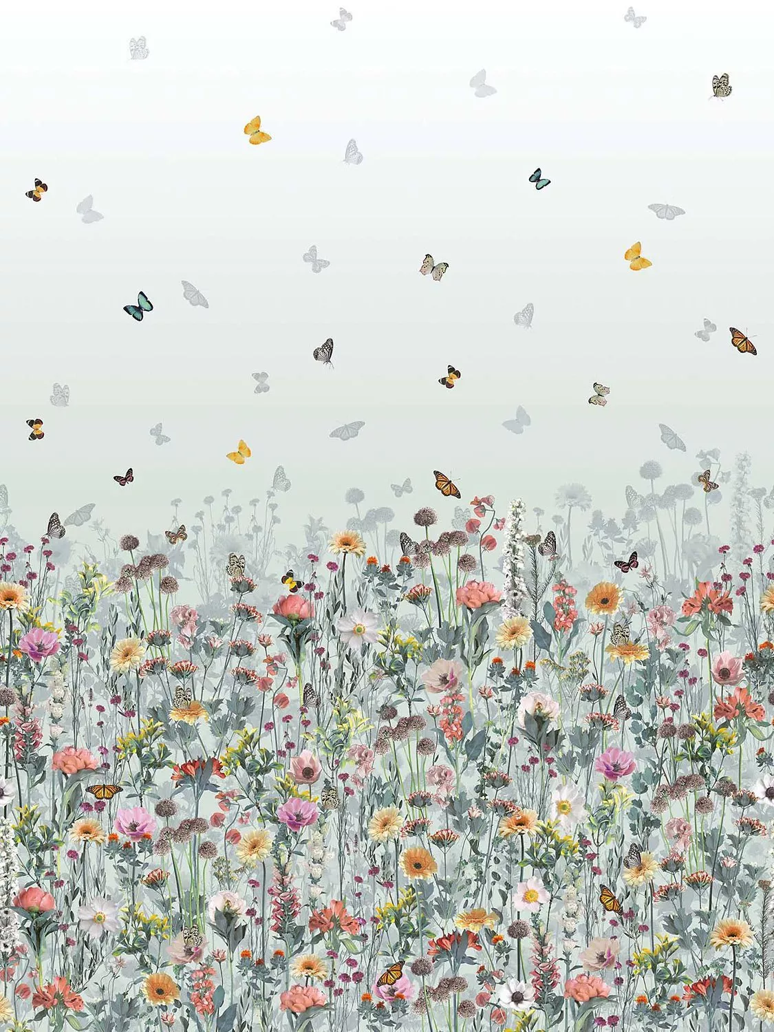 Butterflies float into an early morning sky from a grassy wildflower meadow.