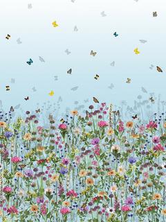Butterflies float into clear blue Mediterranean sky from a grassy wildflower meadow.