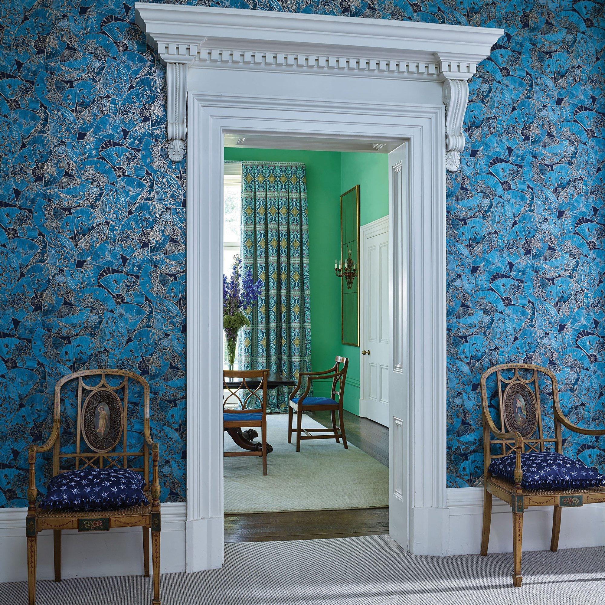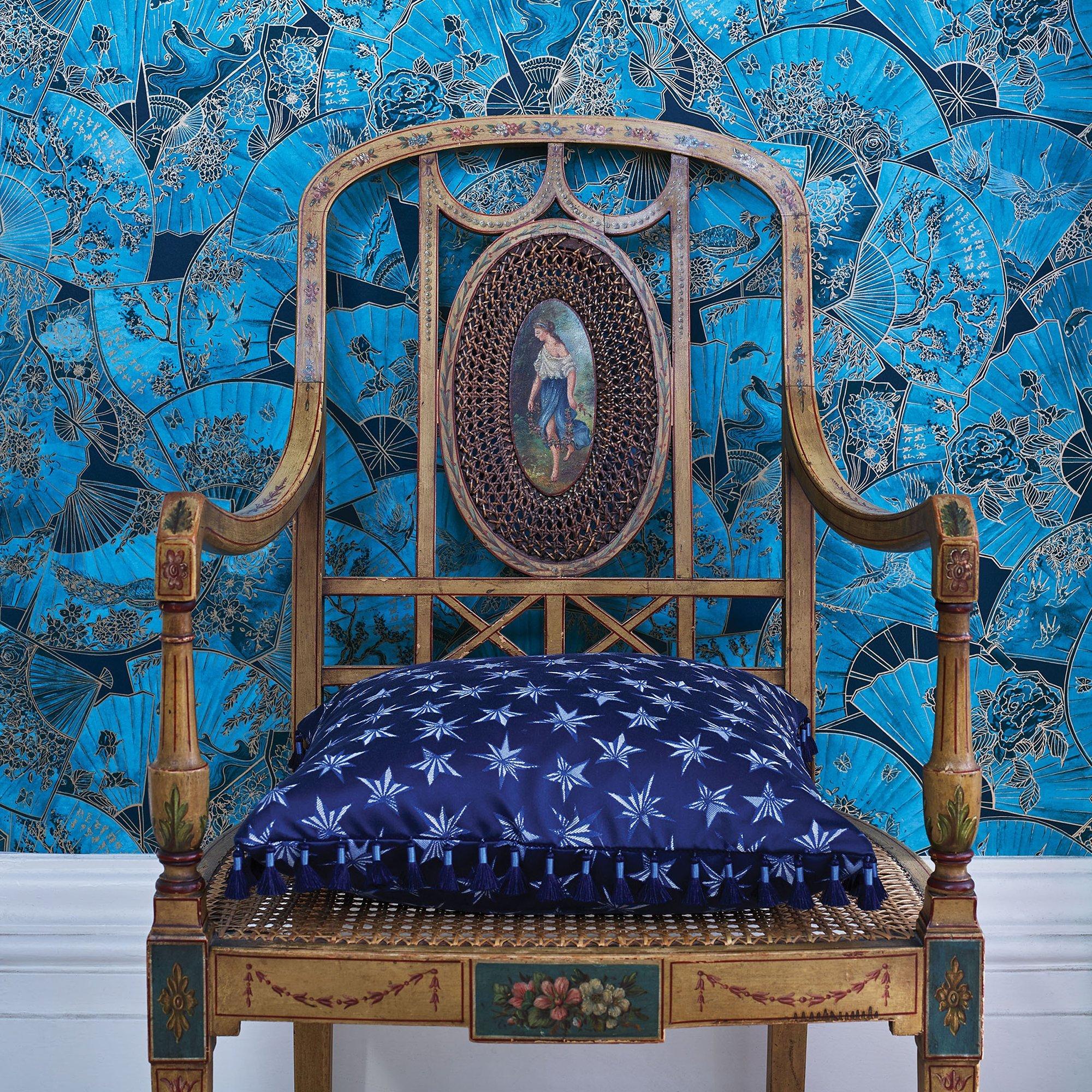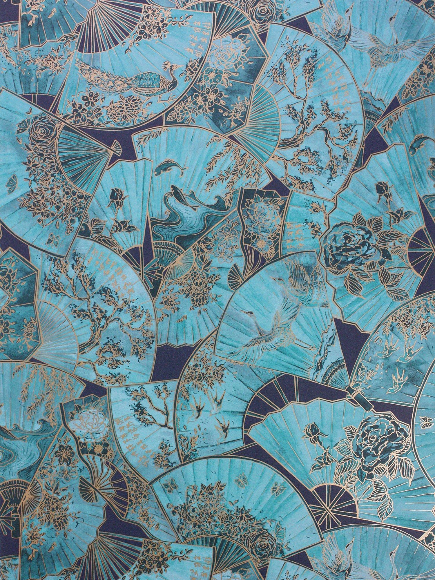 An all-over design of delicately patterned fans featuring Japanese blossoms and peacocks depicted in contrasting metallic detail.
