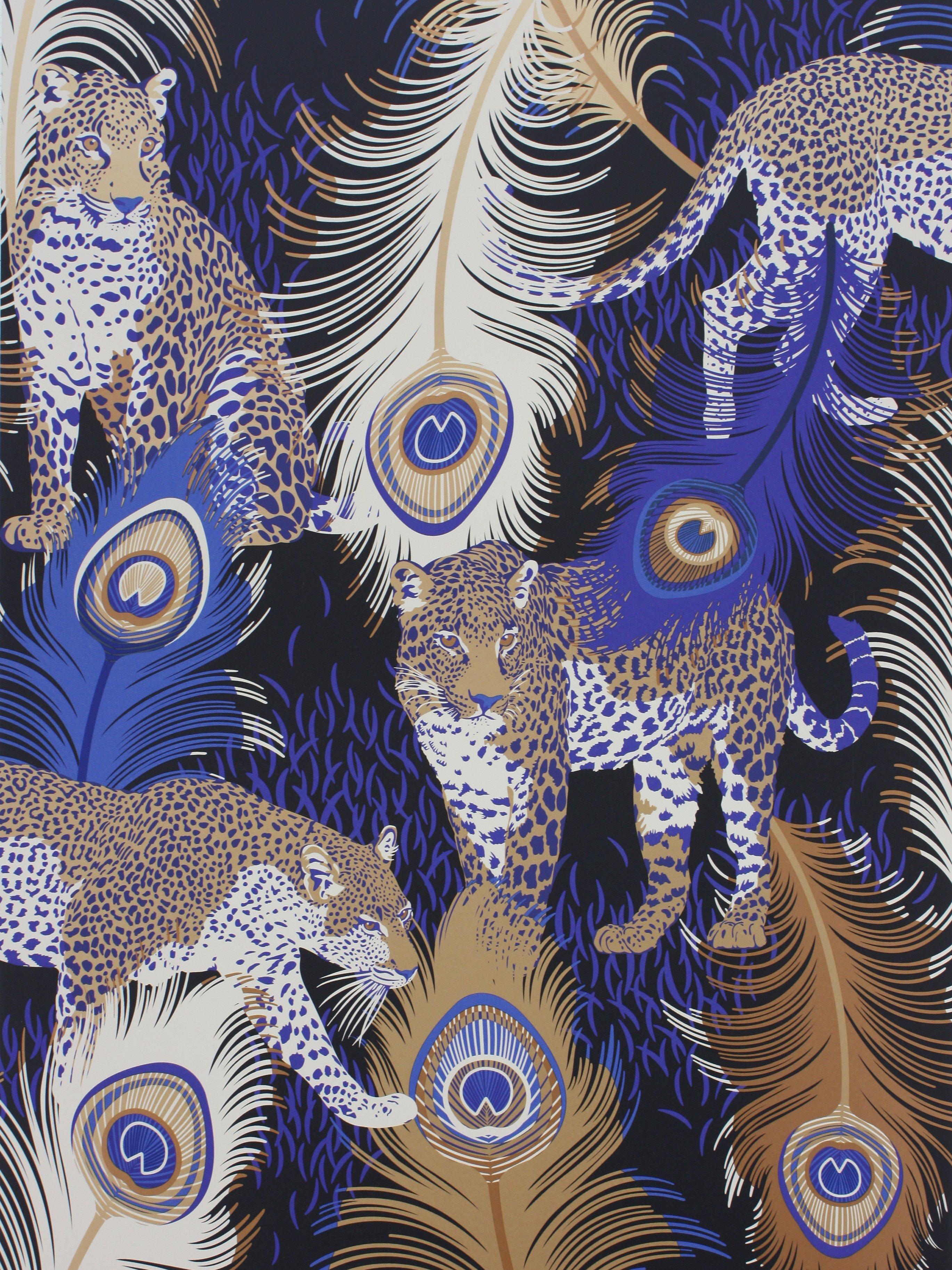 A fantastical composition of leopards stalking between peacock feathers.