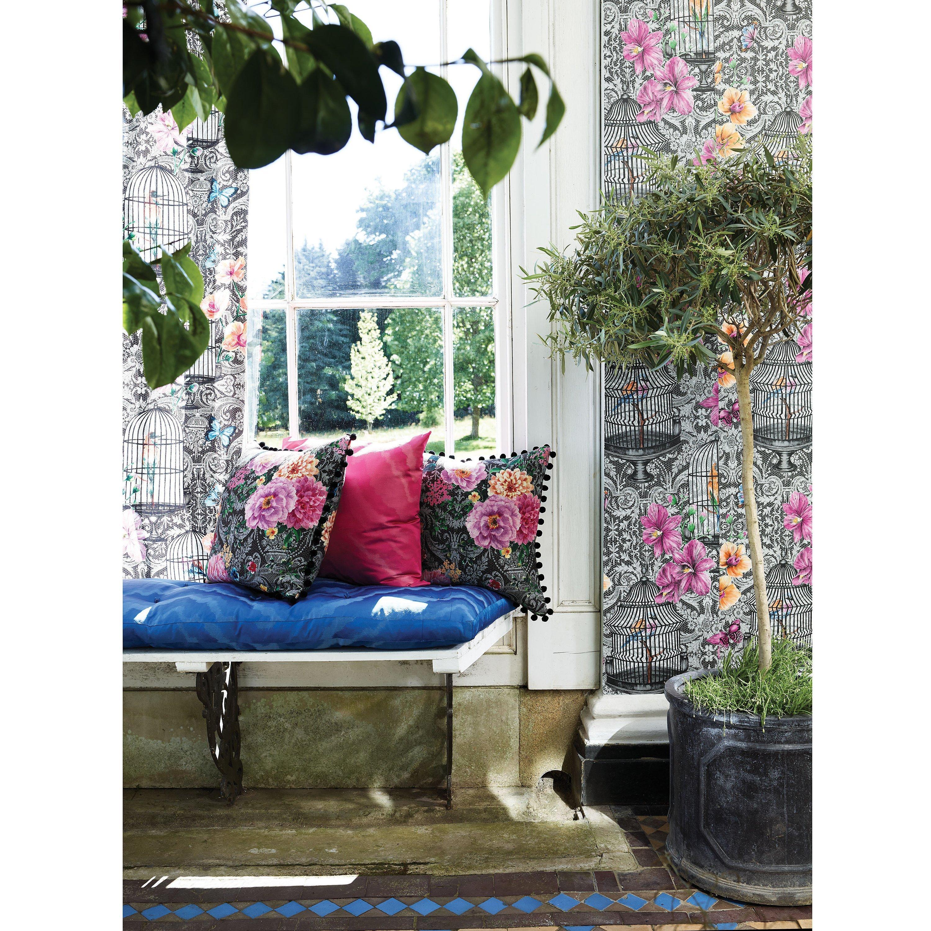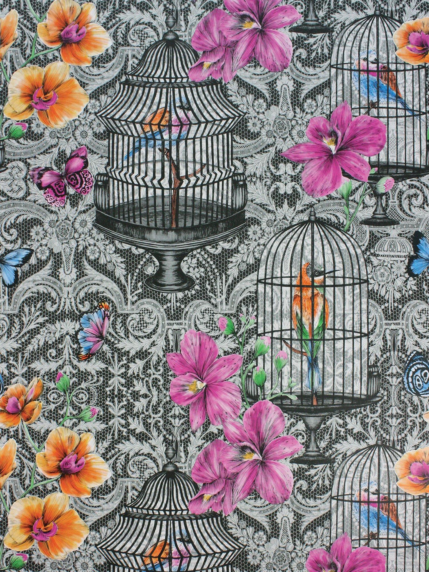 An arrangement of scattered orchids, butterflies and ornate birdcages on a contrasting monochrome lace pattern.