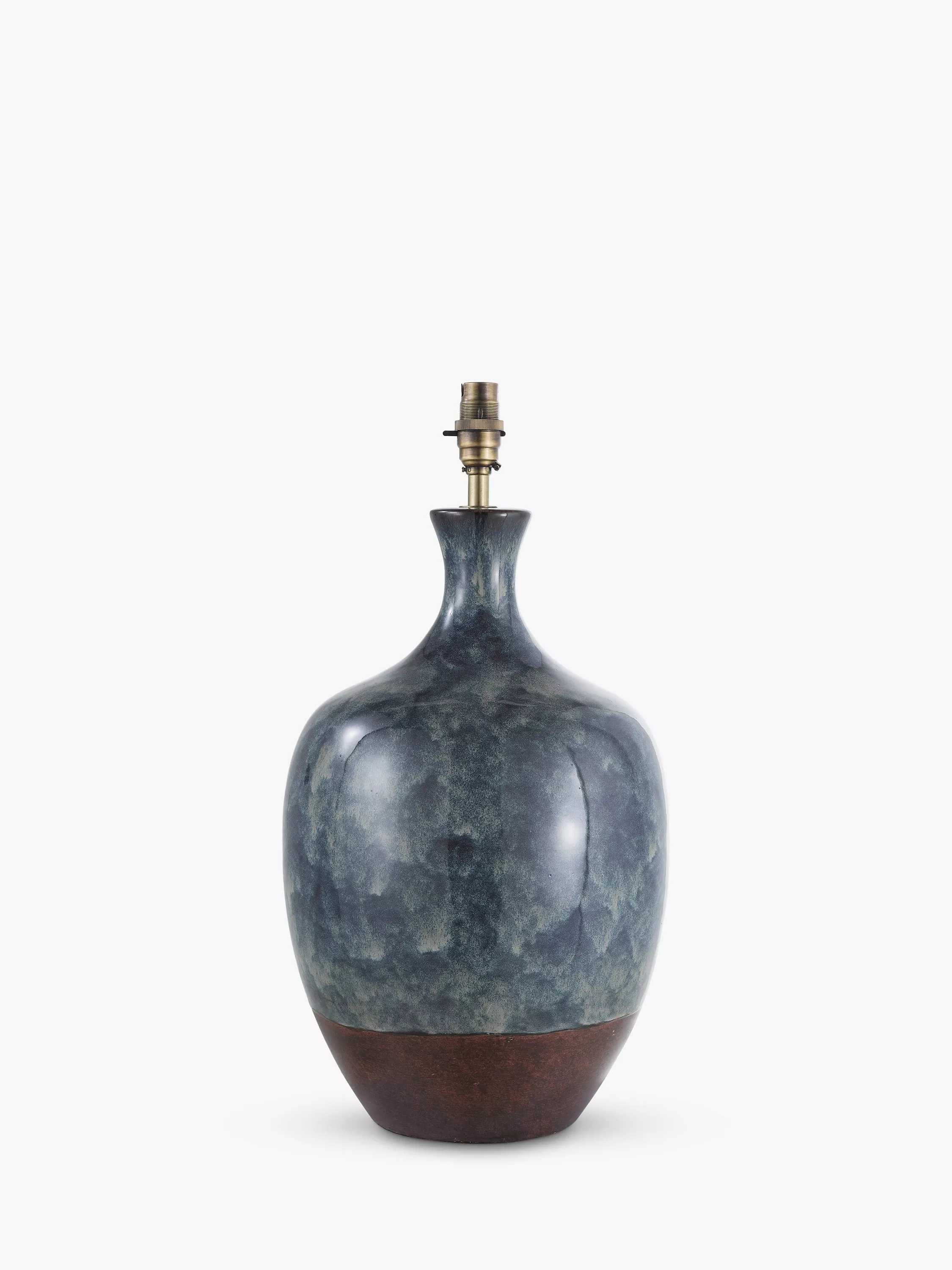 Bottle-shaped ceramic table lamp base with a striking reactive glaze pattern complemented by a terracotta-style glaze. The glaze creates distinctive yet subtle variations in tone and pattern, making each lamp base completely unique. Drips or air bubbles highlight the texture in its design, and its warm, fluid colouring draws the eye.