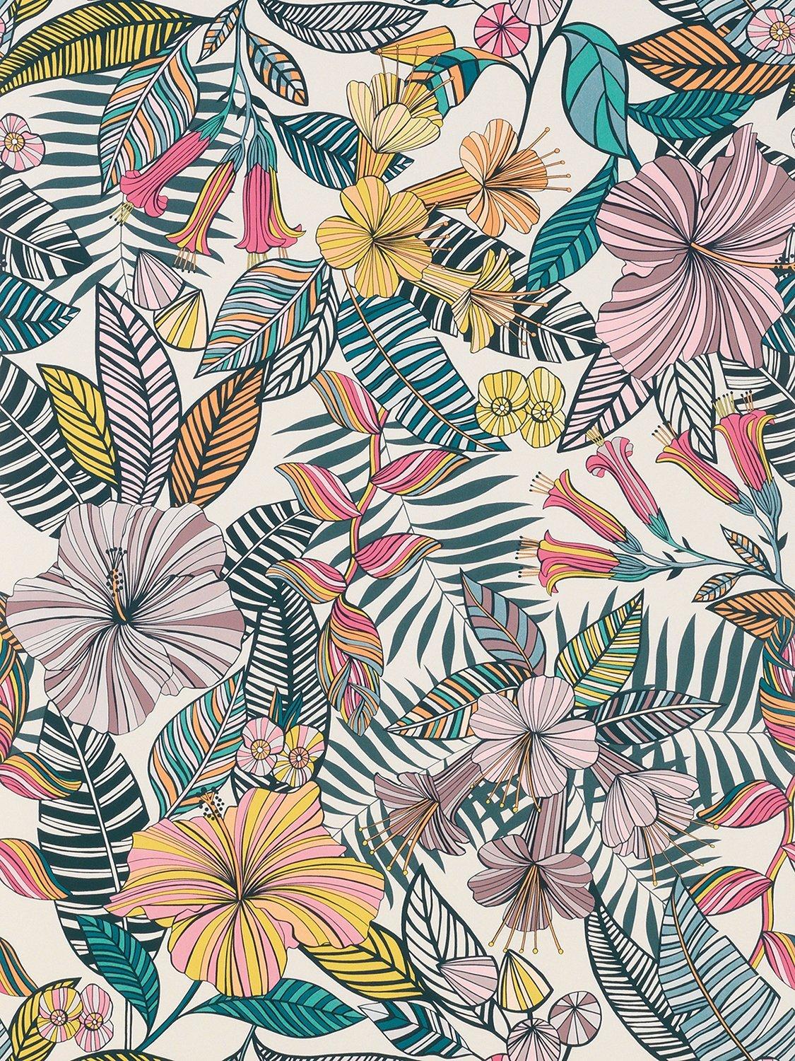 An all-over stylised composition of colourful flowers and contrasting striped leaves.