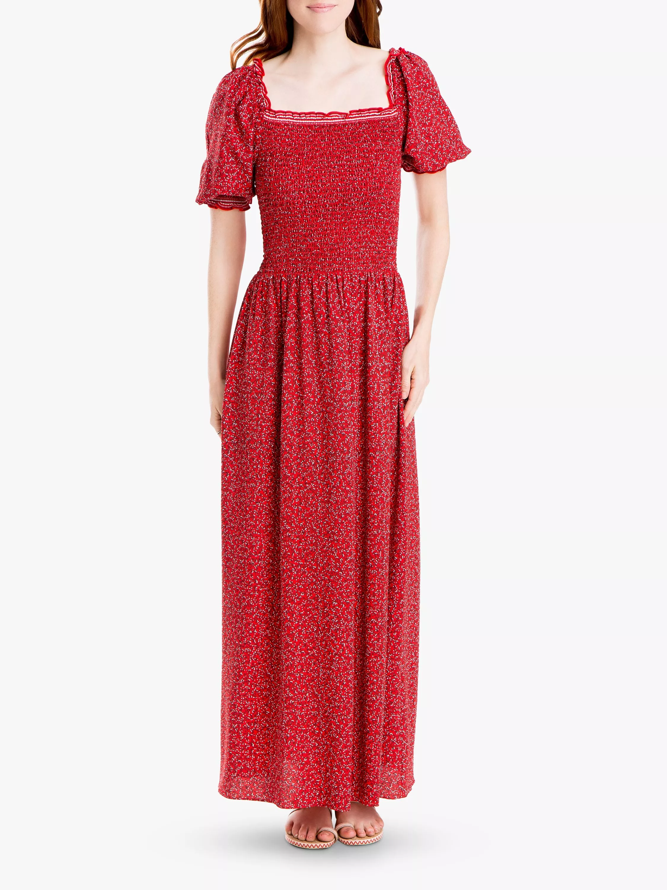 Dress is designed with a charming full length and covered in a small floral pattern. The ruffle detail enhances the feminine feel of the dress while the smocked bodice ensures the perfect fit thanks to its stretchy styling.