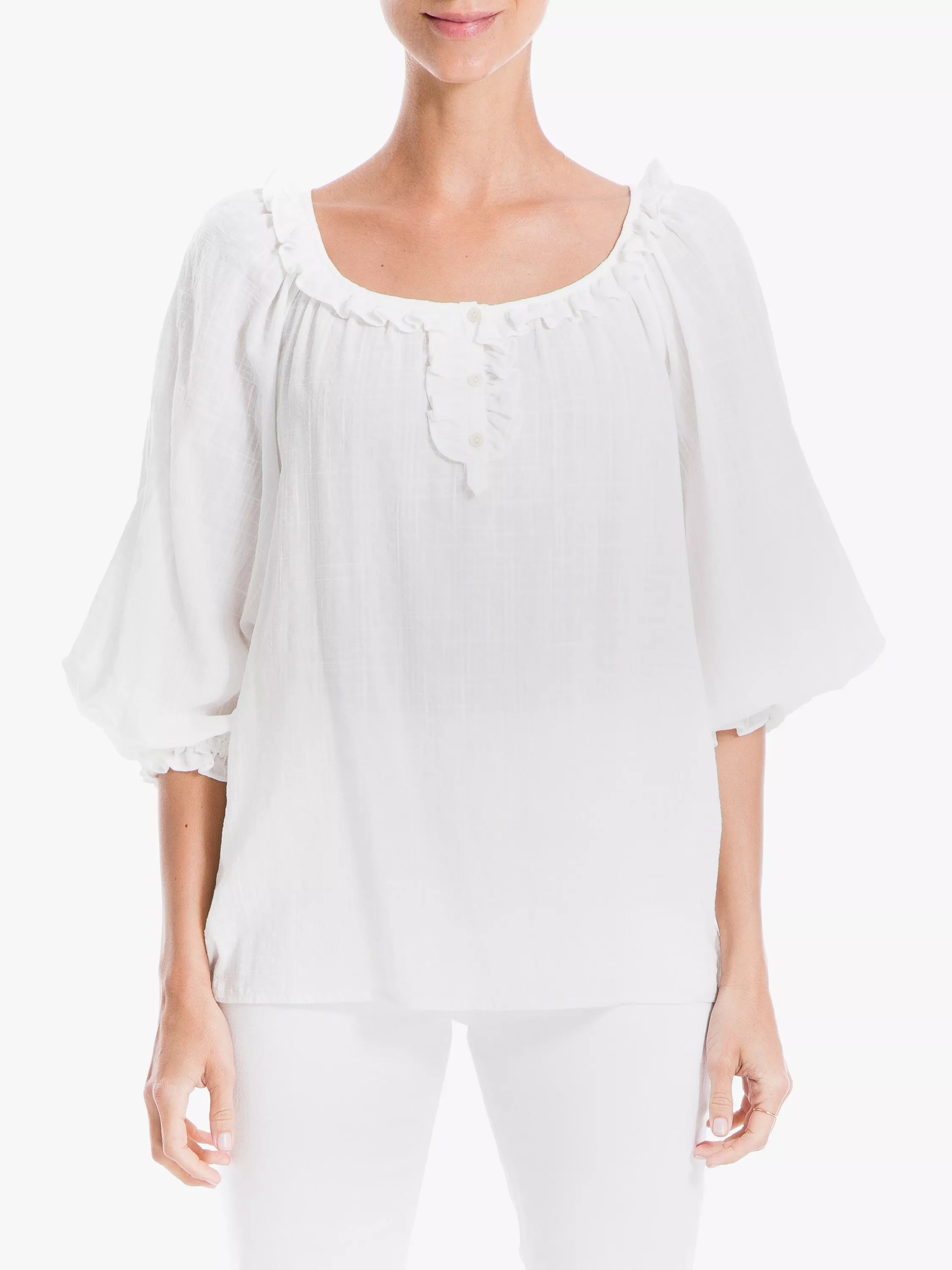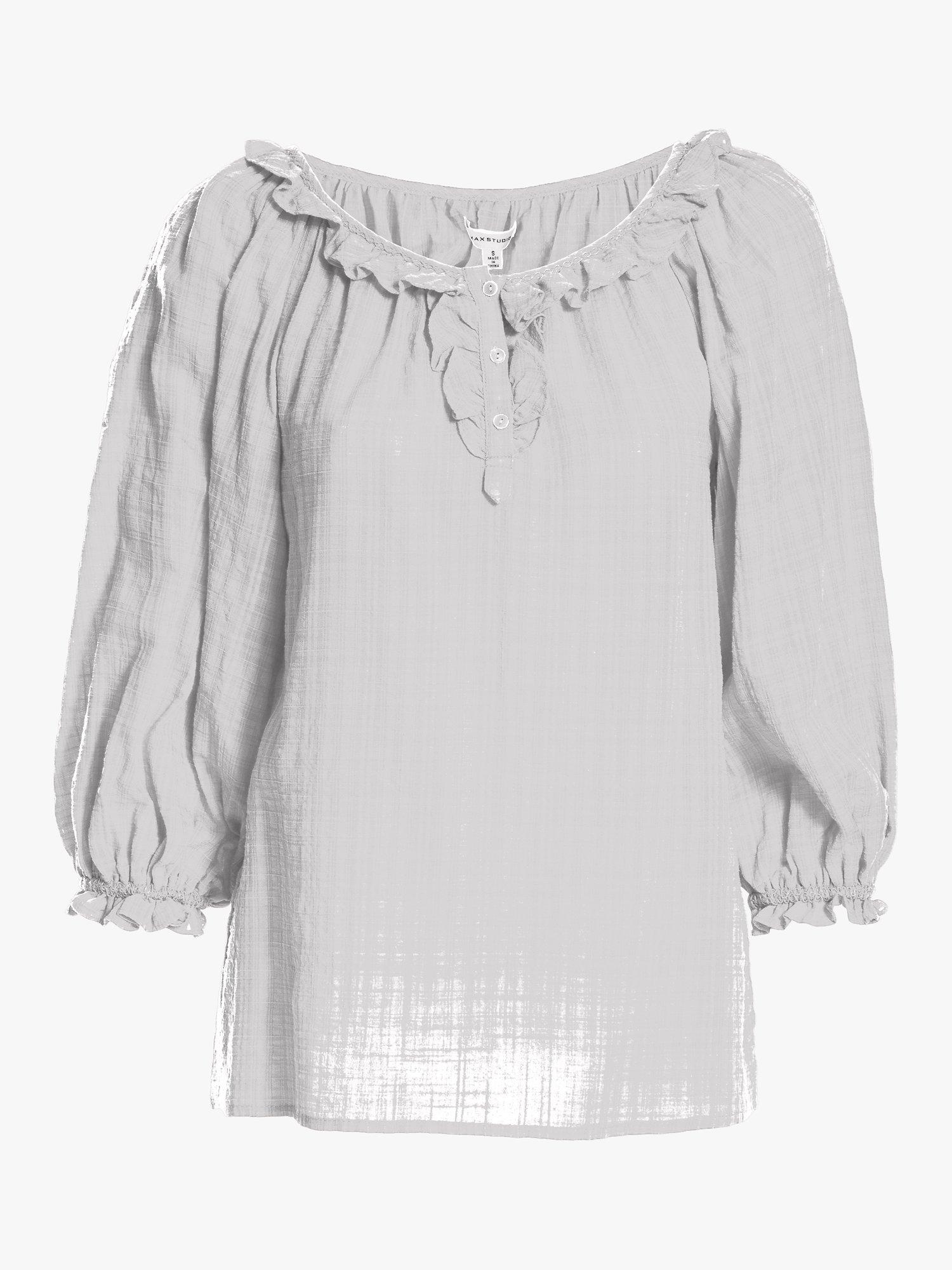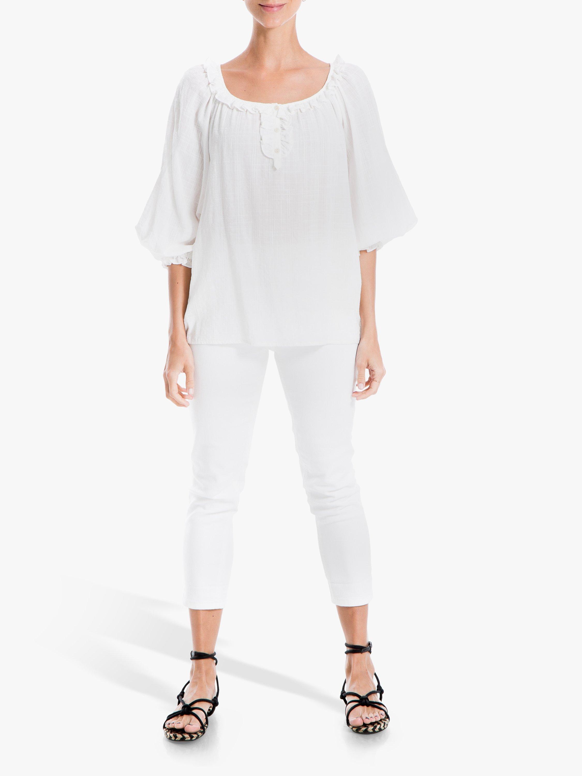 Light and delicate in soft cotton, this textured blouse from Max Studio is perfect for slipping on with cropped jeans and sandals. It's detailed with frills, a button pleat neckline and shirring through the cuffs to create a pretty blouson, gathered sleeve.