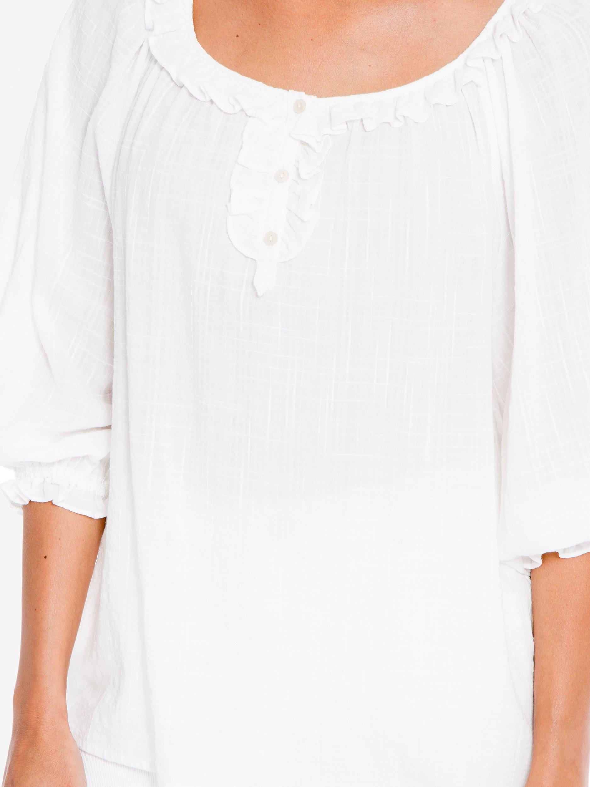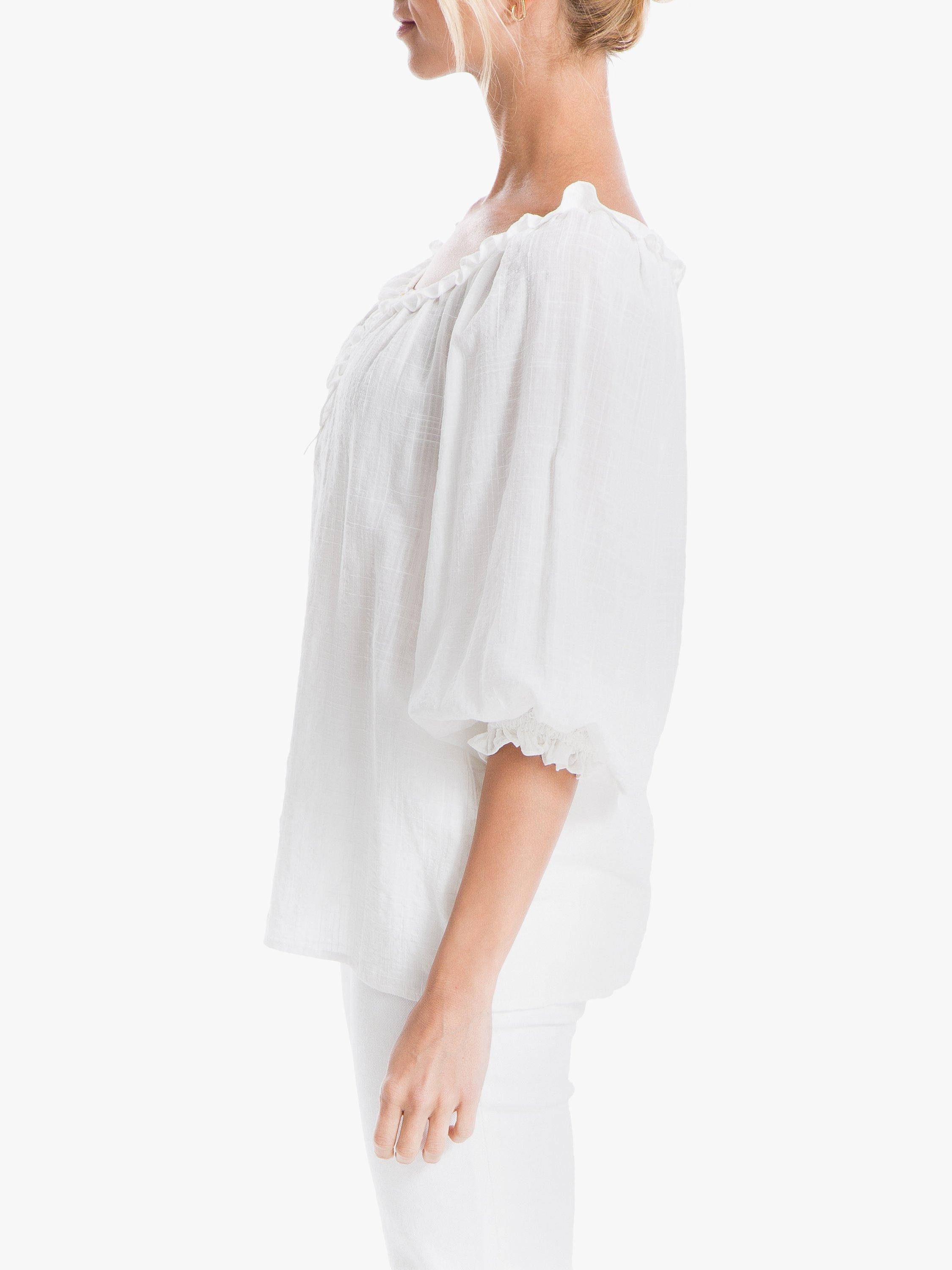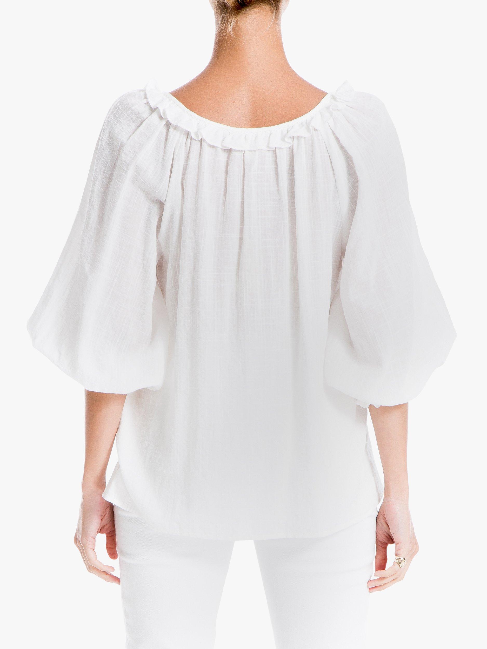 Light and delicate in soft cotton, this textured blouse from Max Studio is perfect for slipping on with cropped jeans and sandals. It's detailed with frills, a button pleat neckline and shirring through the cuffs to create a pretty blouson, gathered sleeve.