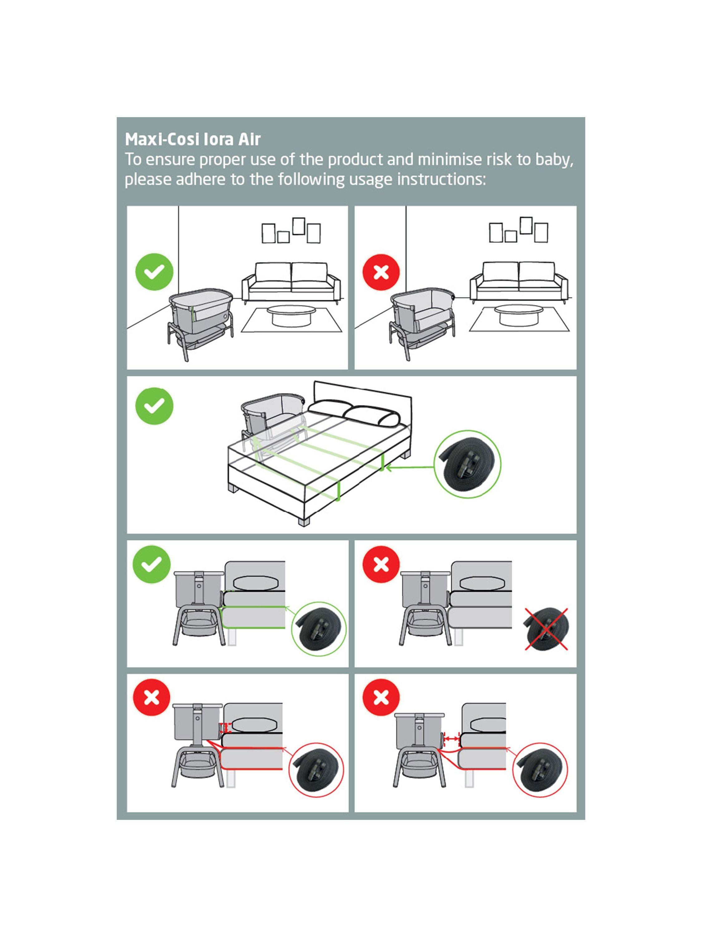 WARNING: The product should not be used before reading the instructions for use. The crib is not suitable for children who can sit or kneel or pull themselves up.