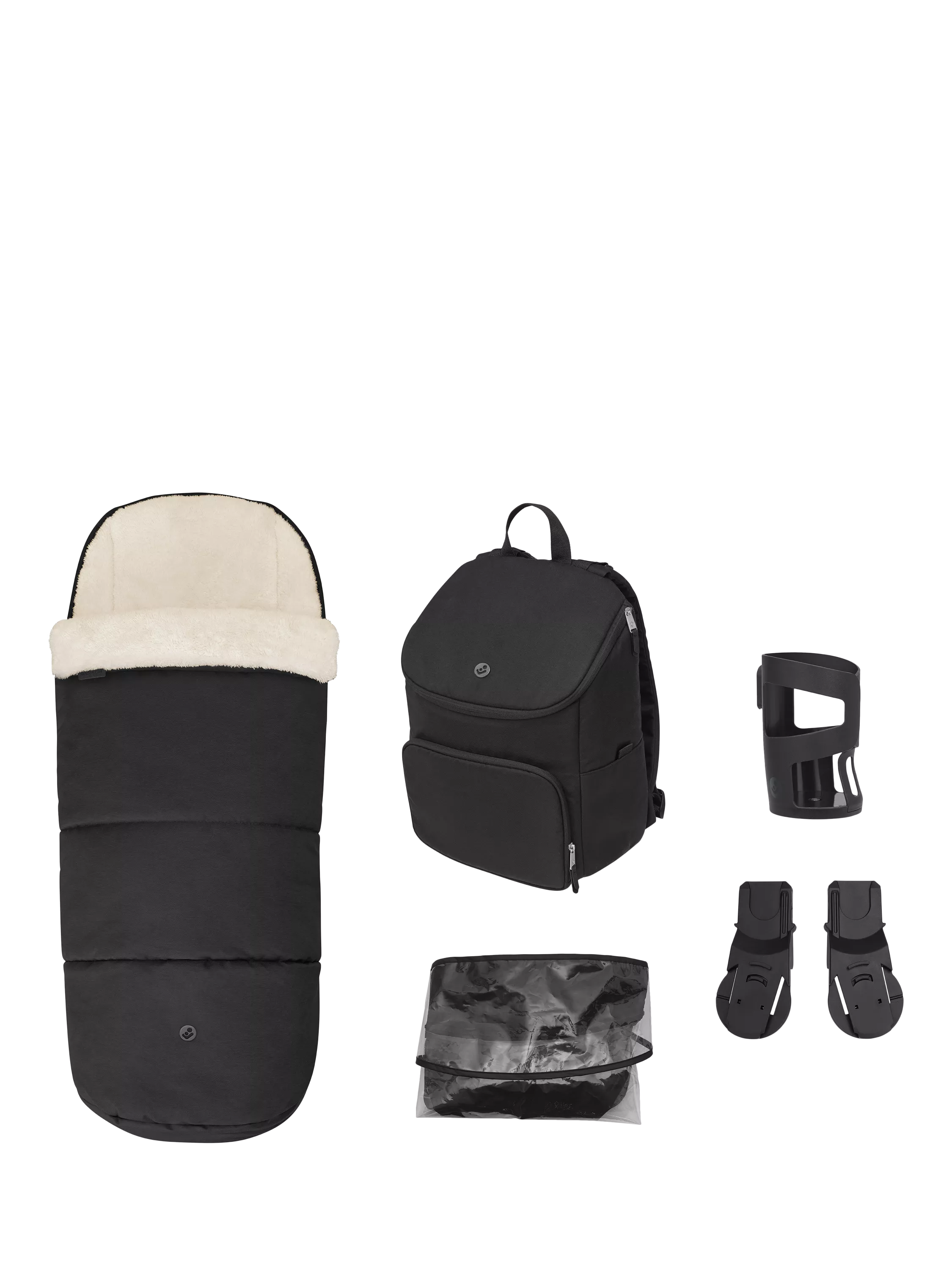 The Oxford Accessory set includes 5 essential accessories for outings with your little one, each designed to fit the Oxford pushchair. The 2-in-1 footmuff and rain cover keep them comfortable and protected, whatever the weather. While the nappy backpack, cup holder, and baby car seat adapters make getting around easier than ever.