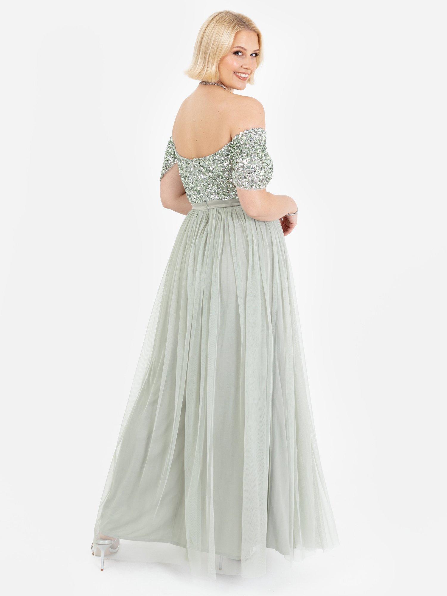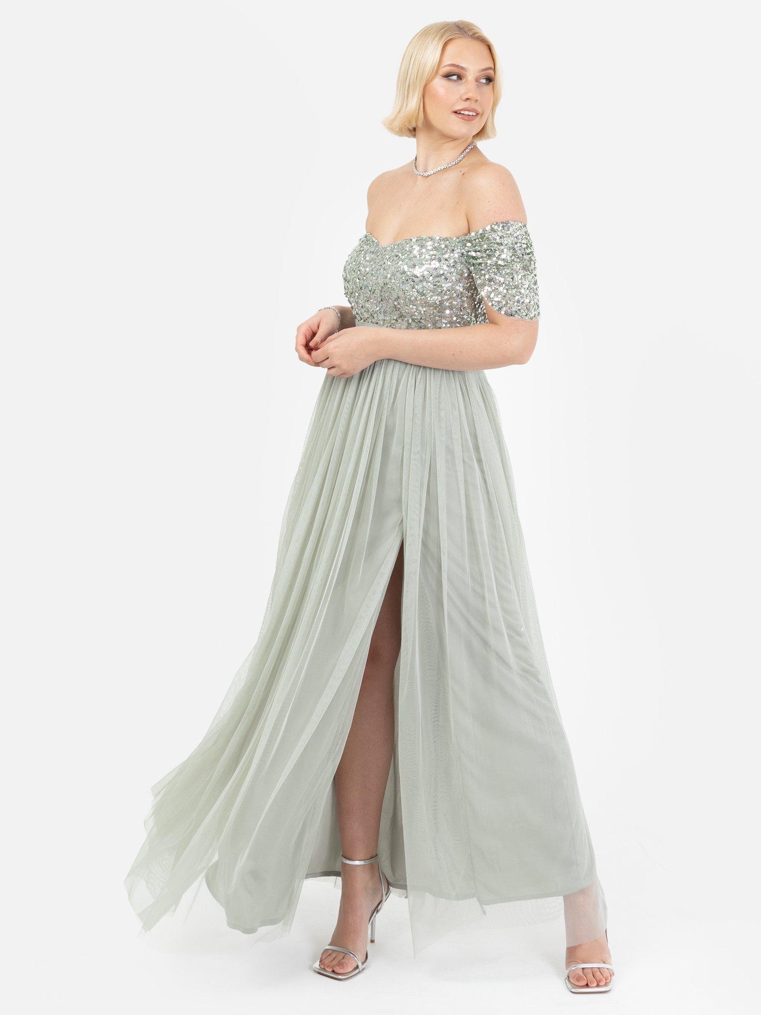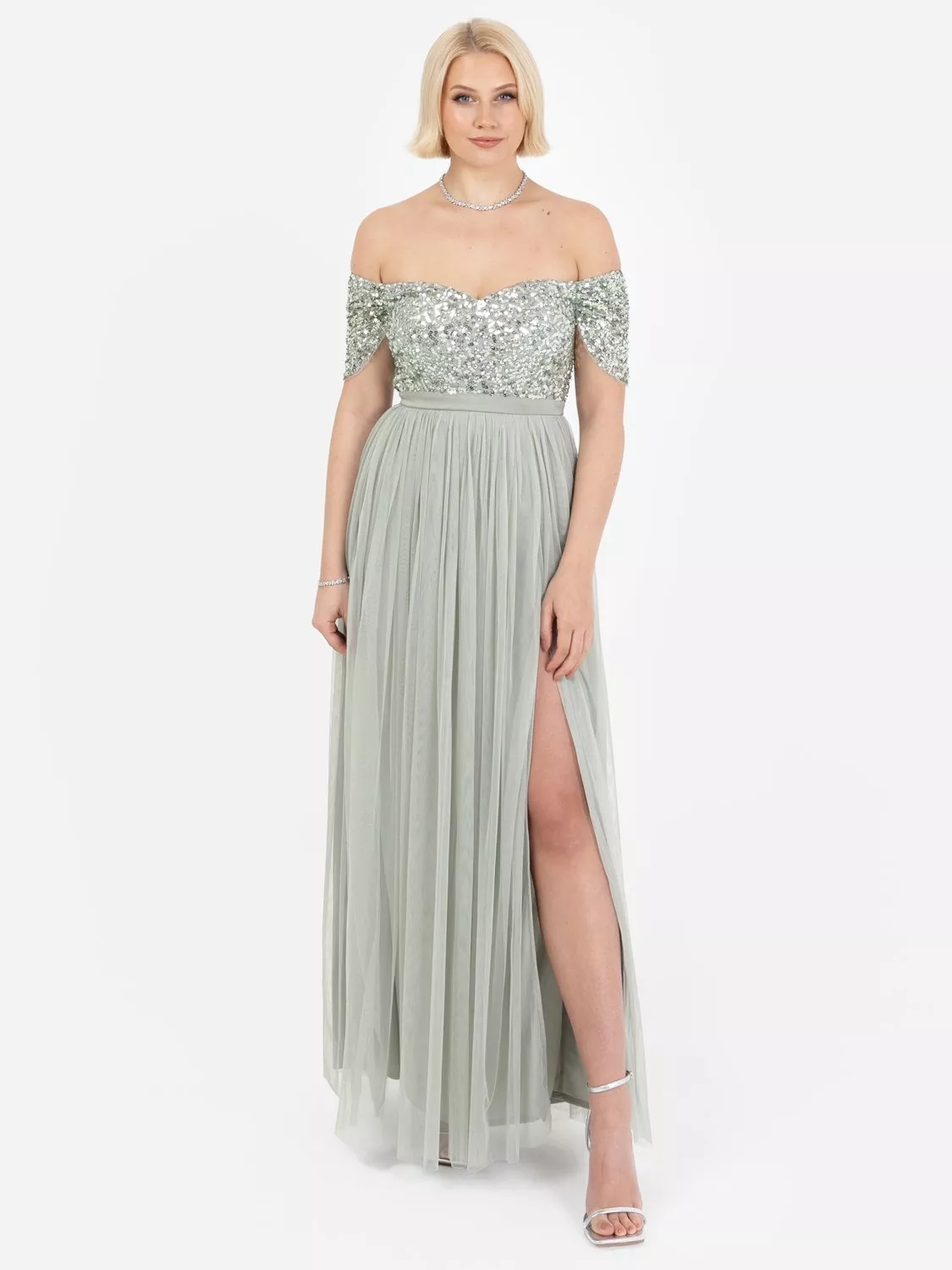 If you're looking to capture the onlooker's gaze at your next event, this off-the-shoulder maxi is the perfect choice. Its embellished bodice adds a shimmering touch while the sweetheart neckline and off the shoulder short sleeves form a dramatic yet glam finish. A satin waistband defines the waist allowing the maxi skirt to cascade gracefully into an A-line silhouette. Complete the look by pairing this thigh-high split maxi dress with strappy heels and a silver clutch bag.