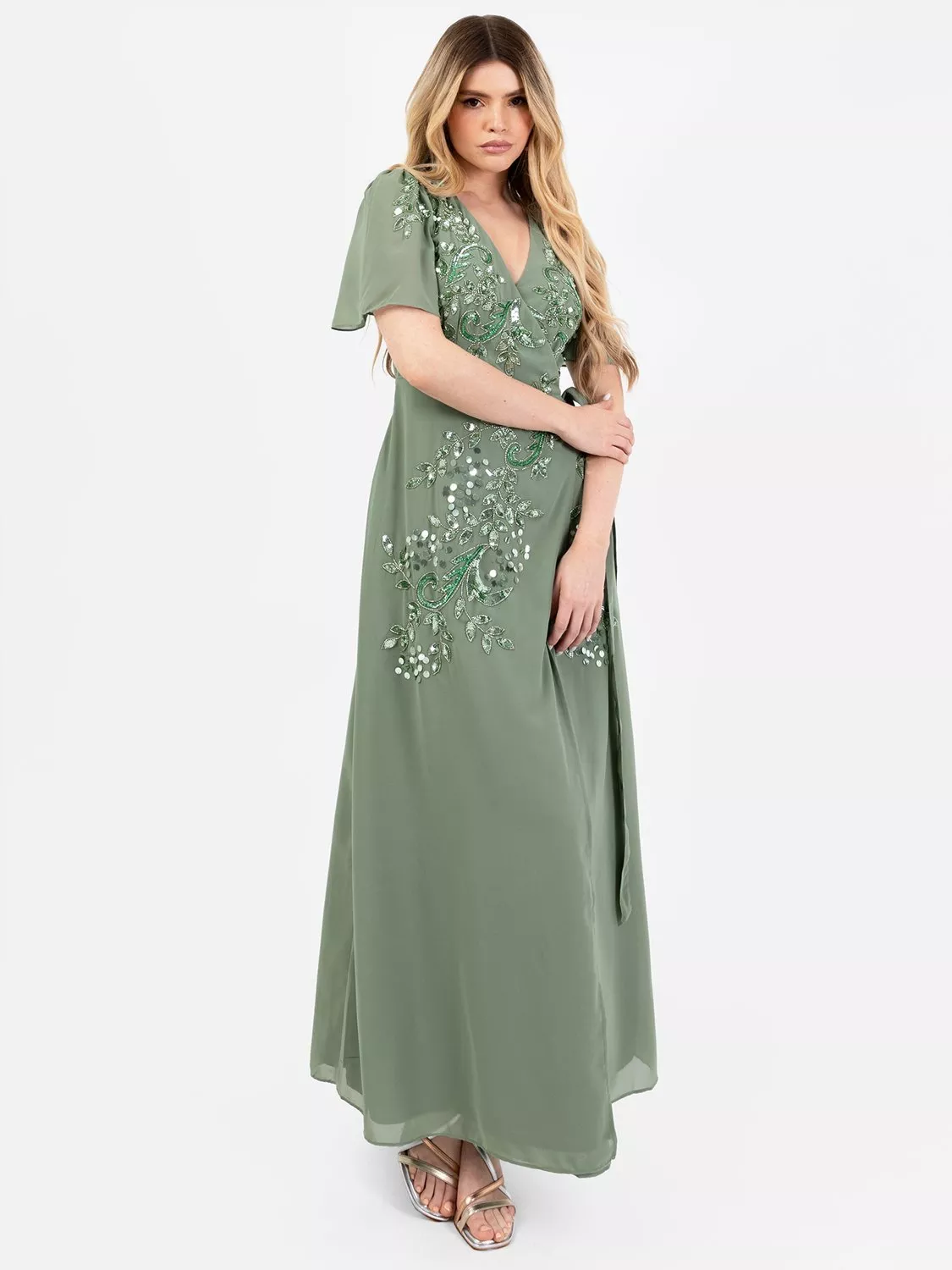 Elevate your special occasion wardrobe with this chiffon maxi dress from Maya Deluxe. On-trend wrap silhouette with short angel sleeves and mesmerising leaf embellishments work together to create an unforgettable ensemble. Pair with silver strappy heels and a shimmering clutch for a touch of glamour that commands attention.