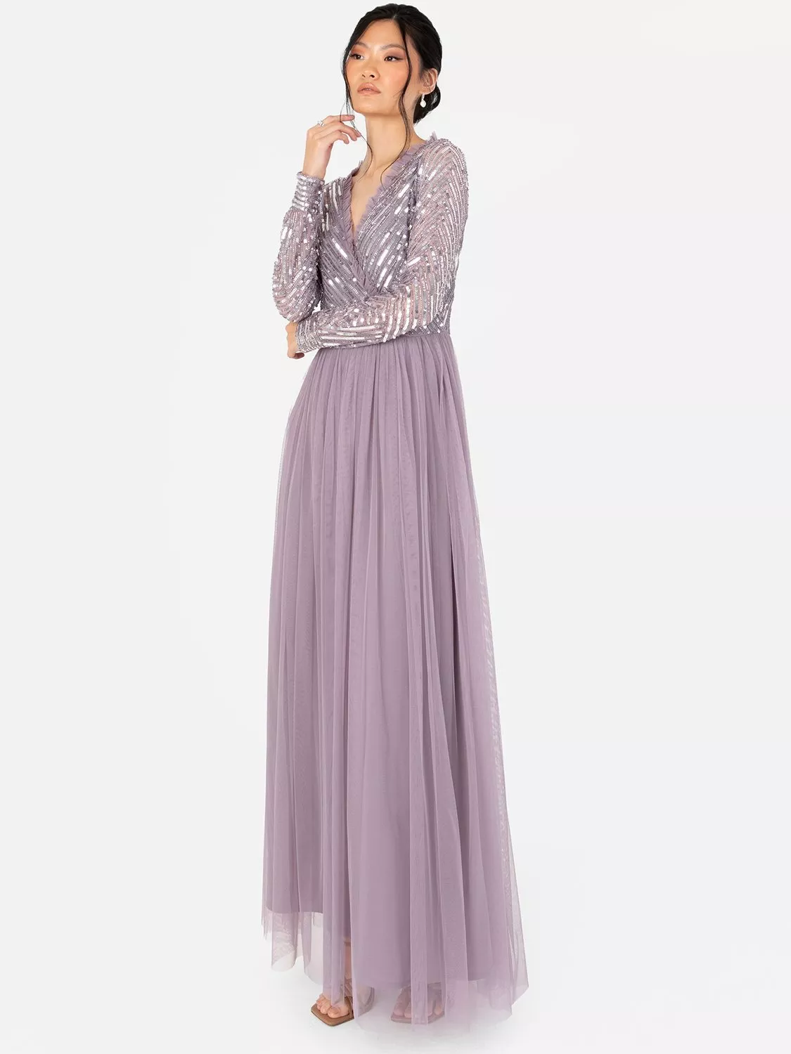 Crafted with precision and attention to detail this dress is made for formal events black tie weddings and other special occasions. The shimmering bodice offers a flattering yet modern look with its precisely placed stripe embellishment that follows the faux wrap bodice and long sleeve lines. Feminine frill detail on the neckline brings a soft romantic aesthetic to the dress. The flattering silhouette is accomplished by a cinched waist and gently ruffled hem that gracefully skims the parquet. Style this maxi gown with Silver strappy heels and a sleek low bun.