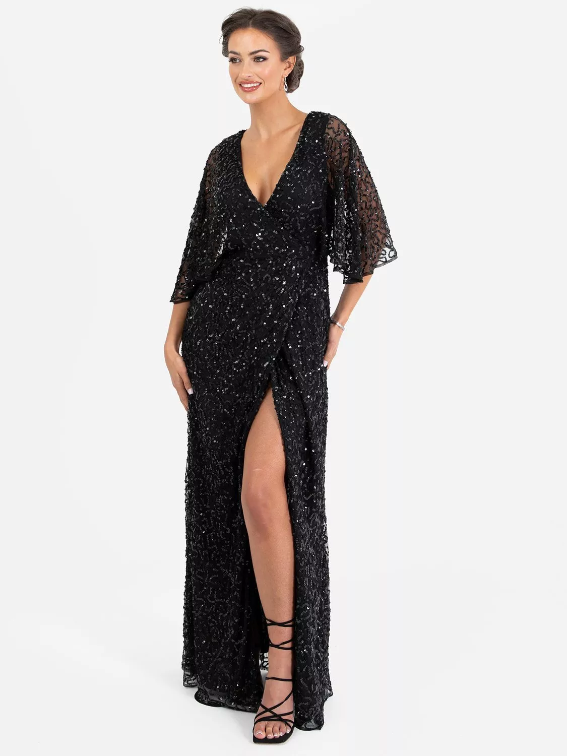 Made only for the finest events this maxi gown evokes romanticism and sophistication all in one. Its faux wrap design creates a sleek silhouette focusing on a cinched waist daring V Neckline and a dramatic split of the maxi skirt. Hand sewn embellishment adorns the tulle overlay that forms adventurous short sleeves on the fitted bodice. Style this shimmering dress with a sleek up-do and black strappy heels.