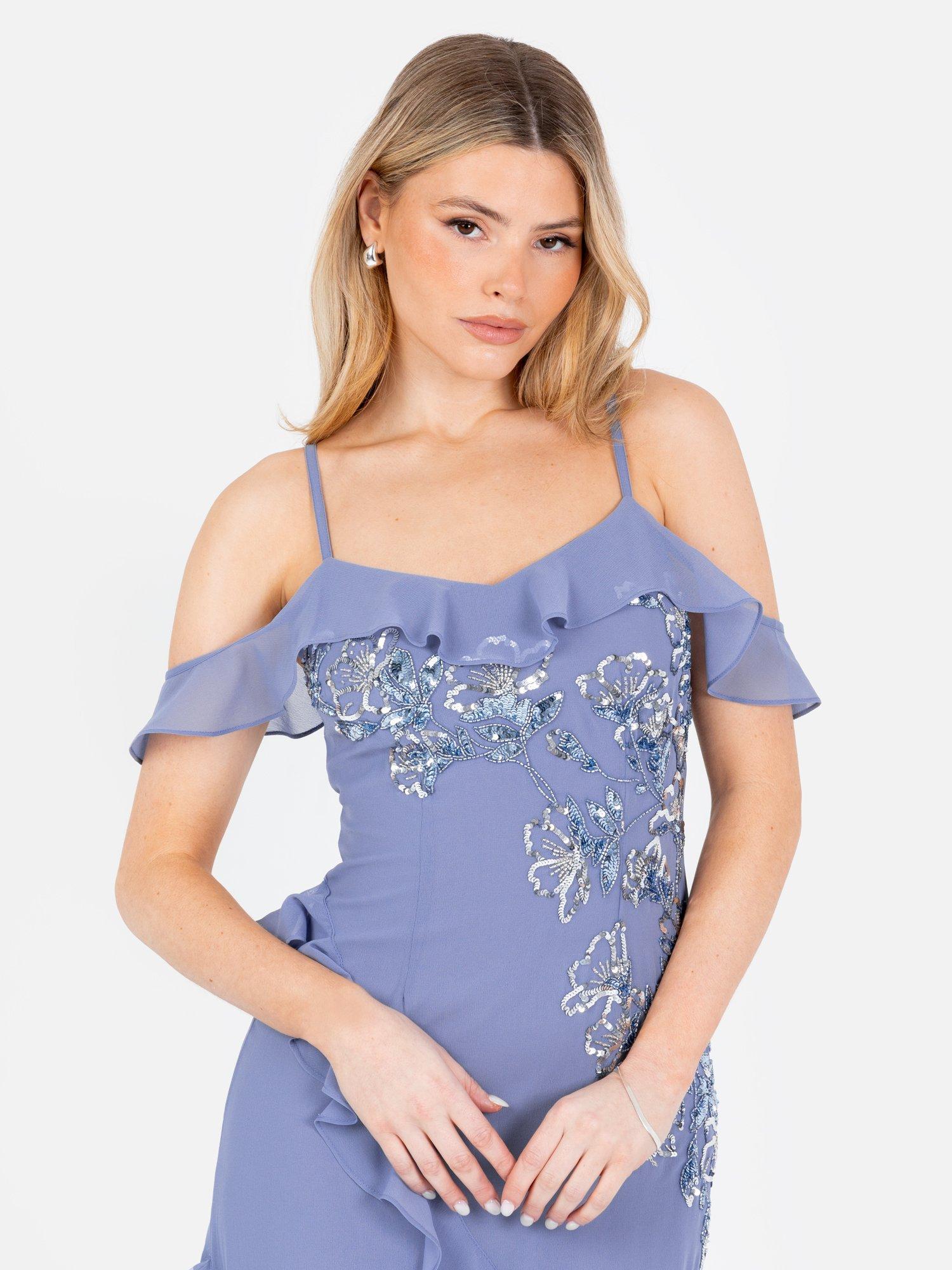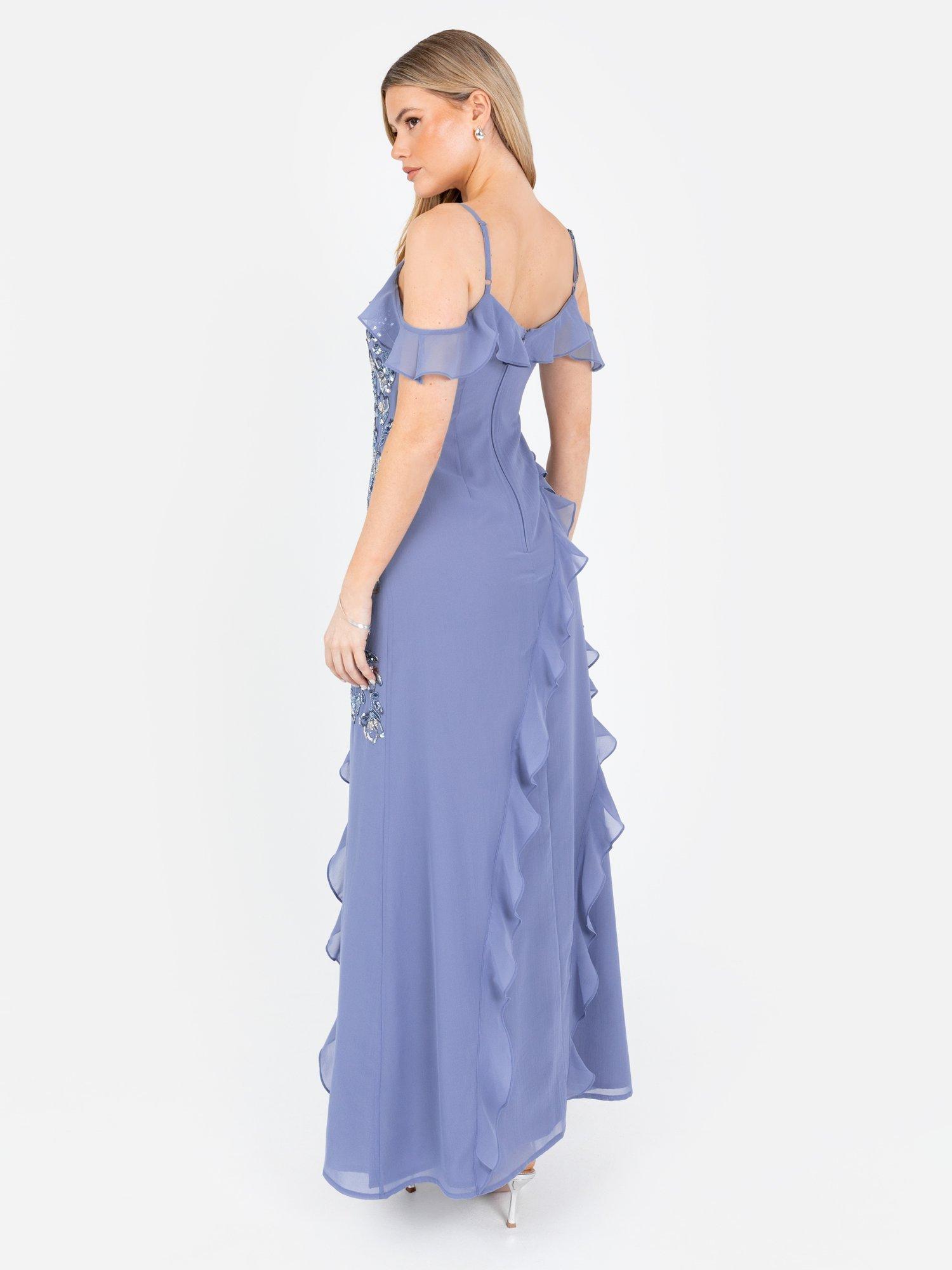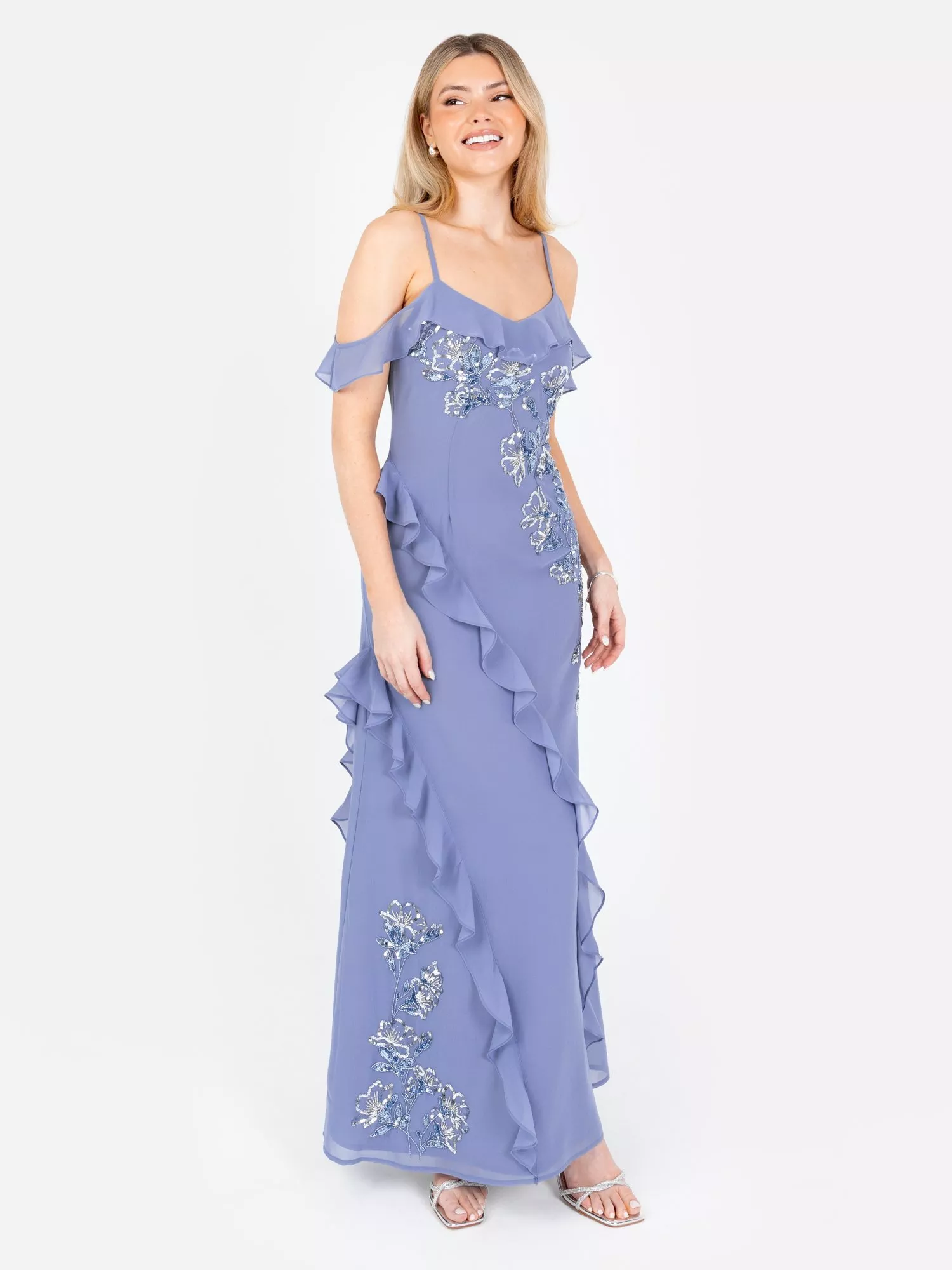 Exuding romance and refinement, this breathtaking gown is a true statement of contemporary style. Designed with a cold-shoulder bodice, it features delicate adjustable straps for the perfect fit, while dainty ruffles gracefully frame the neckline and cascade into soft, fluttering sleeves for an effortlessly feminine touch. Intricately hand-sewn floral embellishment flows seamlessly from the bodice to the hip, accentuating the silhouette with a radiant allure. Following this elegant detailing, cascading ruffle layers trace a diagonal line across the skirt, creating a fluid sense of movement with every step. Pair with silver heels and accessories for a look that captures the essence of modern glamour.