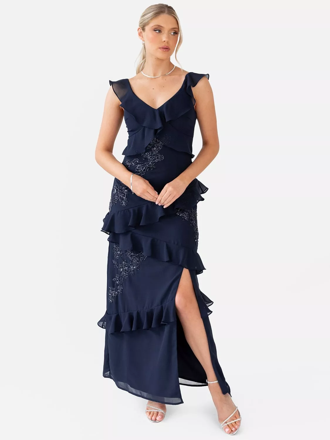 This elegant maxi dress features delicate floral embellishments and tiered ruffle accents that cascade from adjustable straps, crossing gracefully at the fitted bodice to create a flattering empire waistline. Asymmetric ruffles flow through the maxi skirt, adding soft movement and sophisticated charm. Perfect for the modern bridesmaid or any evening celebration, this gown pairs beautifully with silver heels and delicate jewellery for a refined look.
