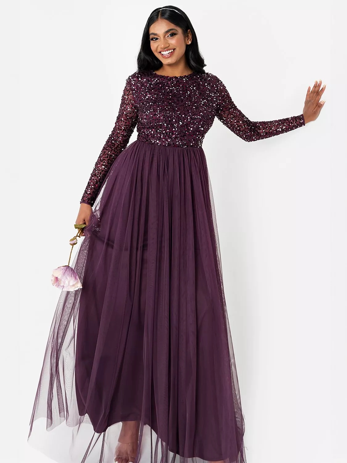 Feel elegant in this long sleeve maxi dress from Maya Deluxe perfect for autumn events. Matching hand sewn sequin embellishment is drenched over the fitted bodice and long sleeves that are layered with extra tulle fabric for comfortable wear. Featuring a chic boat neckline and a floor sweeping soft tulle skirt that flairs from the waist giving the dress a romantic finish This gown is one of our most popular styles for bridesmaids.