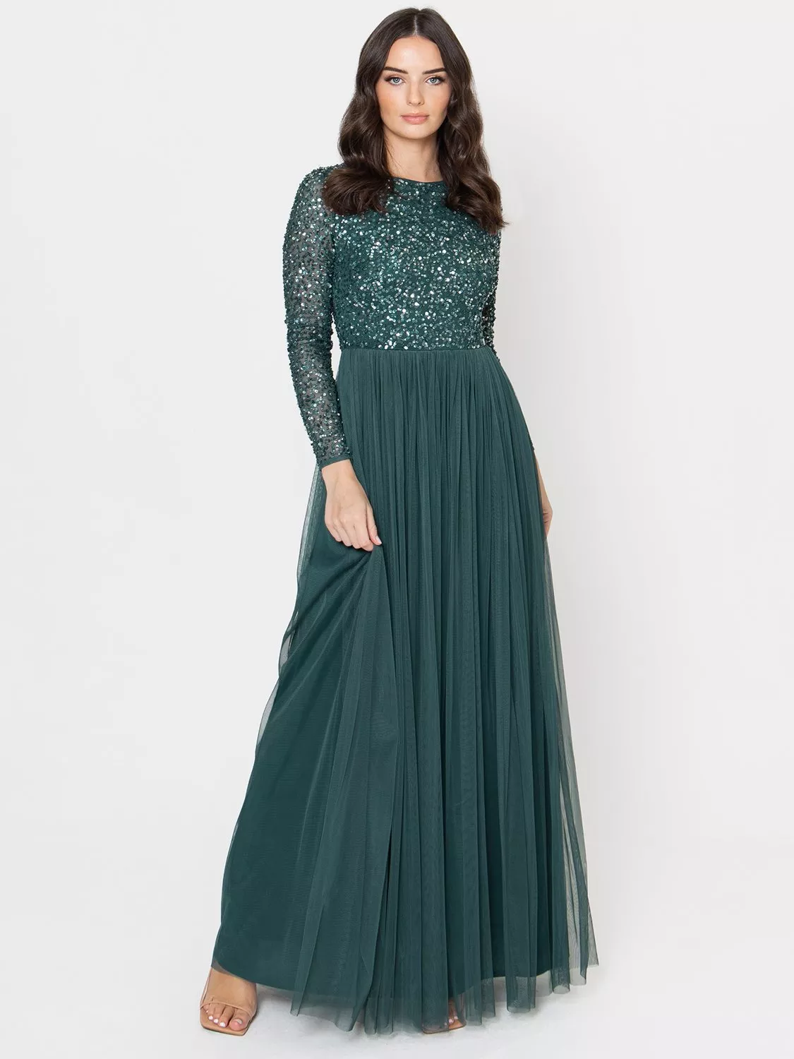 Feel elegant in this long sleeve maxi dress from Maya Deluxe perfect for autumn events. Matching hand sewn sequin embellishment is drenched over the fitted bodice and long sleeves that are layered with extra tulle fabric for comfortable wear. Featuring a chic boat neckline and a floor sweeping soft tulle skirt that flairs from the waist giving the dress a romantic finish This gown is one of our most popular styles for bridesmaids.
