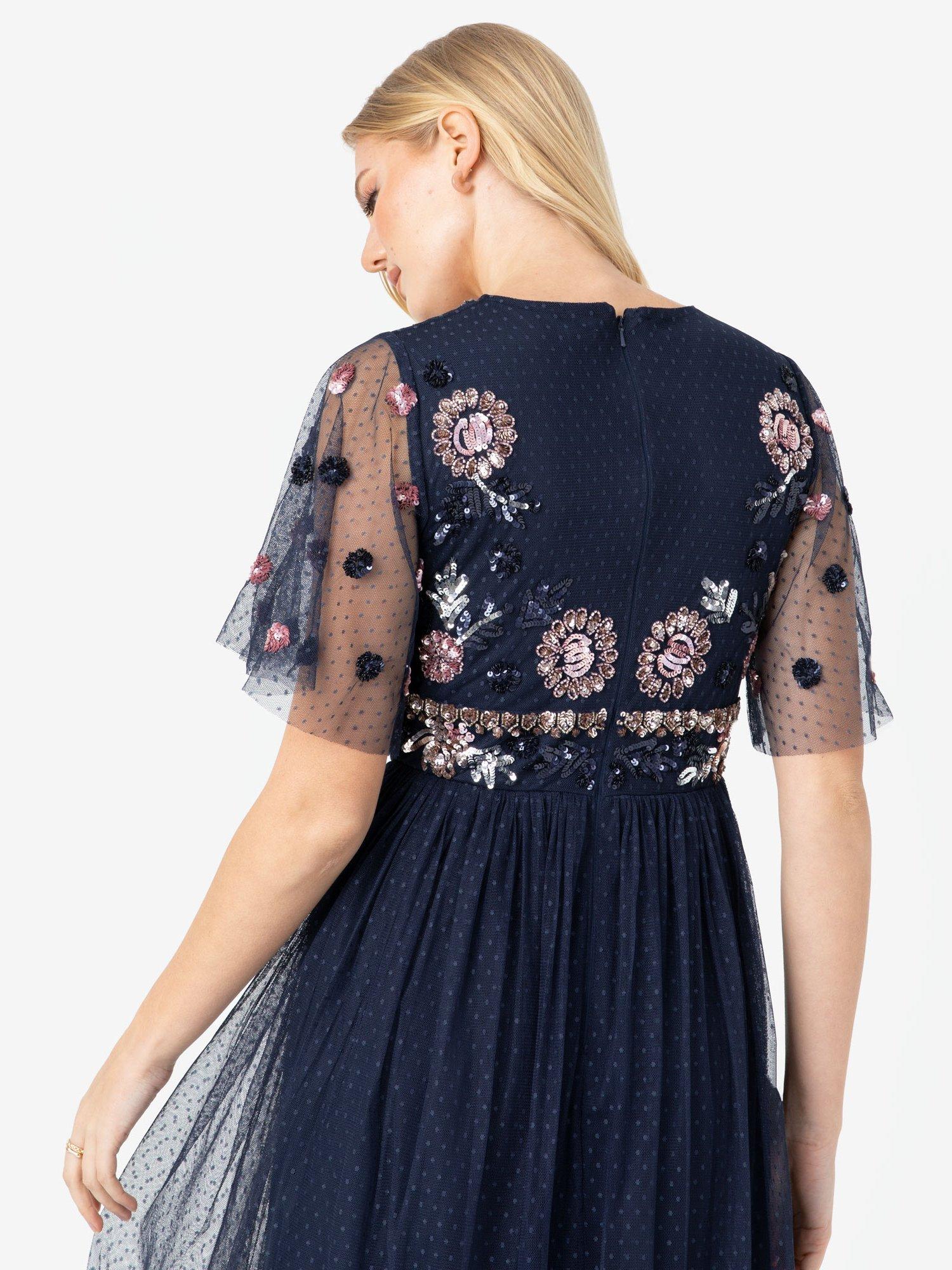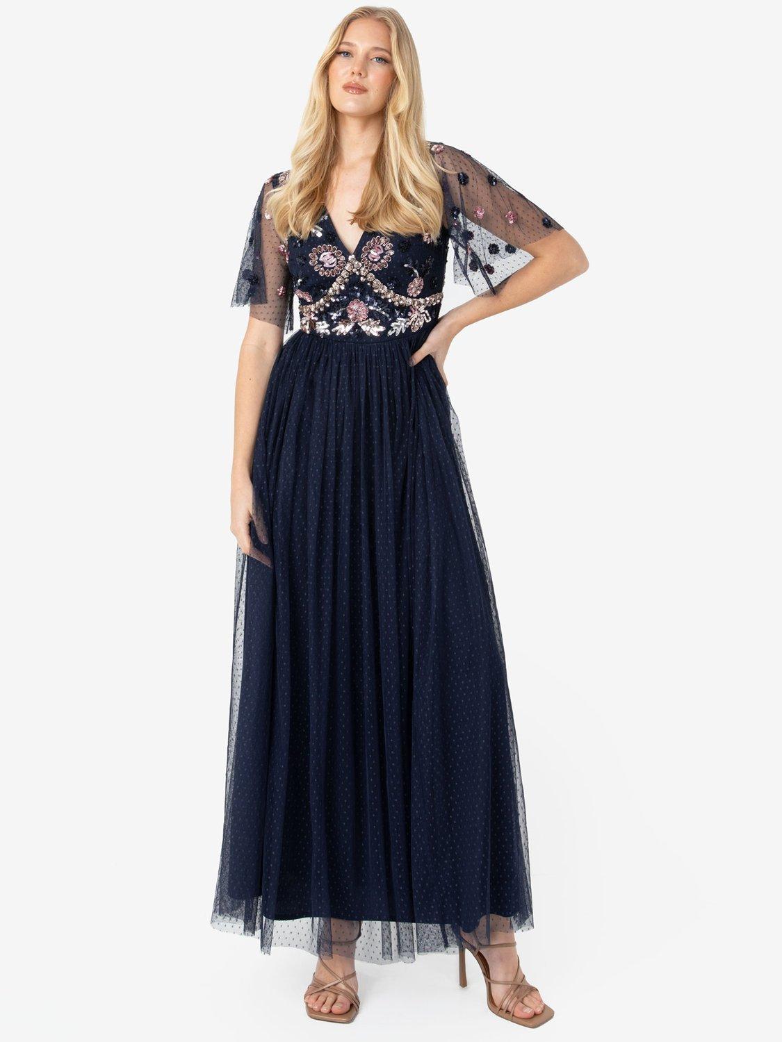 Renowned for their use of intricate embellishment and soft fabrics Maya designed yet another style that doesn’t fall far from spectacular. Meticulously placed sequin and beads form floral motifs that elegantly adore the V neck bodice and sheer short sleeves. Spot mesh tulle continues to fall into an A-line silhouette that’s comfortable for all body shapes leaving plenty of room for a midnight tango with your best friends. Its shade makes this maxi dress a versatile piece so you can wear it again and again Style with Pink accessories for a summer’s day wedding or gold shimmering jewellery for an evening soiree.