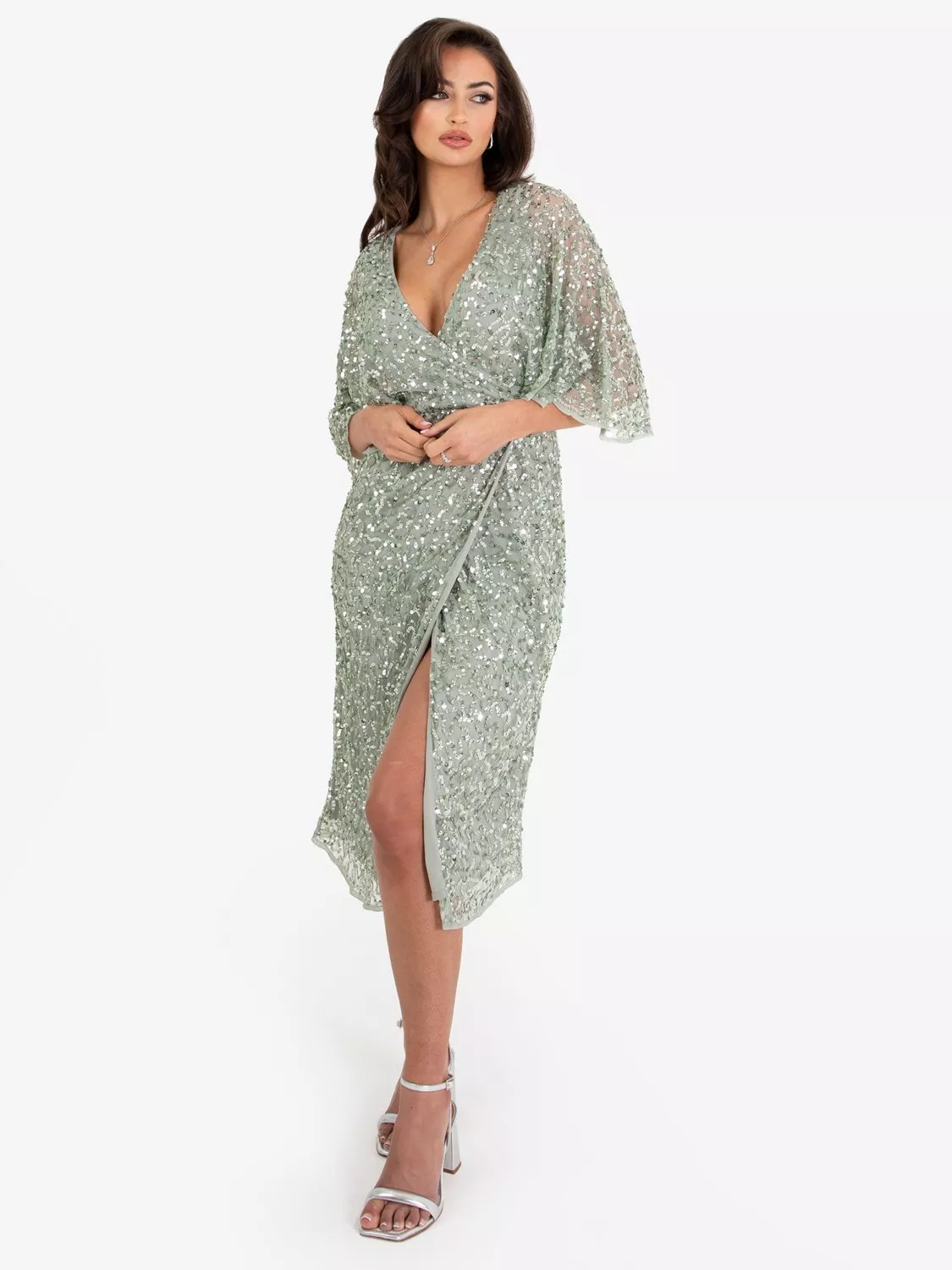 Made only for the finest events this little dress evokes romanticism and sophistication all in one. Its faux wrap design creates a sleek silhouette focusing on a cinched waist daring V Neckline and a dramatic split of the maxi skirt. Hand sewn embellishment adorns the tulle overlay that forms adventurous short sleeves on the fitted bodice. Style this shimmering dress with Hollywood waves and black strappy heels.